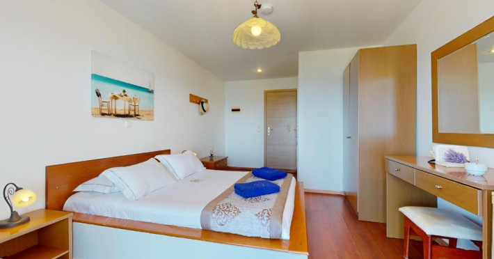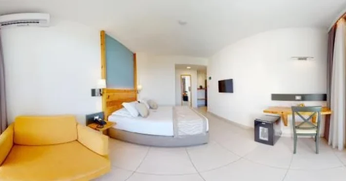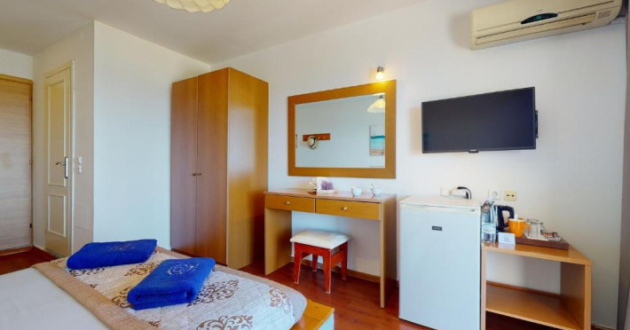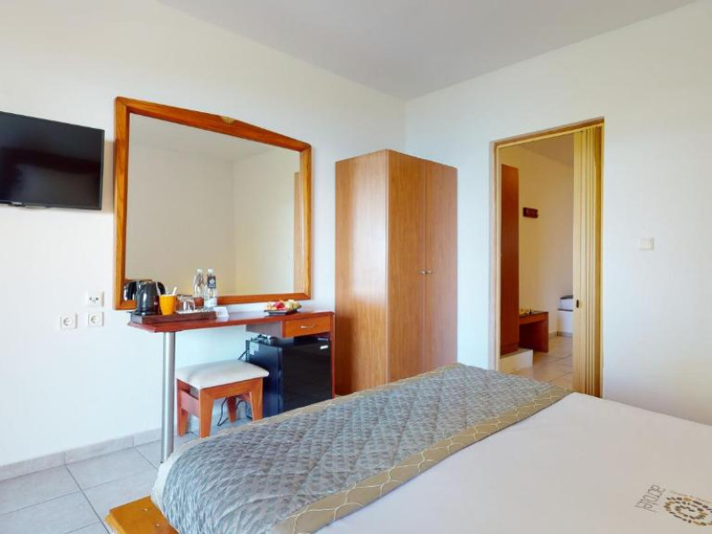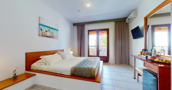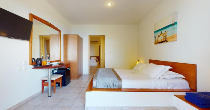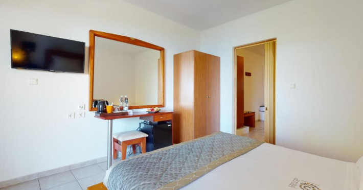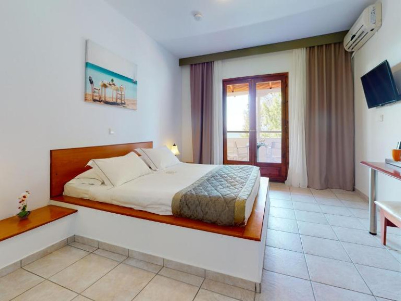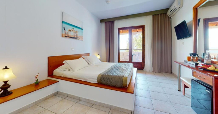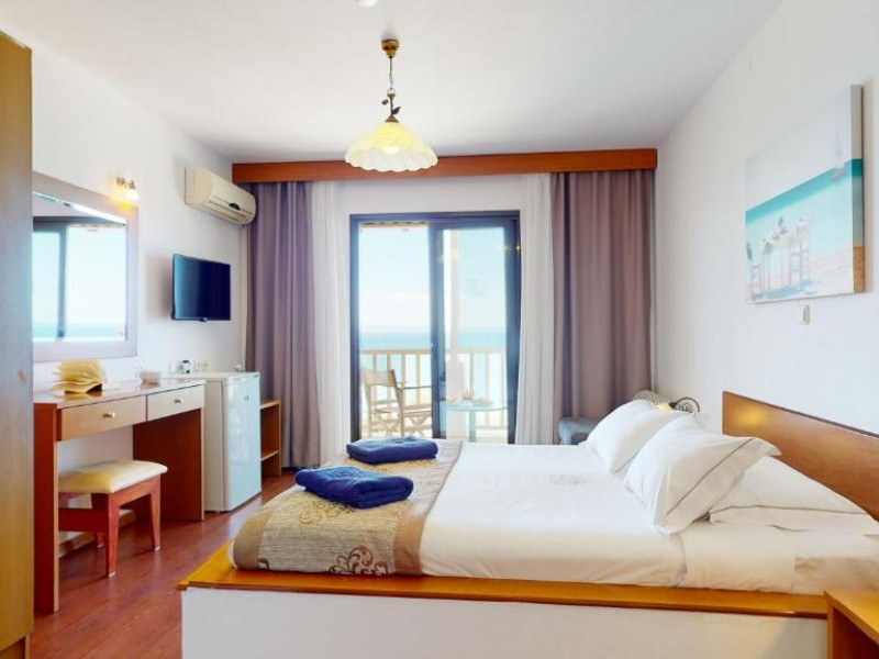 Camerele luminoase și confortabile sunt decorate in nuanțe mediteraneene și dispun de balcoane sau terase cu vedere spre mare sau grădină. Facilitățile principale includ piscină exterioară cu secțiune pentru copii, restaurant principal cu preparate grecești și internaționale, bar la piscină și lobby bar.