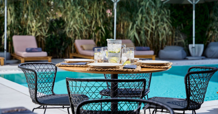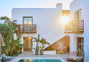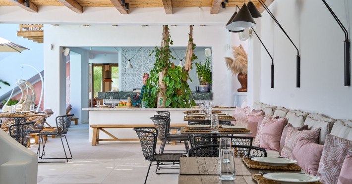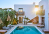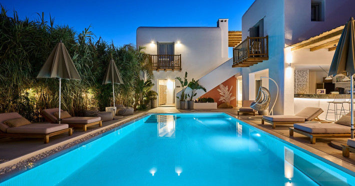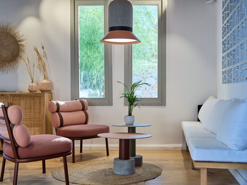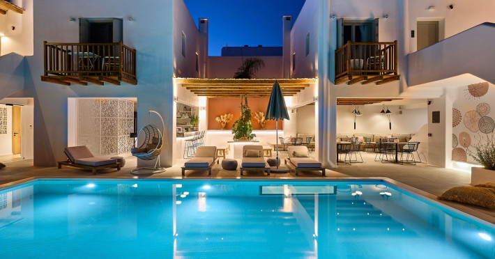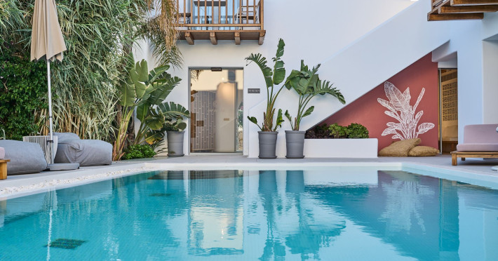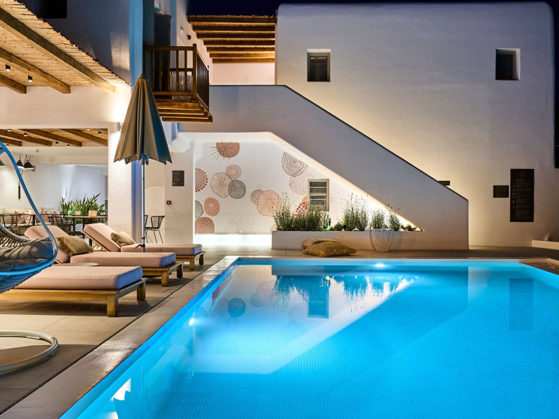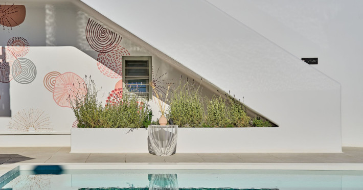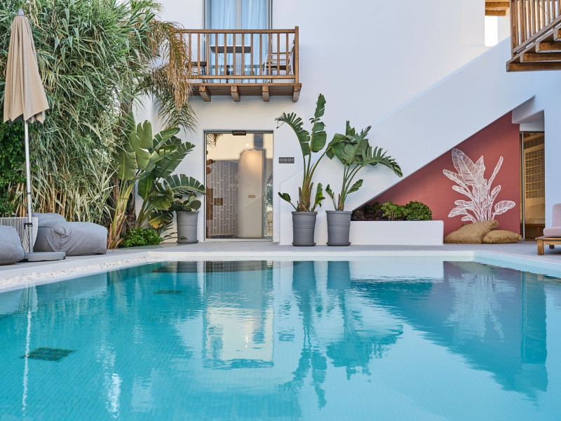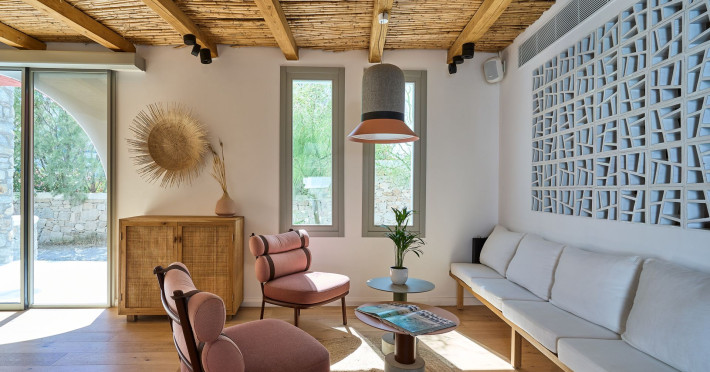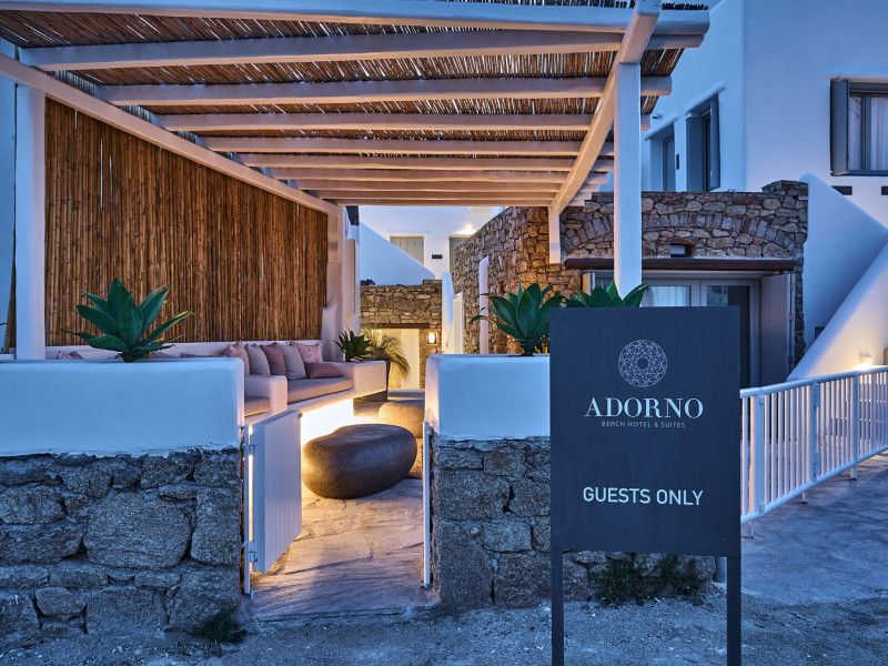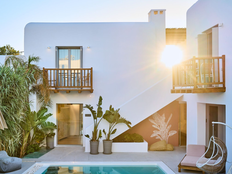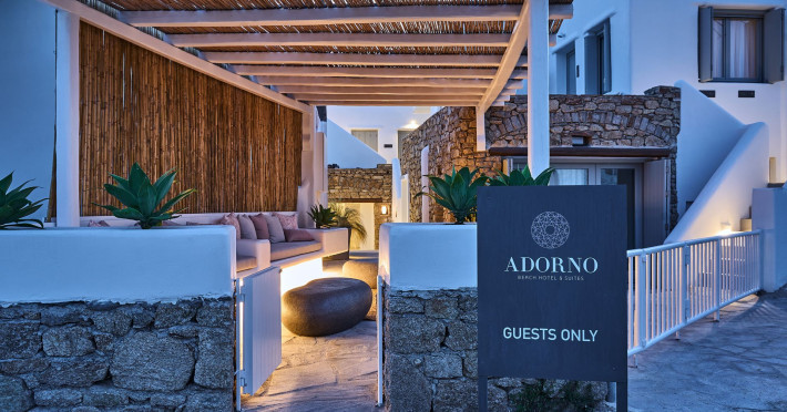Bohemian chic style met the authentic Mykonian architecture on the famous beach of Ornos, Mykonos, to create a brand-new beachfront Cycladic complex literally located a few steps away from the sea. Adorno Suites is the fresh deluxe accommodation in the area, introducing to its guests 20 meticulously designed rooms, suites and maisonettes, some of which coming with a private pool.Overlooking the Aegean, the property pays respect to the typical architecture of the Cyclades, blending whitewashed walls, elegant wooden pergolas and pastel-colored shutters. In the interiors, classic island style gets infused with contemporary minimalism, while all-white spaces make an excellent backdrop for some ultra chic bohemian decor elements, such as retro lightning, woven rugs and wooden details.Adorno Suites is celebrated for its key sea-front location, its boho-inspired flair and its laid-back summer atmosphere. A few minutes from the vivid Chora of Mykonos, it is the ideal boutique accommodation to enjoy swimming in the beach or private pool, explore the beauties of the island and experience an unforgettable stay that is about ease, relaxation and discreet luxury.