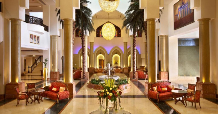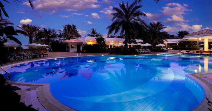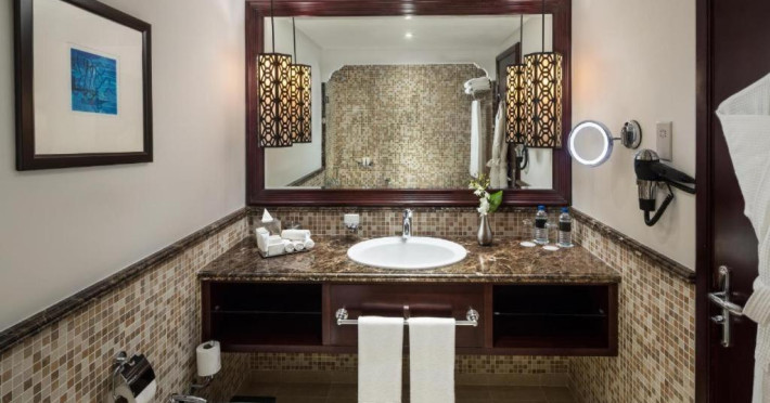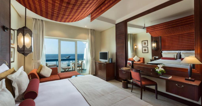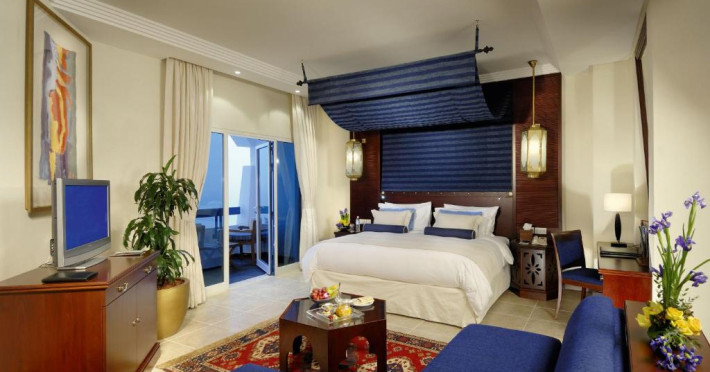 Camerele sunt decorate într-o paletă de culori deschise şi au mobilier elegant din lemn, în stil specific Orientului Mijlociu. Suitele și camerele elegante au terasă sau balcon privat mobilat. Acestea oferă vedere panoramică la Golful Arabiei şi la grădina amenajată luxuriantă.