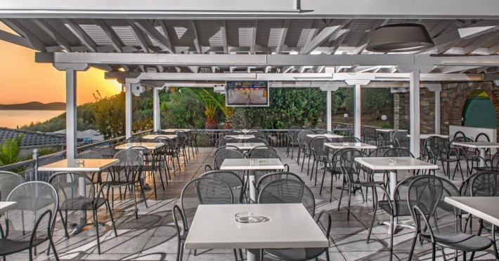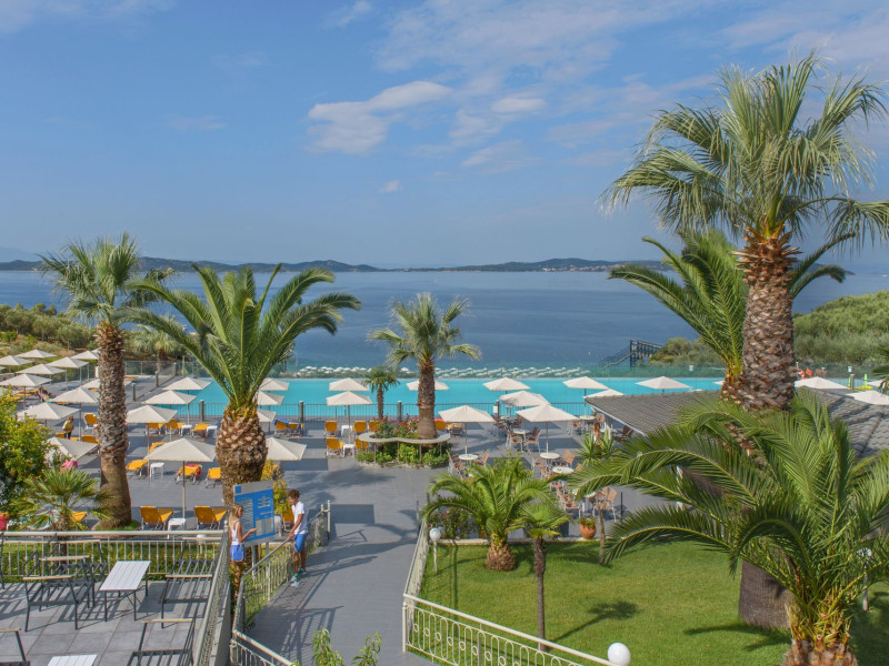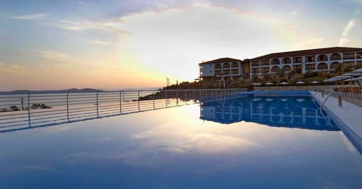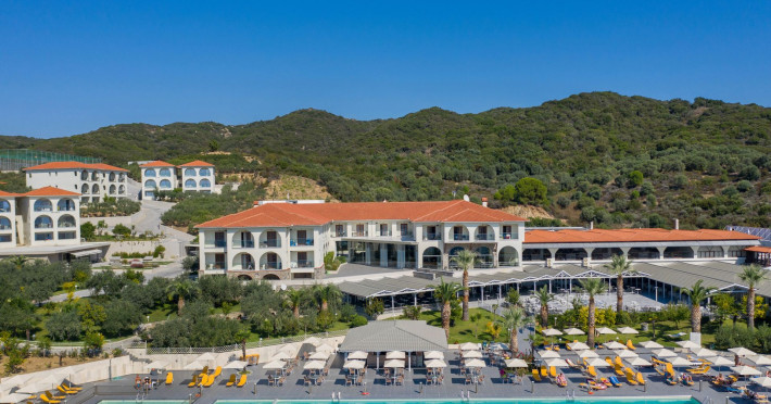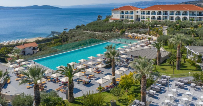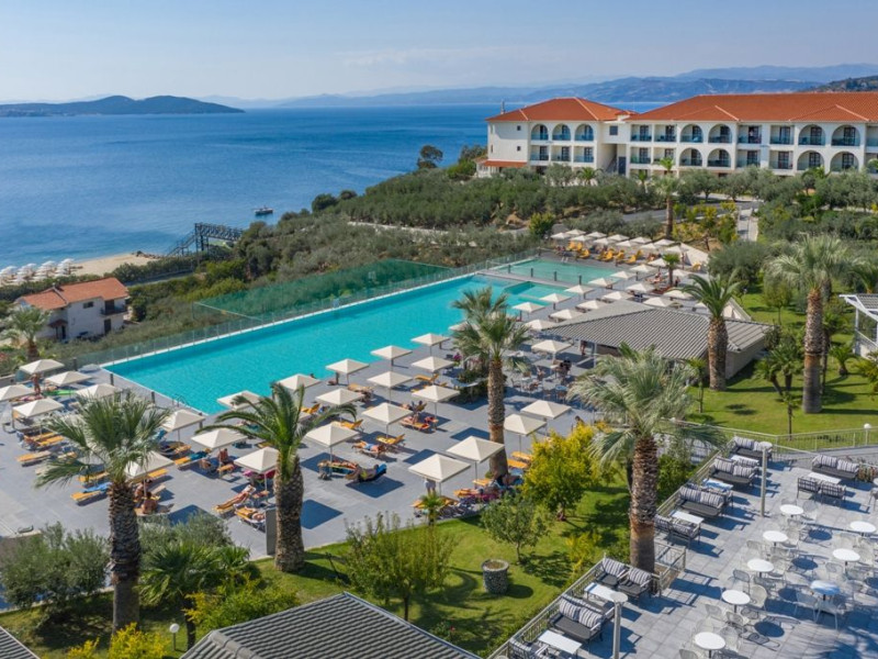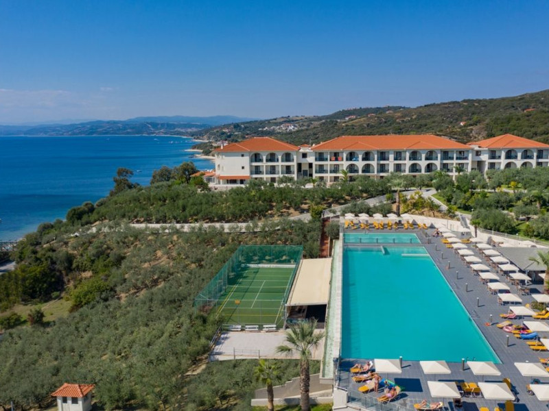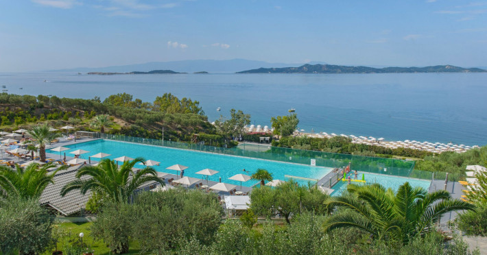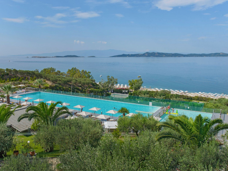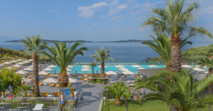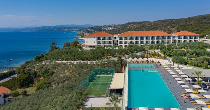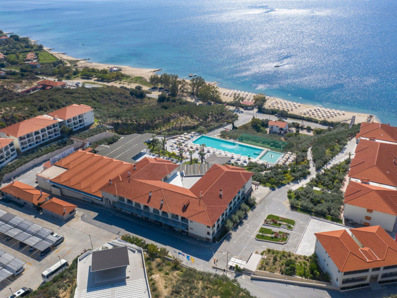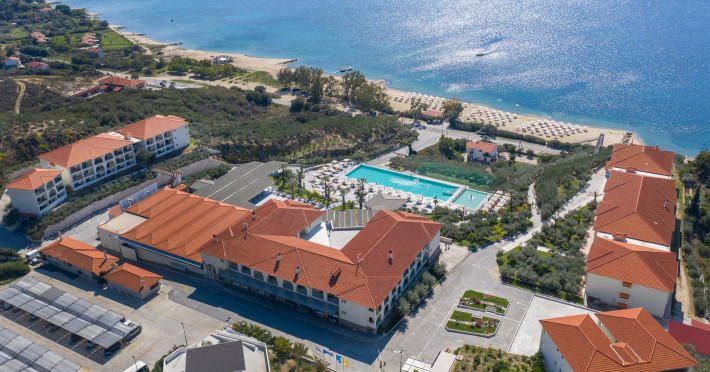Akrathos Beach Hotel Welcome to your summer dream⦠Located on the green hills of the Athos Peninsula, 2 km. away from Ouranoupolis village and 115 km. away from the airport of Thessaloniki âMacedoniaâ, Akrathos Beach 4 Star Hotel offers contemporary and stylish accommodation to the guests. All of our 266 rooms and suites are tastefully designed in modern and minimalist style. Spacious and comfortable, all rooms are equipped with independent air-conditioning / heating control, Double or Twin beds, safety deposit boxes, flat screen satellite TV, hairdryers, mini fridges at rooms, furnished balconies and tea/ coffee facilities.