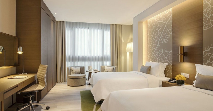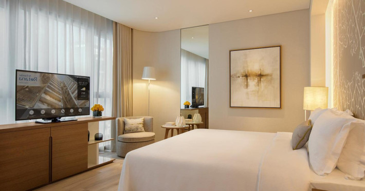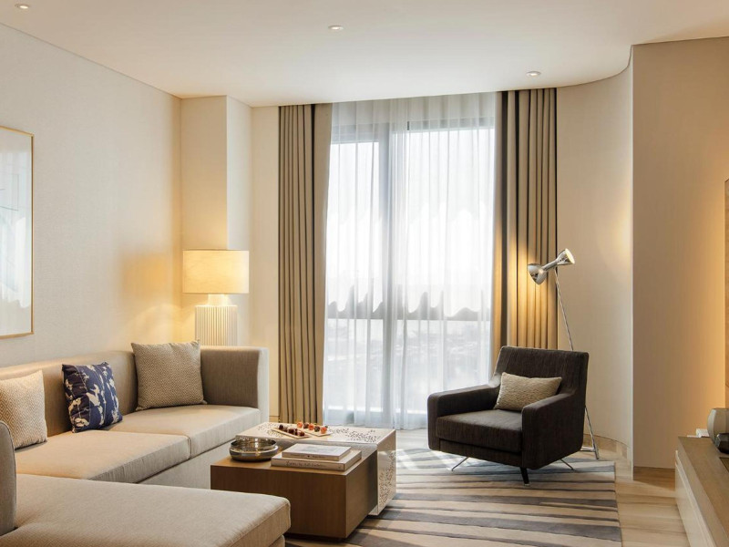 Al Bandar Arjaan by Rotana - Dubai Creek is a modern hotel apartment complex on the north shore of Dubai Creek, connected to the five-star Al Bandar Rotana. It offers 90 studios and suites with city or creek views, featuring kitchens with refrigerators and stovetops, microwaves, and flat-screen TVs with satellite programming. Amenities include complimentary Wi-Fi, a full-service spa with massages and body treatments, a health club, an outdoor pool, and a sauna. Dining options include Salt & Pepper Restaurant (international cuisine), a coffee shop/cafe, a bar/lounge, and a poolside bar; 24-hour room service is available. Buffet breakfasts are available daily for a fee. The hotel provides a complimentary shuttle to the beach and shopping center, a 24-hour airport shuttle (surcharge), free valet parking, and a business center. Six meeting rooms are available. No cots are available, and pets are not allowed. Nearby attractions include Dubai Creek (4-minute drive), Grand Mosque (6-minute drive), Dubai Creek Golf & Yacht Club, and Dubai Museum. Dubai International Airport (DXB) is 5 km away. The Al Bandar Arjaan By Rotana is a hotel.