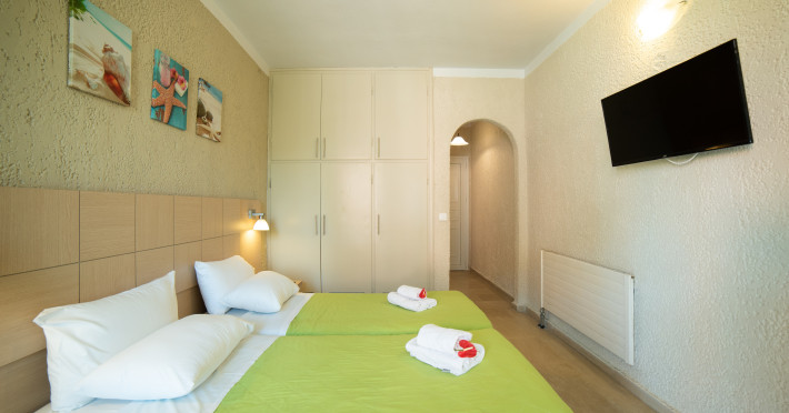 The hotel offers an outdoor swimming pool and next to it a playground for the younger guests. In addition, live Greek and international music nights are organised regularly. Guests can also relax on the sun loungers with parasols laid out ready for use in the resort and on the sandy beach (for a fee).