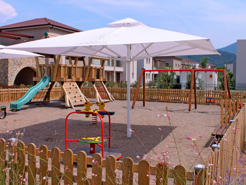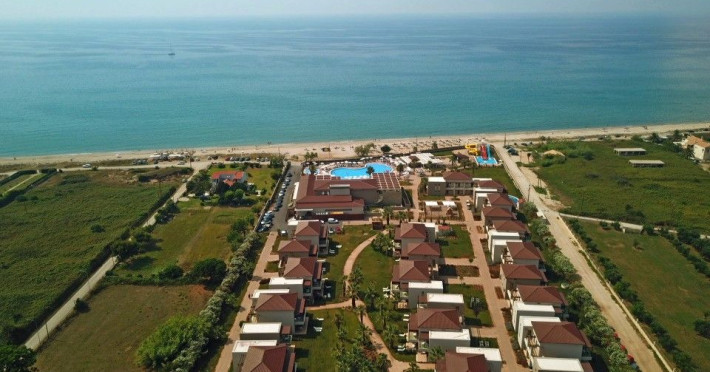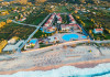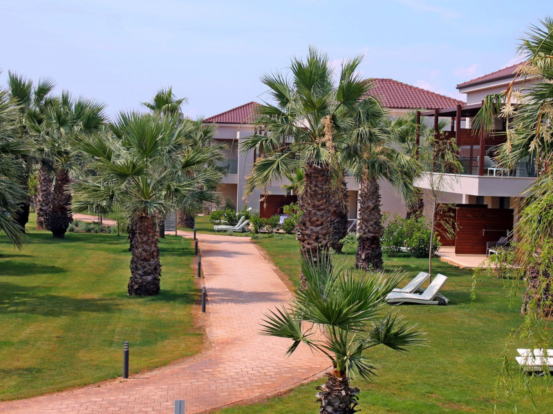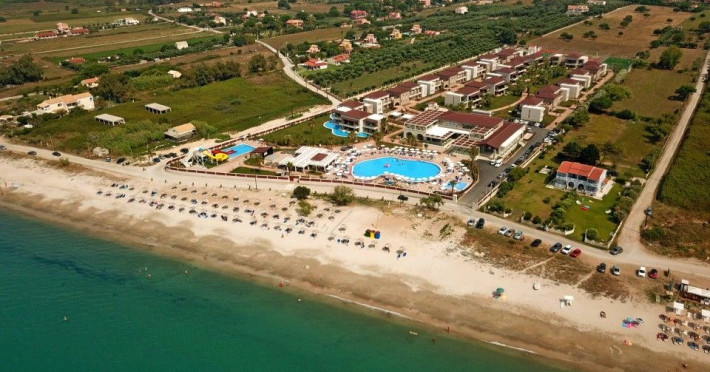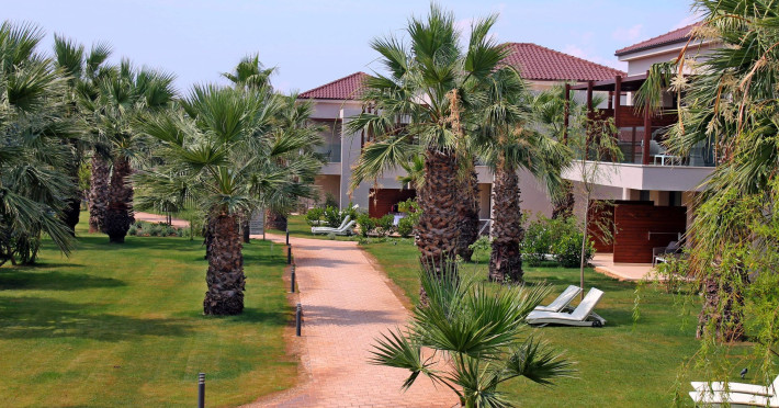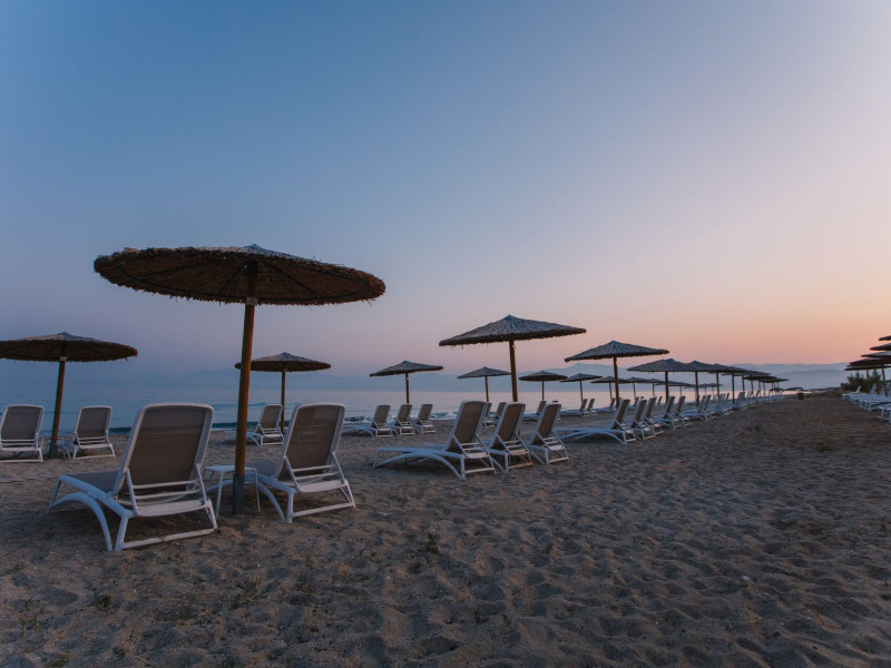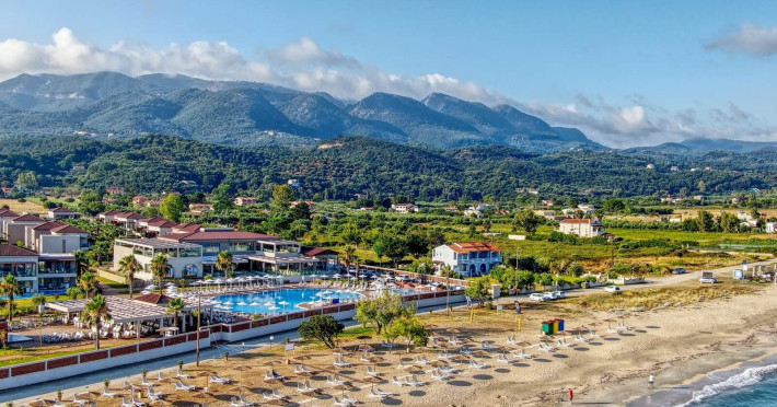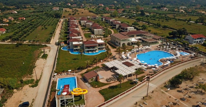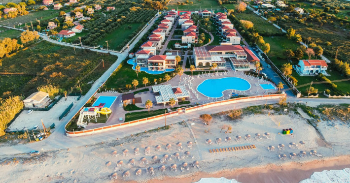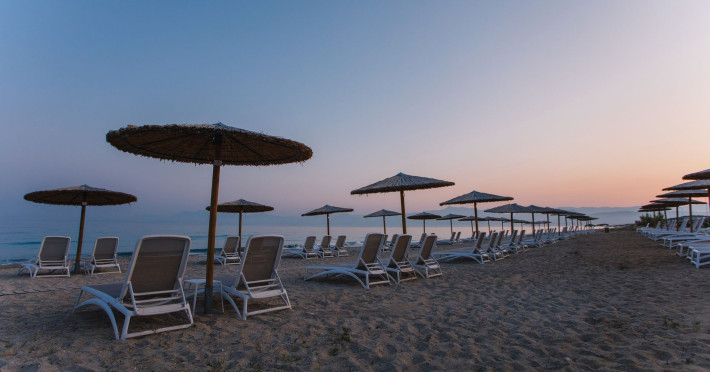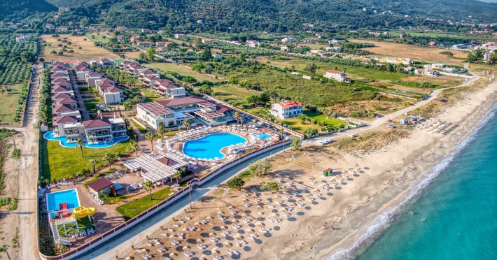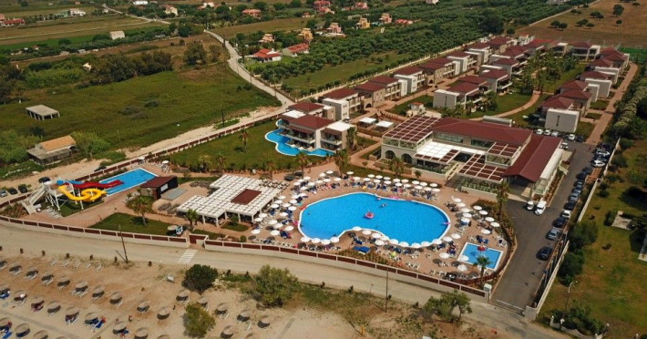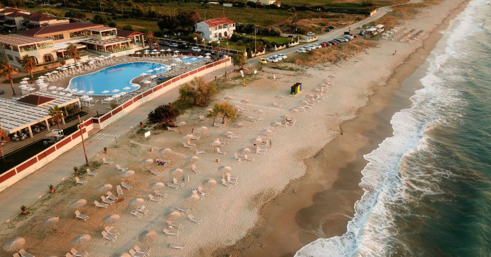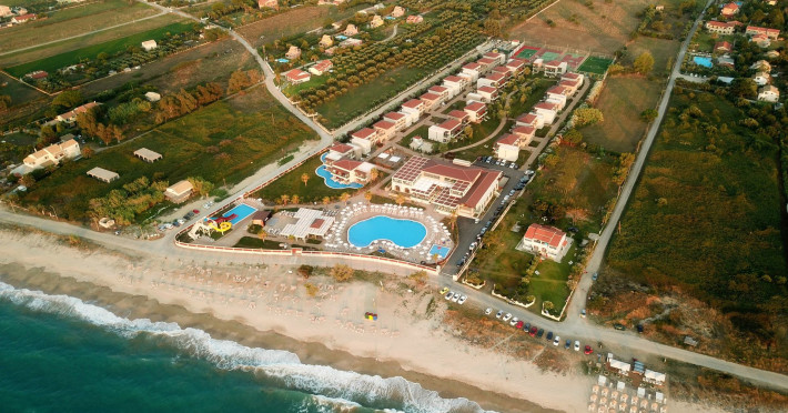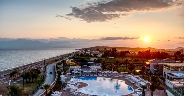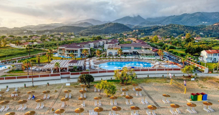 Almyros Beach resort & Spa its a newly build(2019) beach front, 5* hotel which includes 180 rooms spreaded in 12 buildings named after the 12 Greek Gods. It is a contemporary Family friendly hotel providing BB, HB and All Inclusive mealboards, builded in a unique location in front of Almyros sandy beach on the north coast with the most amazing sunset in Corfu island. Its Located 42 klms from Kapodistrias International airport and only 2 klms from Acharavi, a town where you may found shops, bars, restaurants & Supermarkets. In the main building, on the ground floor is our Reception and Lobby area with the Lobby Bar and main restaurant that Breakfast, lunch & dinner will be served. In the -1 floor you will find our Spa & Fitness facilties in an area of 300 sqm's, 2 Kids miniclubs, 2 shops and a multifunction room equipped with Audiovisual equipment sufficient to host special events like weddings, business meetings, for up to 100 people. Dine in our Roof top Ambrosia Ala carte Restaurant or enjoy the sunset with your favorite cocktail in our Nectar Roof top bar . Relax on the Pool area and enjoy your swim in the 600 sqm's swimming pool while having your favorite dring from the pool bar. 3 water slides, a childrens Pool and a playground is availiable for our little friends and our Animantion team will keep them entartained with several outooor and indoor activities to the Kids clubs. 2 Tennis courts, a 5x5 football and a basketball/volleyball courts are avaliable and a daily animation program with Yoga/Pilates/karaoke/ Dance cources will keep you entartained and fit