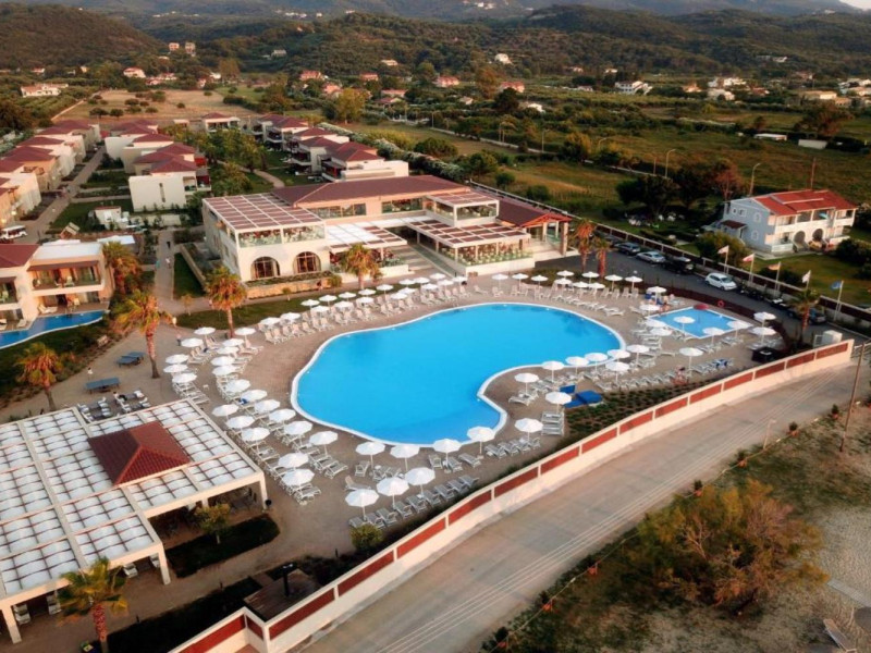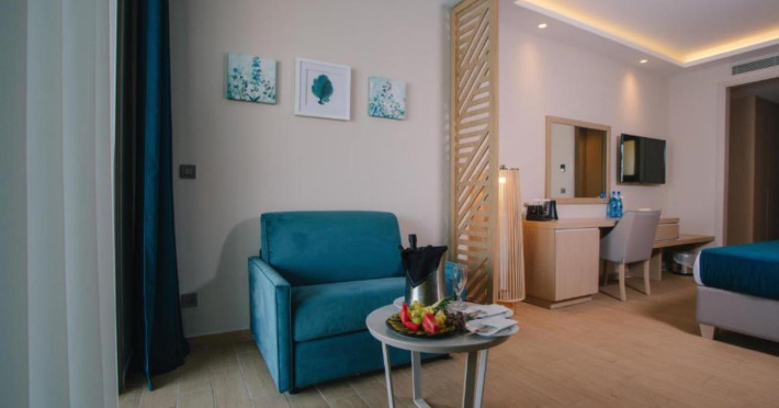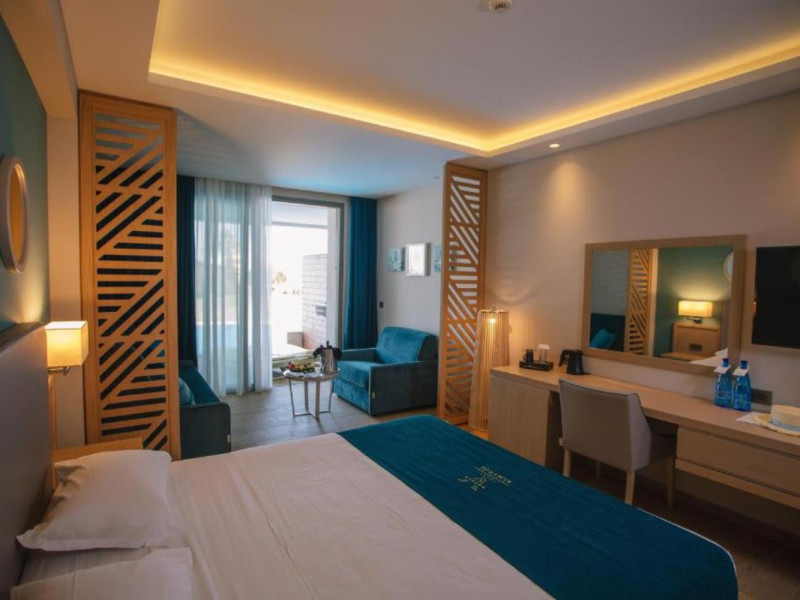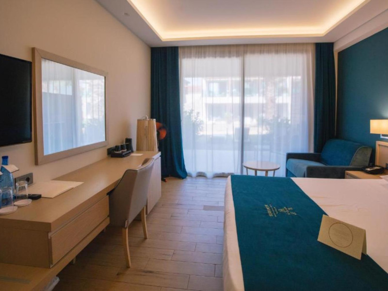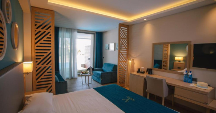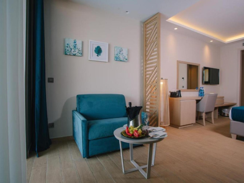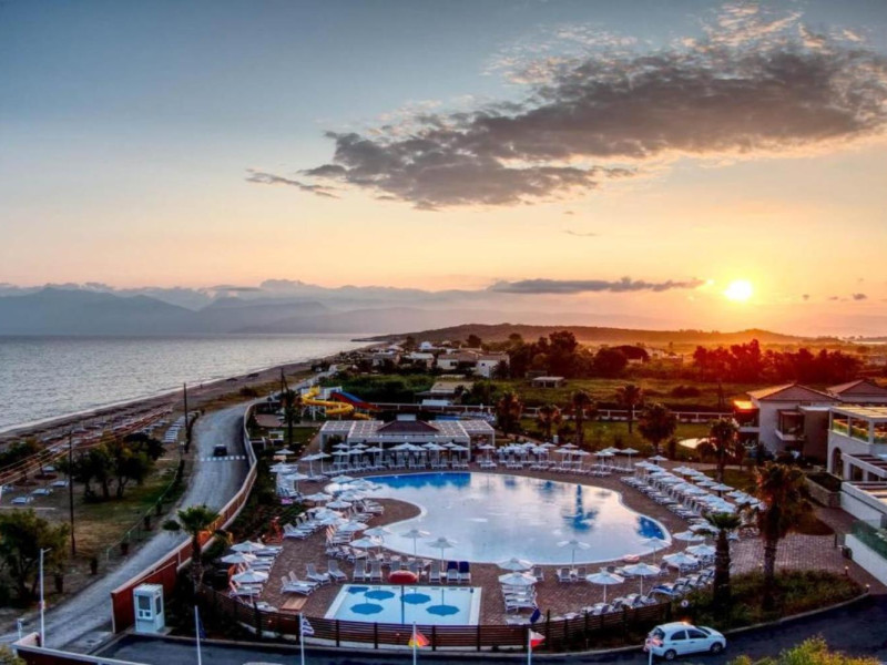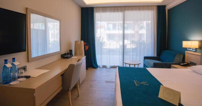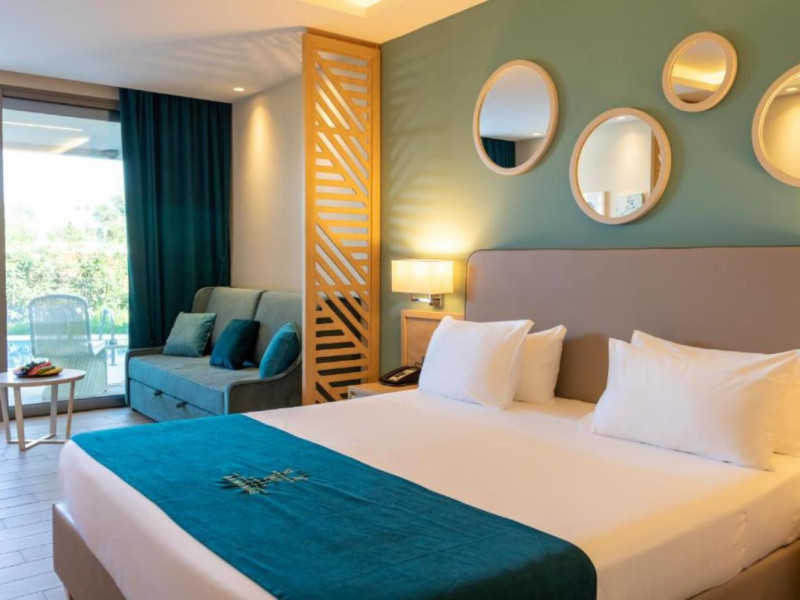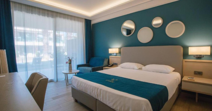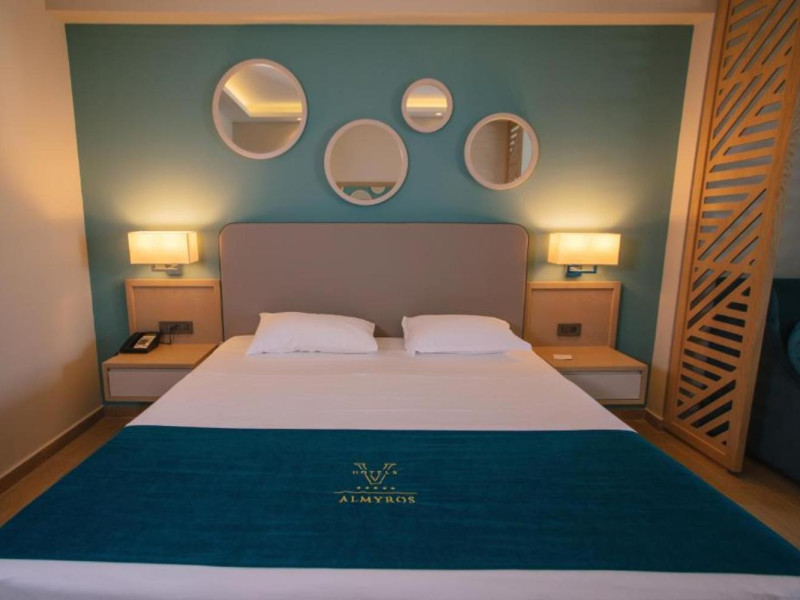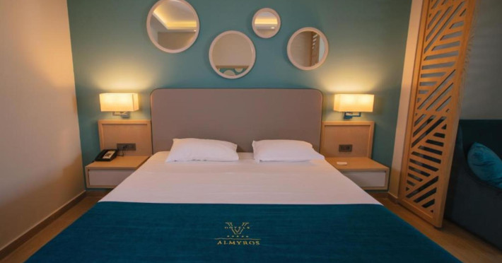 Almyros Beach resort & Spa its a newly build(2019) beach front, 5* hotel which includes 180 rooms spreaded in 12 buildings named after the 12 Greek Gods. It is a contemporary Family friendly hotel providing BB, HB and All Inclusive mealboards, builded in a unique location in front of Almyros sandy beach on the north coast with the most amazing sunset in Corfu island. Its Located 42 klms from Kapodistrias International airport and only 2 klms from Acharavi, a town where you may found shops, bars, restaurants & Supermarkets. In the main building, on the ground floor is our Reception and Lobby area with the Lobby Bar and main restaurant that Breakfast, lunch & dinner will be served. In the -1 floor you will find our Spa & Fitness facilties in an area of 300 sqm's, 2 Kids miniclubs, 2 shops and a multifunction room equipped with Audiovisual equipment sufficient to host special events like weddings, business meetings, for up to 100 people. Dine in our Roof top Ambrosia Ala carte Restaurant or enjoy the sunset with your favorite cocktail in our Nectar Roof top bar . Relax on the Pool area and enjoy your swim in the 600 sqm's swimming pool while having your favorite dring from the pool bar. 3 water slides, a childrens Pool and a playground is availiable for our little friends and our Animantion team will keep them entartained with several outooor and indoor activities to the Kids clubs. 2 Tennis courts, a 5x5 football and a basketball/volleyball courts are avaliable and a daily animation program with Yoga/Pilates/karaoke/ Dance cources will keep you entartained and fit