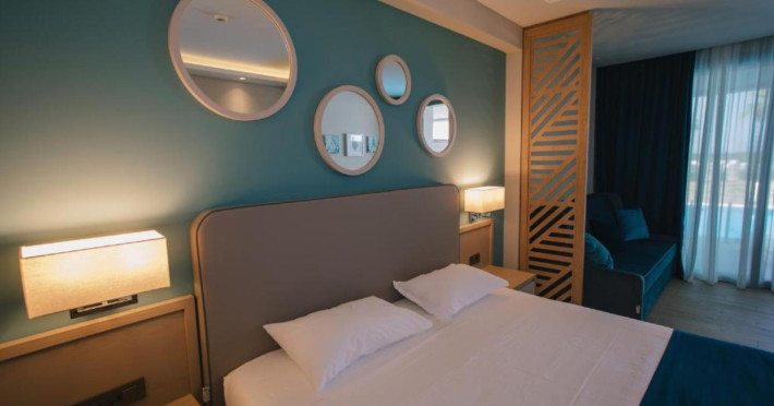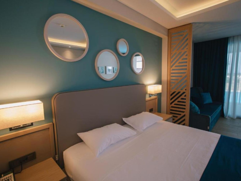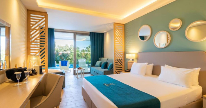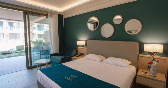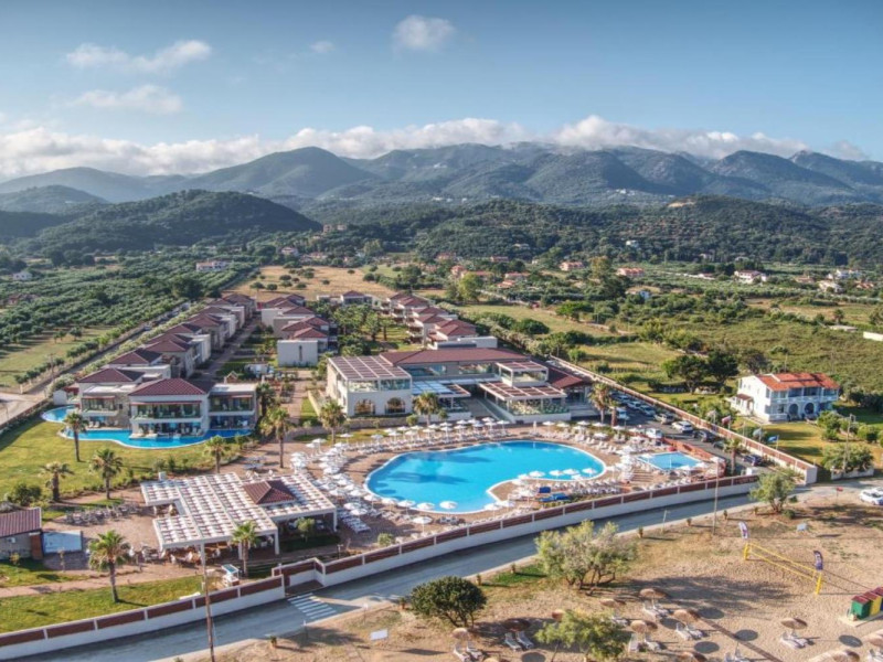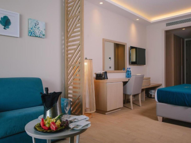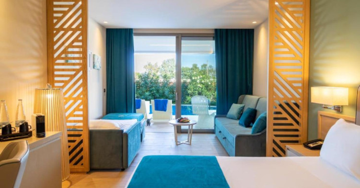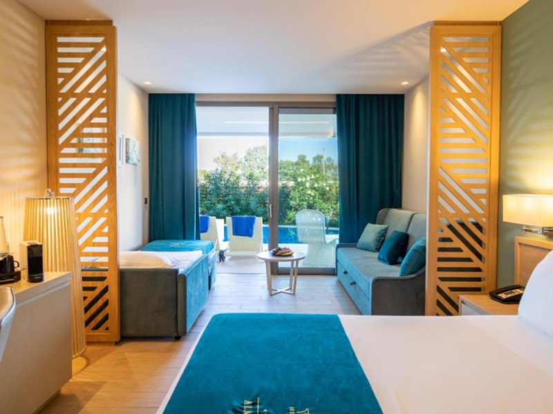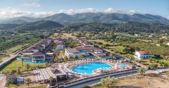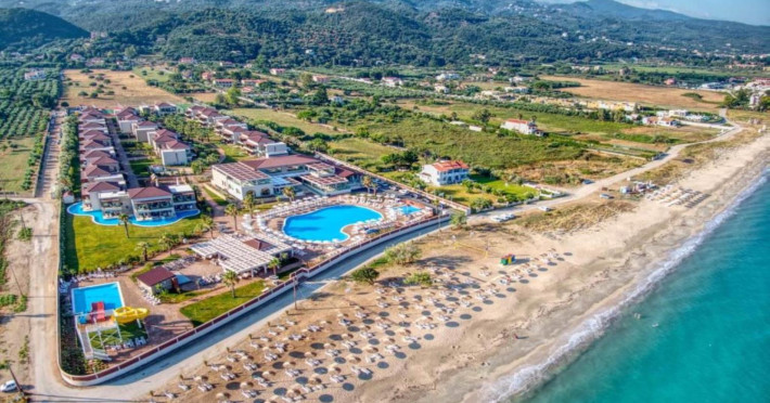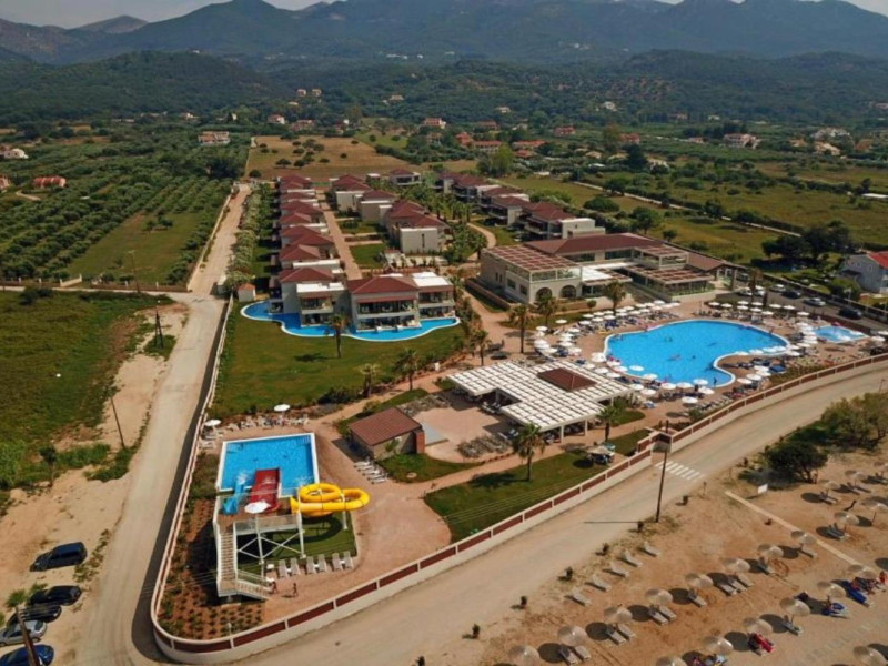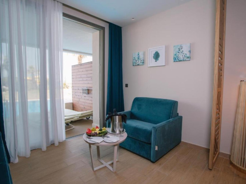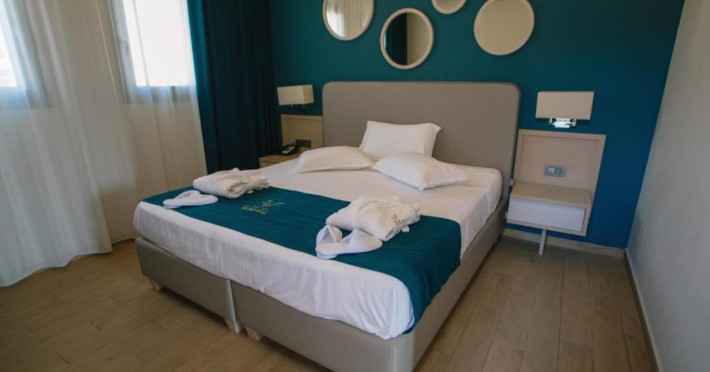 Almyros Beach resort & Spa its a newly build(2019) beach front, 5* hotel which includes 180 rooms spreaded in 12 buildings named after the 12 Greek Gods. It is a contemporary Family friendly hotel providing BB, HB and All Inclusive mealboards, builded in a unique location in front of Almyros sandy beach on the north coast with the most amazing sunset in Corfu island. Its Located 42 klms from Kapodistrias International airport and only 2 klms from Acharavi, a town where you may found shops, bars, restaurants & Supermarkets. In the main building, on the ground floor is our Reception and Lobby area with the Lobby Bar and main restaurant that Breakfast, lunch & dinner will be served. In the -1 floor you will find our Spa & Fitness facilties in an area of 300 sqm's, 2 Kids miniclubs, 2 shops and a multifunction room equipped with Audiovisual equipment sufficient to host special events like weddings, business meetings, for up to 100 people. Dine in our Roof top Ambrosia Ala carte Restaurant or enjoy the sunset with your favorite cocktail in our Nectar Roof top bar . Relax on the Pool area and enjoy your swim in the 600 sqm's swimming pool while having your favorite dring from the pool bar. 3 water slides, a childrens Pool and a playground is availiable for our little friends and our Animantion team will keep them entartained with several outooor and indoor activities to the Kids clubs. 2 Tennis courts, a 5x5 football and a basketball/volleyball courts are avaliable and a daily animation program with Yoga/Pilates/karaoke/ Dance cources will keep you entartained and fit