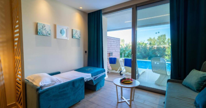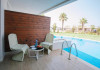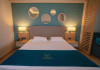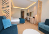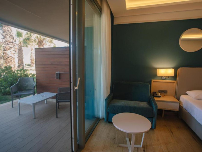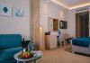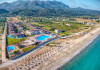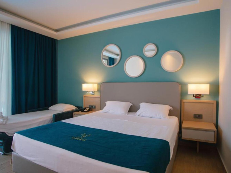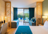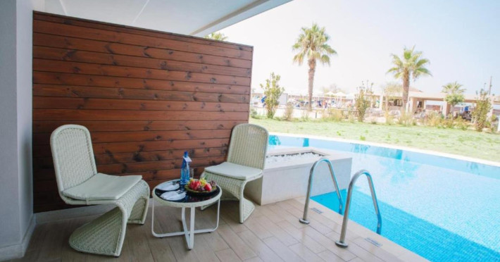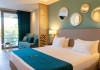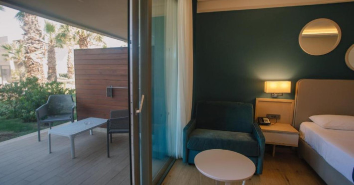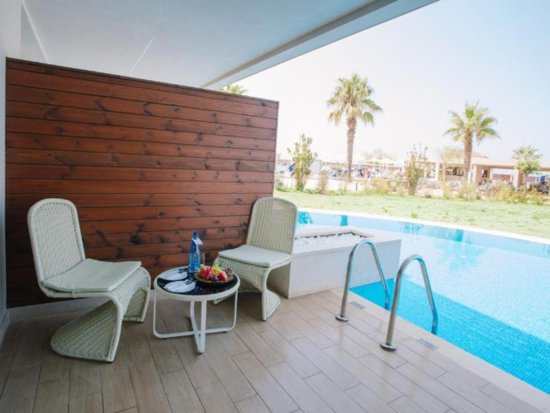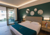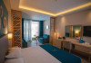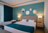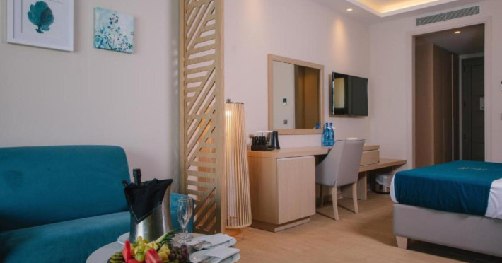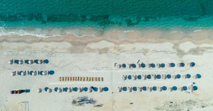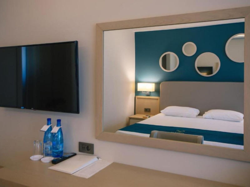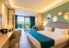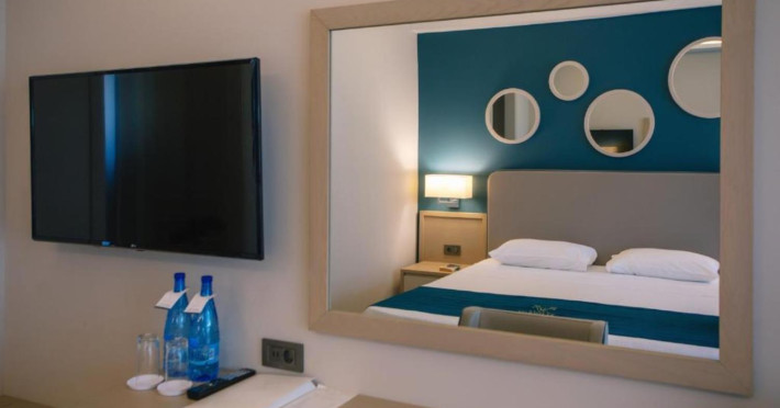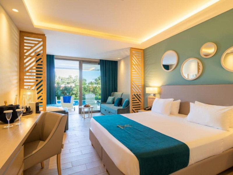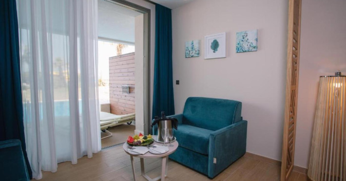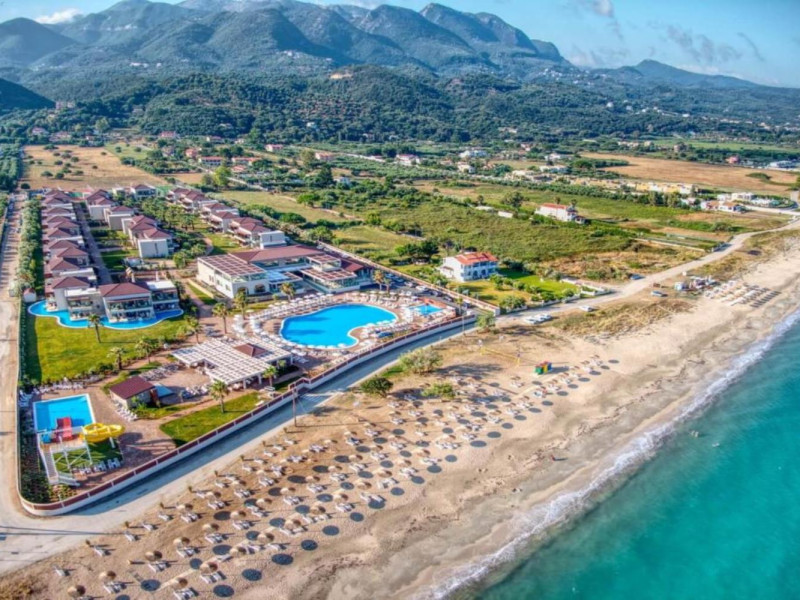 Almyros Beach resort & Spa its a newly build(2019) beach front, 5* hotel which includes 180 rooms spreaded in 12 buildings named after the 12 Greek Gods. It is a contemporary Family friendly hotel providing BB, HB and All Inclusive mealboards, builded in a unique location in front of Almyros sandy beach on the north coast with the most amazing sunset in Corfu island. Its Located 42 klms from Kapodistrias International airport and only 2 klms from Acharavi, a town where you may found shops, bars, restaurants & Supermarkets. In the main building, on the ground floor is our Reception and Lobby area with the Lobby Bar and main restaurant that Breakfast, lunch & dinner will be served. In the -1 floor you will find our Spa & Fitness facilties in an area of 300 sqm's, 2 Kids miniclubs, 2 shops and a multifunction room equipped with Audiovisual equipment sufficient to host special events like weddings, business meetings, for up to 100 people. Dine in our Roof top Ambrosia Ala carte Restaurant or enjoy the sunset with your favorite cocktail in our Nectar Roof top bar . Relax on the Pool area and enjoy your swim in the 600 sqm's swimming pool while having your favorite dring from the pool bar. 3 water slides, a childrens Pool and a playground is availiable for our little friends and our Animantion team will keep them entartained with several outooor and indoor activities to the Kids clubs. 2 Tennis courts, a 5x5 football and a basketball/volleyball courts are avaliable and a daily animation program with Yoga/Pilates/karaoke/ Dance cources will keep you entartained and fit