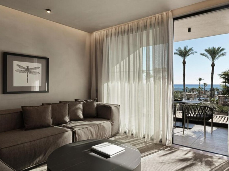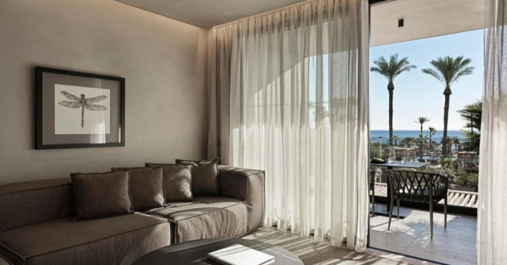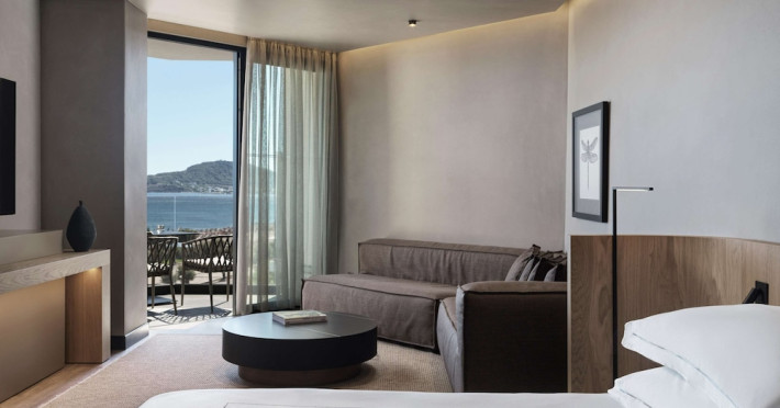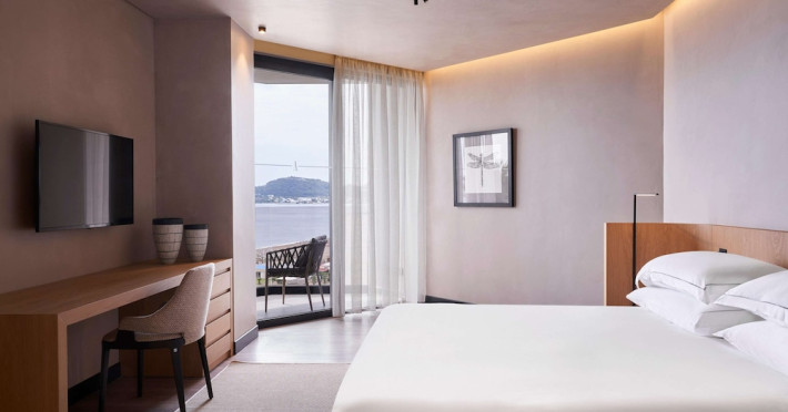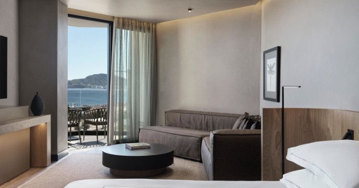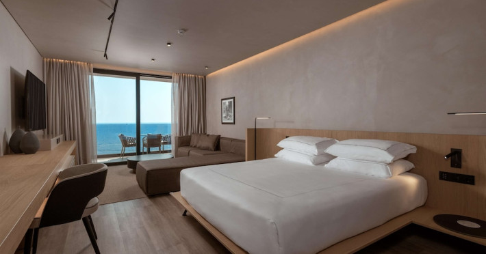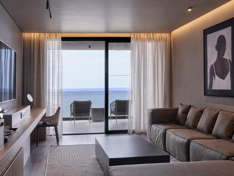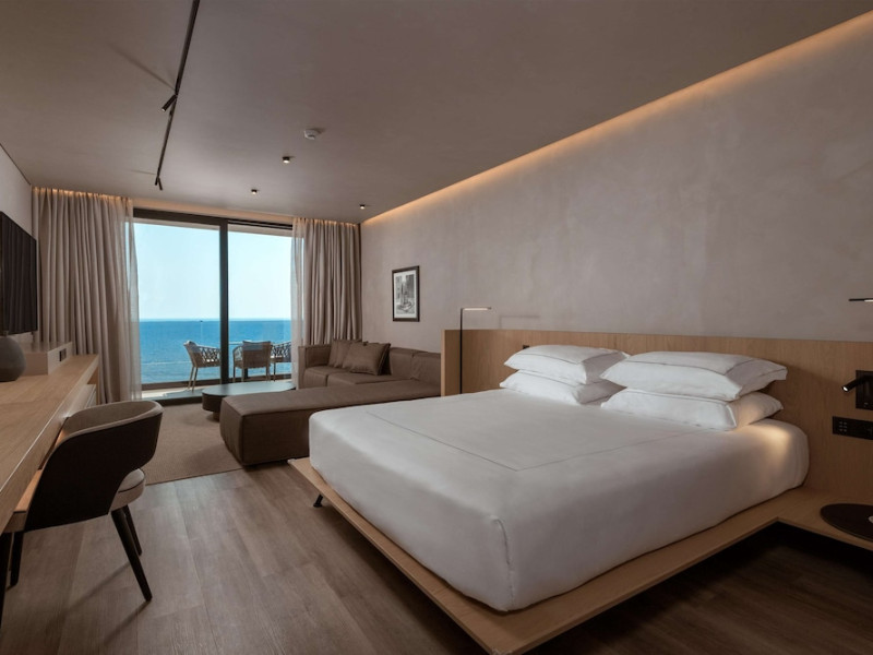 The air-conditioned rooms include a seating area, a flat-screen TV with satellite channels, a safety deposit box, a desk, a coffee machine, and a private bathroom with a shower, complimentary toiletries, and a hairdryer. Some rooms have a balcony and offer sea views.