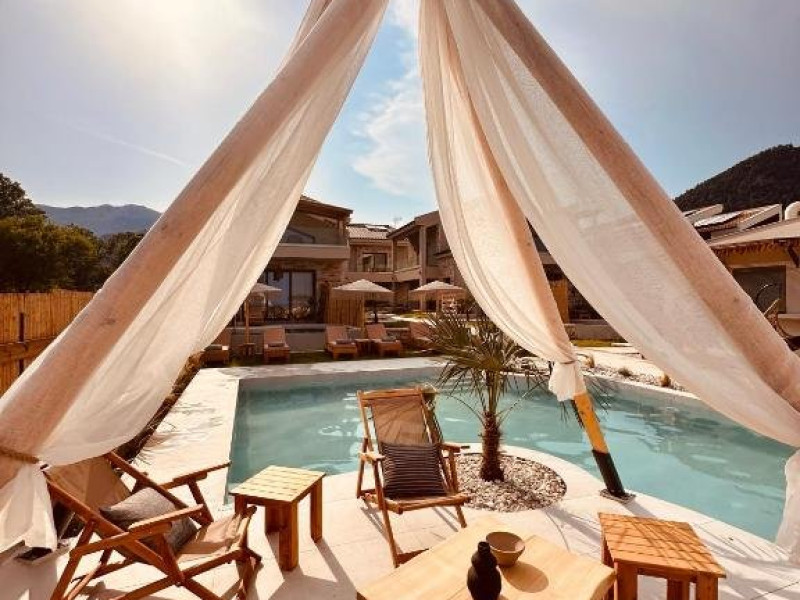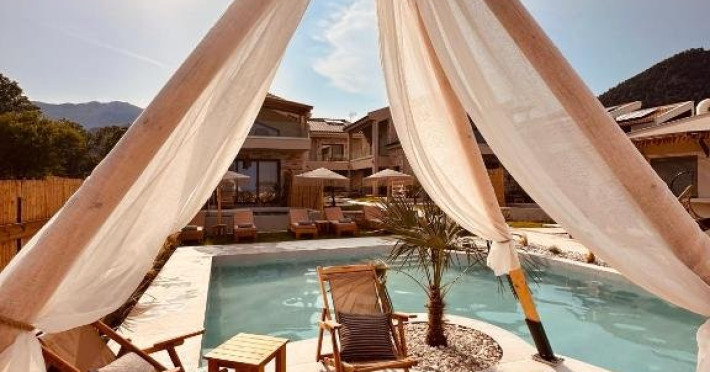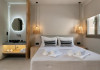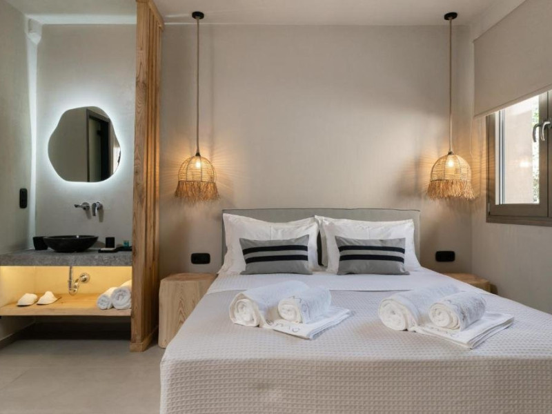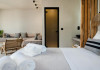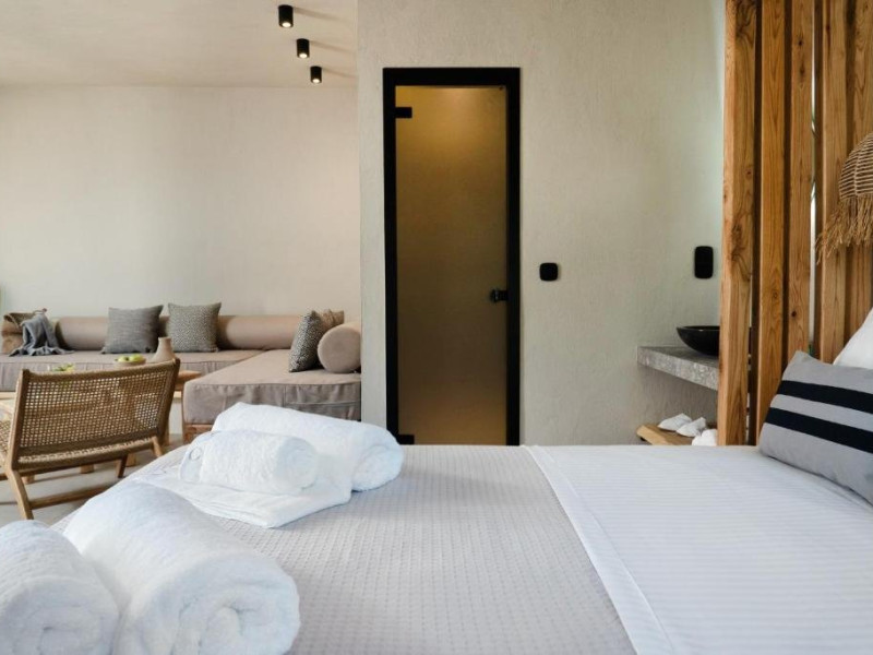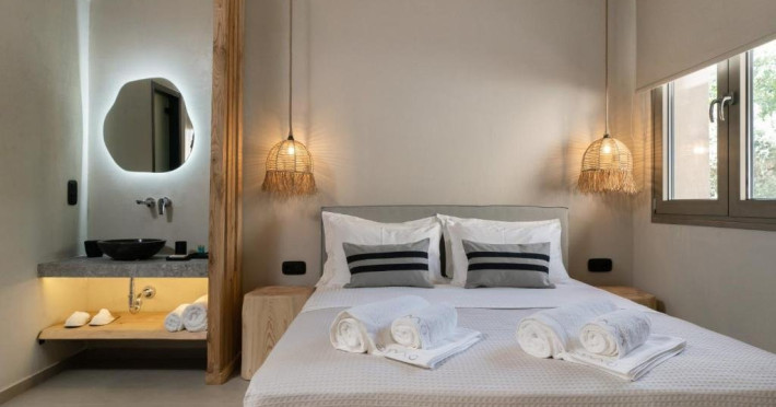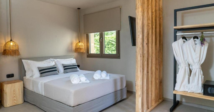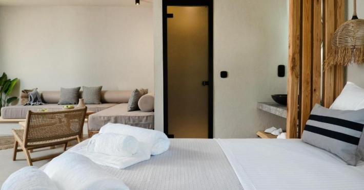 Eden Suite with Sea View- In aceste suite veti gasi un refugiu linistit, ideal pentru relaxare si seninatate totala. Situate la parterul celei de-a treia cladiri, cu o suprafata de 32 m2, suitele ofera momente infinite de liniste, combinand culori calde, pamantii si decor minimalist, cu optiunea de a utiliza sezlonguri private situate in fata terasei suitei, care se deschid spre vederi unice asupra marii. Fiecare suita, cu un pat dublu si o canapea care se transforma in doua paturi de o persoana, putand gazdui pana la 4 persoane, ofera o experienta confortabila si relaxanta. Suprafata: 32 m2 Capacitate: 4 persoane