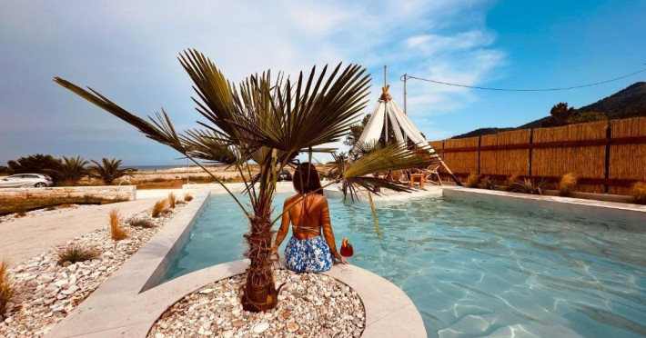 Sunrise Suite Sea View With Private Pool Suitele noastre elegante cu doua etaje, cu o suprafata de 44 m2, sunt situate in prim-planul complexului, chiar dincolo de piscina centrala. Aceste suite cu doua etaje ofera oaspetilor cea mai magnifica vedere asupra Marii Egee, combinand nuantele unice de smarald ale apei cu o atmosfera pamantie si o estetica boho-minimalista. Fiecare suita este captusita cu materiale naturale, cum ar fi piatra, lemn, bambus, si are doua dormitoare cu paturi duble pe niveluri diferite si un living. De asemenea, un balcon spatios la etajul superior permite oaspetilor sa se relaxeze si sa se bucure de combinatia dintre privelistea captivanta a marii albastre si a plajei aurii, briza marii, peisajul de neuitat si rasaritul de soare incantator. Suita de la parter dispune de o piscina privata in aer liber, care va va imbratisa cu ape racoritoare si privelisti neintrerupte asupra Marii Egee albastre. Dimensiune: 44m2 Capacitate: 5 persoane