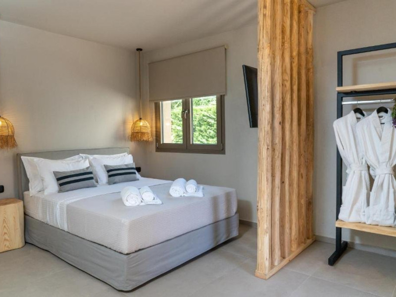 Nature Suite Aceste suite fermecatoare cu doua etaje, situate la primul etaj al primei si a doua cladiri, cu o suprafata de 44 m2, combina vederea la gradina si la mare, oferind confort de inalta calitate, o atmosfera de confort si liniste de neegalat, redefinind conceptele de simplitate. Fiecare suita ofera un pat dublu confortabil la etajul superior, oferind vederi uimitoare asupra marii si un rasarit magnific. La parter se afla o canapea care se transforma in doua paturi de o persoana si un balcon cu vedere atat la gradina, cat si la mare. Va puteti bucura de frumusetea naturala a zonei, asigurand un sejur placut si relaxant. Suprafata: 44 m2 Capacitate: 4 persoane