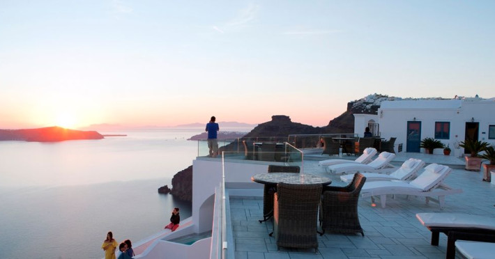 Our small boutique hotel with its unique and relaxing atmosphere, offers unobstructed panoramic view to the surreal landscape of Santorini with its vast curtain wall of multicolored cliffs.