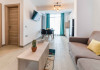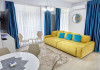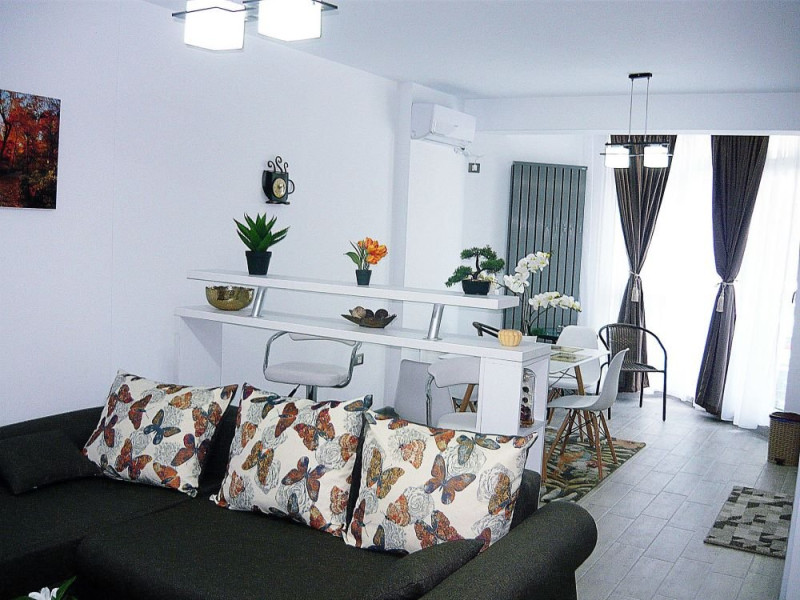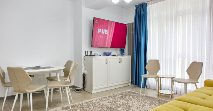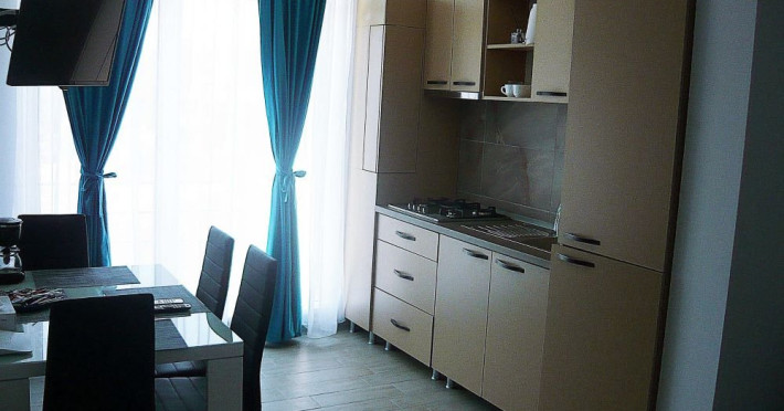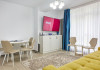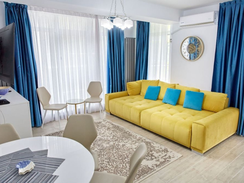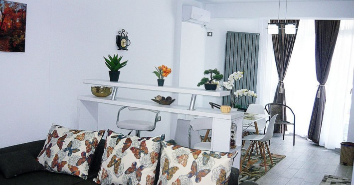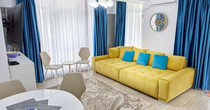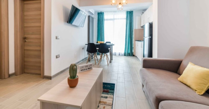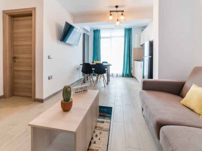 Apartament Sunny Holiday Alezzi - este format din living si dormitor. Livingul dispune de canapea extensibila, zona de luat masa, este open space cu bucataria completa utilata (aragaz, frigider, aparat de cafea, cuptor cu microunde), dormitorul este cu pat matrimonial. TV in ambele camere, wifi, aer conditionat, balcon. Suprafata 55 mp. Adresa strada Prelungirea D13 nr. 6, Bl G, parter.