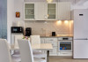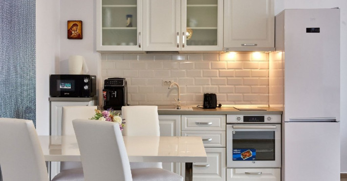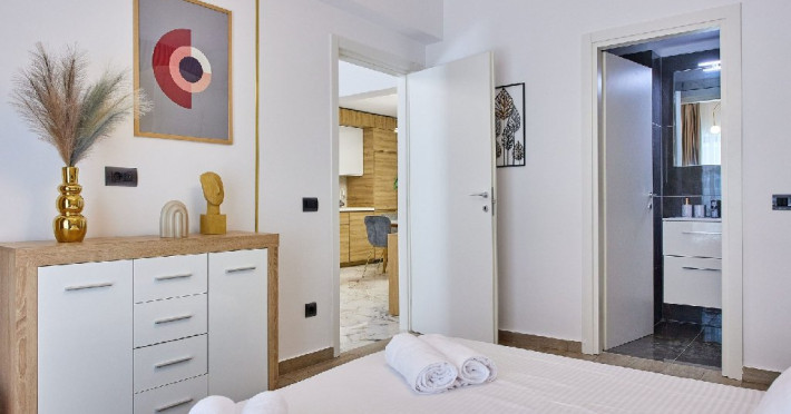 Elite Beachfront: dormitor cu pat matrimonial, living open space cu canapea extensibila, zona de servit masa, bucatarie dotata cu plita, cuptor, fierbator, aragaz, TV smart in ambele camere, aer conditionat. Este deservit de 2 bai, una de servicii si una cu cabina de dus de tip walk in, balcon cu mobilier, vedere la mare. Suprafata 55 mp. Capacitatea maxima de cazare este de 4 adulti si un copil 0-9.99 ani.