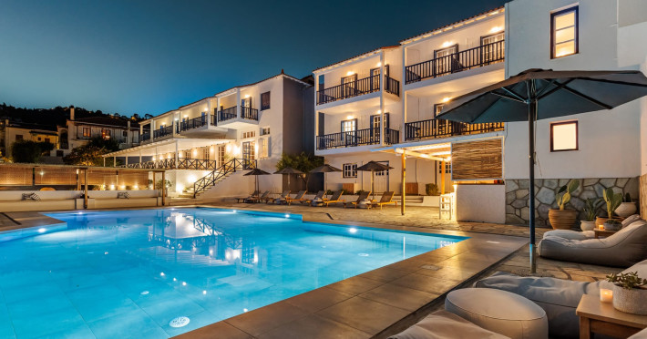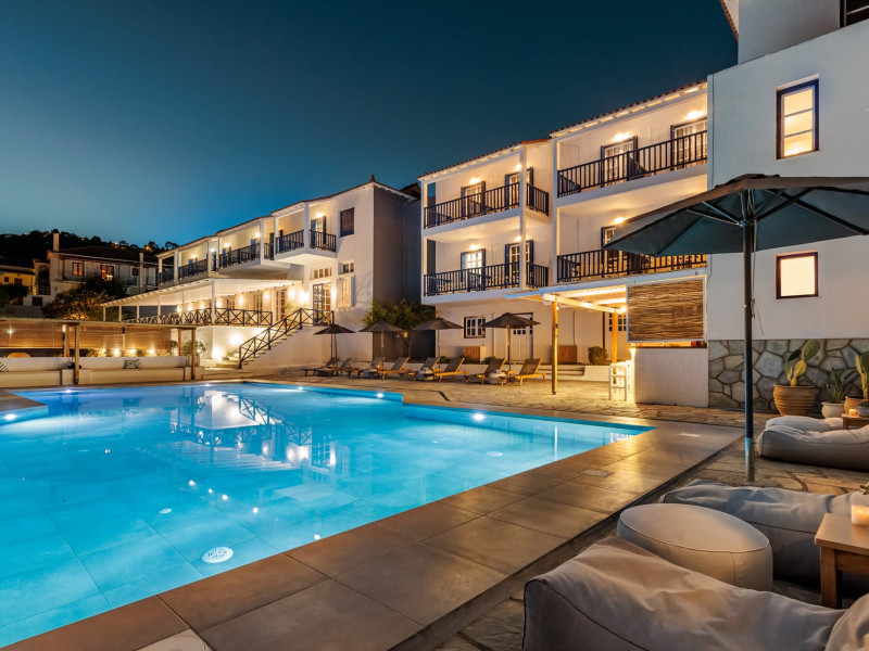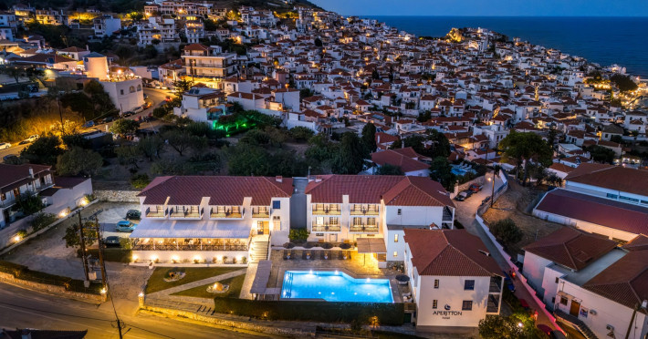 Nestled in the heart of the picturesque town of Skopelos, Aperitton Hotel blends traditional Sporades architecture with modern comforts, creating a welcoming retreat for travelers seeking relaxation and genuine hospitality. Since its founding in 1989, the hotel has been family-run, now managed by the third generation, and continues to combine timeless tradition with refreshed style and thoughtful touches.From summer 2025, guests can enjoy a brand-new swimming pool and beautifully renovated poolside exteriors, designed to enhance serenity and the overall guest experience. The hotel offers a range of comfortable rooms and suites with private bathrooms, air conditioning, refrigerators, TVs, free Wi-Fi, and balconies—some with stunning views of the Aegean Sea, Skopelos port, or the pool.The interiors reflect a clean, elegant aesthetic with crisp white decor and subtle textures, providing a calm backdrop for a relaxing stay. The property also features a lush garden, reception, safe deposit boxes, free parking, and a daily breakfast buffet.Celebrated for its warm, attentive service and central location, Aperitton Hotel offers the perfect base to explore Skopelos, unwind by the pool, or simply enjoy the peaceful charm of the island.