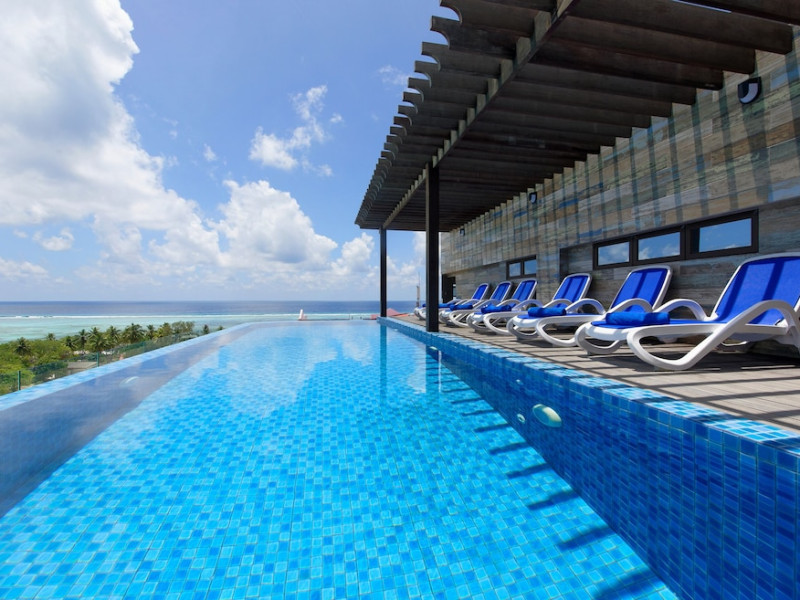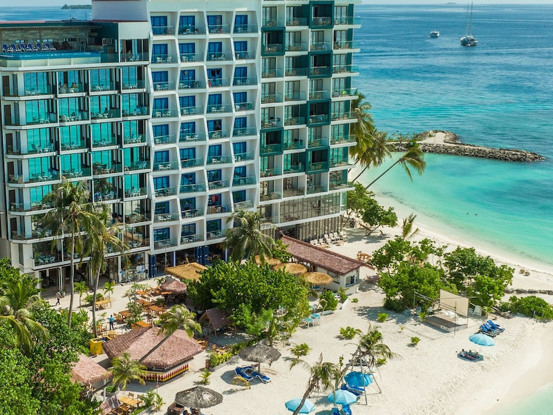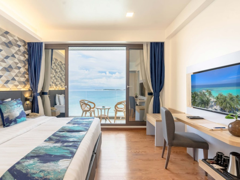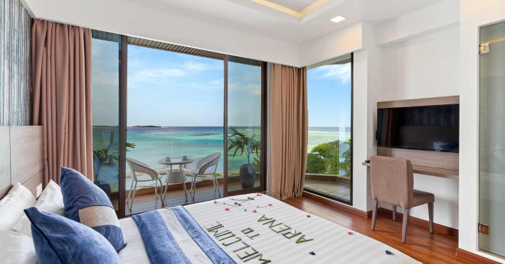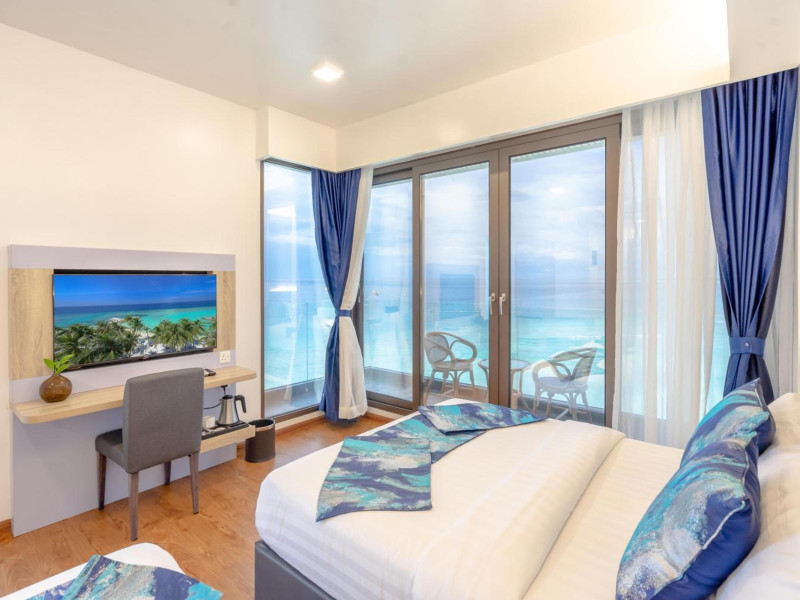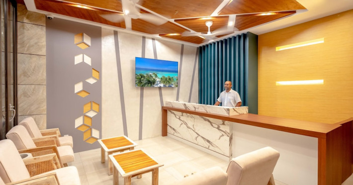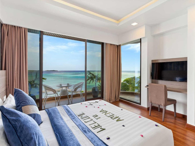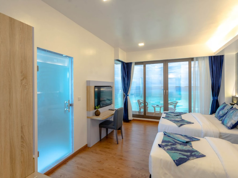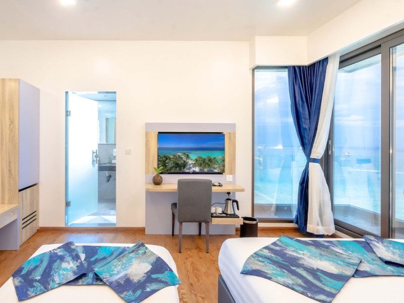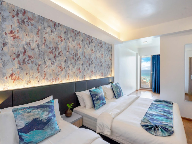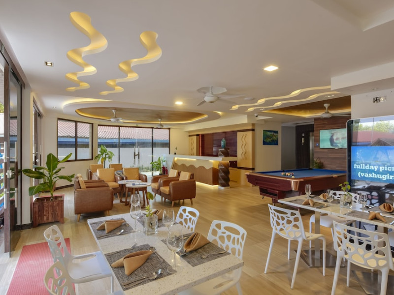 Arena Beach Hotel offers modern, tranquil accommodations on the Maafushi coastline, featuring free Wi-Fi throughout. Elegantly furnished, air-conditioned rooms include a personal safe, electric kettle, wardrobe, flat-screen TV with cable/satellite channels, and a private bathroom with shower, hairdryer, and free toiletries. On-site amenities include a beachfront restaurant serving local and Western cuisine with lagoon views, a rooftop hot tub and sun lounges, an indoor pool, a beach bar, and a 24-hour front desk offering concierge services, luggage storage, tour arrangements, and airport shuttle (surcharge). Guests can enjoy water sports (diving, snorkeling, windsurfing), a private beach, and free parking. The hotel is conveniently located near Maafushi Reef, Maafushi Mosque, Rihiveli Beach, and Rannalhi Beach. Room service is available during limited hours. The Arena Beach Hotel is a hotel.