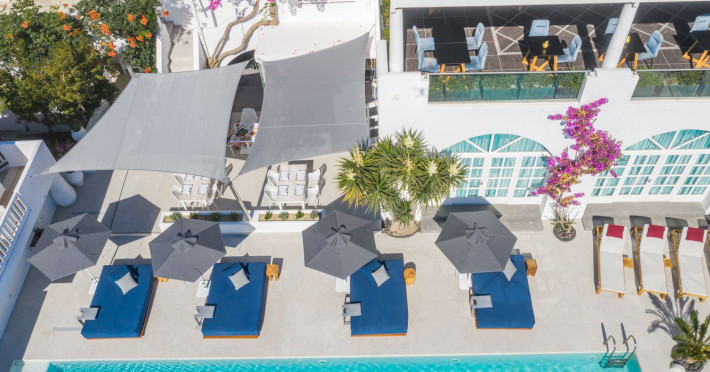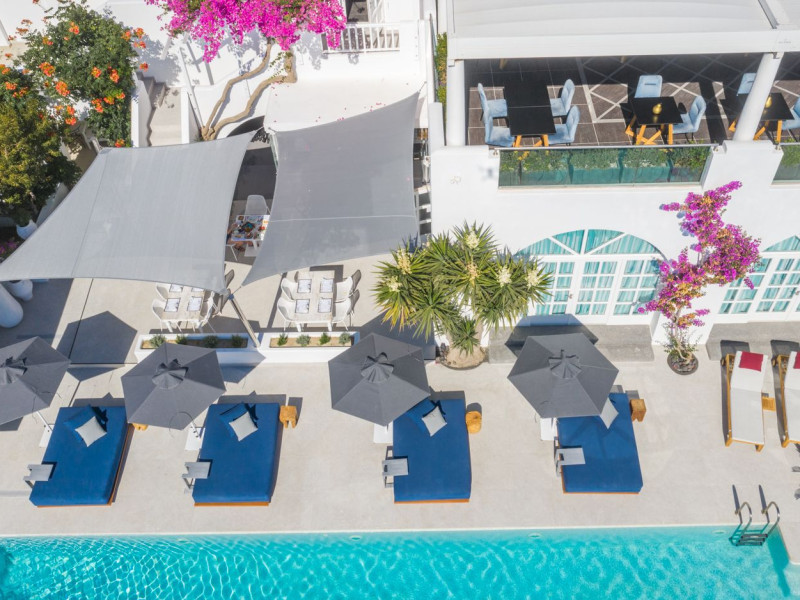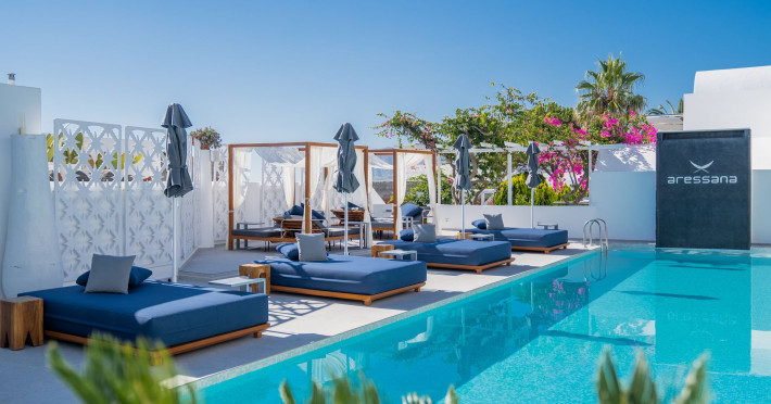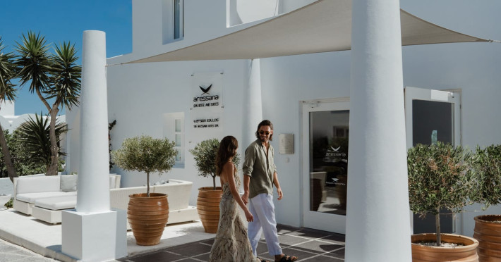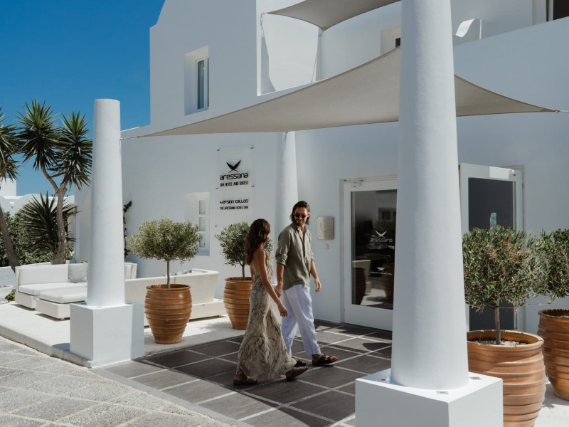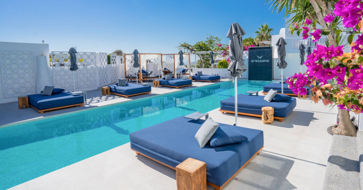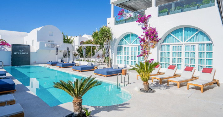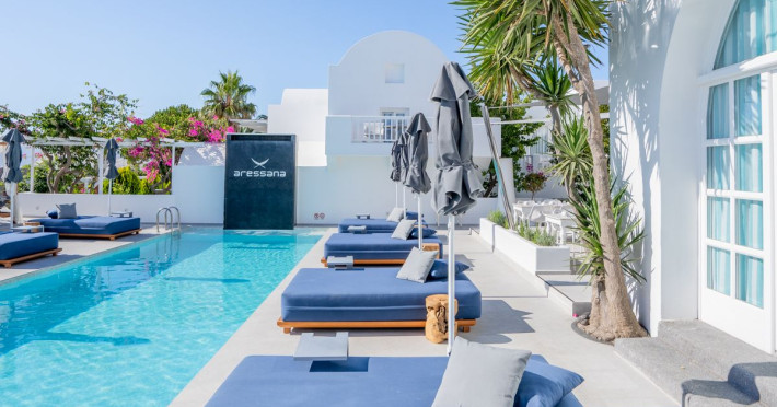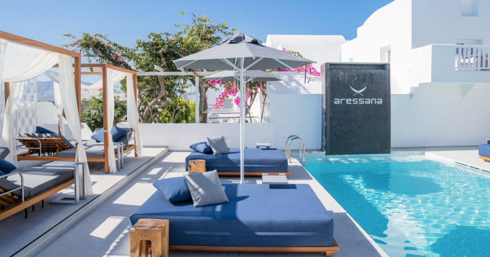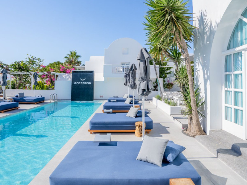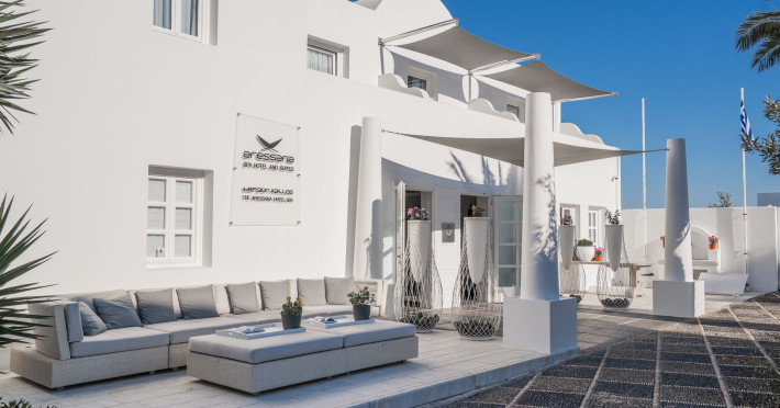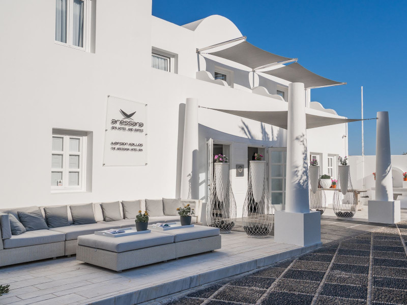 Aressana Spa Hotel & SuitesA proud member of Small Luxury Hotels of the WorldAressana seamlessly blends Santorinian tradition with modern sophistication, offering the warmth of family hospitality alongside professional, attentive service — ensuring an exceptional stay for even the most discerning guests. Every detail at Aressana has been thoughtfully curated to meet the standards of a Deluxe Category hotel. The unique eclectic minimalism of the design creates a soothing atmosphere that promotes relaxation and well-being. With a variety of geometric forms and subtle architectural levels, the property offers quiet corners and stylish spaces ideal for reading, writing, unwinding with friends, or simply soaking in the culture and charm of Santorini.Facilities & ExperiencesGuests can indulge in a wide array of upscale amenities, including:The serene Tefsion Kallos Spa, the award-winning Ifestioni Restaurant, a refreshing outdoor summer swimming pool, a relaxed Pool Bar, a well-equipped Fitness RoomLocationAressana enjoys a central yet peaceful setting in the historic heart of Fira, Santorini’s capital. Located next to the Greek Orthodox Cathedral and the Museum of Prehistoric Thera, the hotel offers easy access to the vibrant energy of the town while remaining a calm retreat. Guests are within walking distance of restaurants, boutiques, art galleries, and Santorini’s lively nightlife. The central bus and taxi station is just moments away, offering convenient transport across the island. Just a few steps from the hotel entrance lies the stunning Caldera rim, with panoramic views of the cliffs and volcano — especially breathtaking at sunset.Tefsion Kallos Spa Where Greek elegance meets holistic wellness in the heart of Fira Indulge in the ultimate relaxation experience at the newly renovated Tefsion Kallos Spa. A serene sanctuary of calm and rejuvenation, the spa offers a harmonious blend of modern luxury and traditional Greek wellness.Featuring three luxurious treatment cabins — including a dedicated couples’ room — and a tranquil private Spa Lounge, Tefsion Kallos Spa is designed to elevate your senses. Guests can unwind with a curated selection of treatments, including soothing massages, revitalizing facials, and bespoke body therapies — all performed with Apivita’s natural cosmetics for enhanced wellness benefits. The exclusive Spa Lounge is your personal oasis, complete with: a cave-style hot tub, a Sunlighten™ infrared sauna, a steam room and heated loungers. Ifestioni Restaurant ExperienceStart your day at a relaxed pace with breakfast served until 11:00 AM daily.Savor our award-winning Greek buffet breakfast, featuring homemade Santorinian specialties, served poolside from 8:00 to 11:00 AM. The serene open-air Pool Deck, dressed in calming white and turquoise hues and furnished with canopy beds and sun loungers, provides the perfect backdrop for a leisurely morning.Throughout the day, indulge in the Mediterranean-Greek flavors of Ifestioni Restaurant, where our award-winning chefs infuse every dish with “Meraki” — passion and love. Enjoy lunch by the expansive freshwater pool, delighting in traditional Greek dishes with creative, healthy twists, complemented by refreshing signature cocktails.As evening falls, dine under the stars on Ifestioni’s upper floor veranda, offering stunning east-facing sea views. Explore a curated selection of Greek and local wines as you experience elegant Greek and Mediterranean cuisine in a magical setting. Every meal at Ifestioni is a heartfelt celebration of Greek culinary tradition, inviting you on an authentic journey that honors the island’s rich culture.Swimming Pool & Snack Pool Bar The beautifully designed freshwater swimming pool, located at the heart of the Lower Level, is continuously refreshed by a gentle cascade of flowing water. Comfortable loungers and curtained divans line the sun-drenched poolside, creating the perfect spot to soak up the daytime warmth. As night falls, the pool’s shifting colors transform the area into a mesmerizing, almost magical setting.Room FacilitiesOur 48 elegantly appointed guest rooms and suites, adorned in tranquil island-white tones, provide every comfort expected from a sophisticated hotel. Choose from rooms featuring a king-size bed or twin beds, each with a private balcony or patio. For a more luxurious stay, select one of our sea view suites complete with a private hot tub on the balcony, or junior suites offering access to a shared pool.Additional amenities include air conditioning, an electronic safe, direct-dial telephone, and complimentary bottled water alongside tea and coffee facilities. Secure double-glass windows and terrace doors can be partially or fully opened to ensure your comfort and tranquility.Bathrooms have been carefully renovated and feature spacious showers with rain-shower heads, modern washbasins, Hansgrohe fittings, a Valera hairdryer, and shaver sockets. Luxurious bathrobes, slippers, and premium toiletries complete the indulgent experience.Guest ServicesOur dedicated team is available 24 hours at the front desk to assist with travel information, bellboy and luggage service, and personalized concierge support. Additional services include minivan transportation, room service, daily housekeeping with turndown service ( upon request), and laundry and ironing facilities. Stay connected with free Wi-Fi throughout the property. For families, babysitting services are available upon request, along with complimentary baby cots and high chairs.How to Reach UsWe offer convenient arrival and departure transfers from the port or airport, delivering you directly to the hotel entrance. If you plan to use your own transportation, please contact us for detailed directions. Please note that the hotel is located within a restricted pedestrian area where cars are not permitted. Aressana is 6 km from Santorini Airport (JTR) and 13 km from Athinios Port.Contact Aressana HotelE