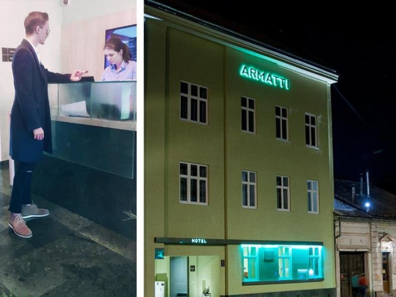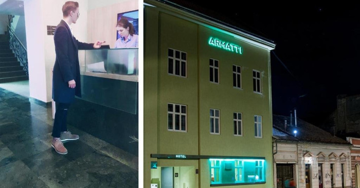 HotelulArmatti este amplasat in spaiul modificat al unei cladiri ultracentrale pentrucare am meninut forma i am redefinit funcionalitatea.Am imbunatait structura pentru a crea spaii largi i luminoase i amrestaurat faada pastrand linia arhitecturala a cladirilor din vecinatate.Interiorul este conturat de linii i forme bine definite ce asigura un parcursorganic in interiorul hotelului.