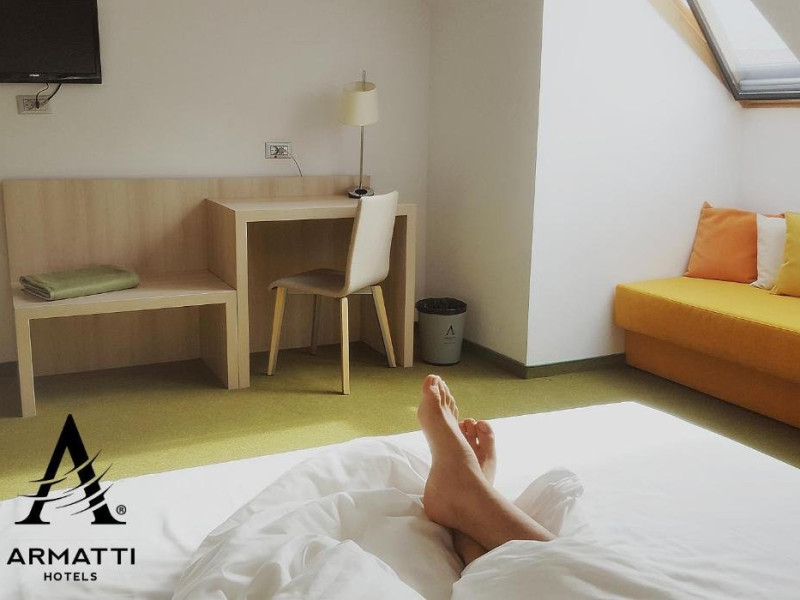 9 duble superioare matrimoniale-4 duble superioare twin-2 executive twin -6 camere executive matrimoniale-2 Junior Suite Fiecare din cele 30 de camere alehotelului este amenajata pentru a indeplini cele doua funcii imperative uneigazduiri ideale: confortul i ergonomia. Spaiile dumneavoastra personale aufost concepute pe un stil hibrid intre dormitor i birou, cu geamuri mari cepermit patrunderea luminii naturale intreaga zi i care in zumzetul orauluiafara in timpul nopii. Camerele Armatti, alaturi de dotarile fiecareia :internet de mare viteza, birou, fier si masa de calcat, espresor, fierbatorelectric, minibar, Smart TV, wake-up call, climatizare pe 4 cai, uscator depar, pat suplimentar, acces cartela, garanteaza ederi placute i productive.Minibarul din camera este dotat cu o varietate de bauturi, cipsuri i dulciuri.Fiecare camera a hotelului are in dotare un miniseif electronic care se afla indulap.In toate camerele hotelului sunt disponibile telefoane cu linie directainternaionala.