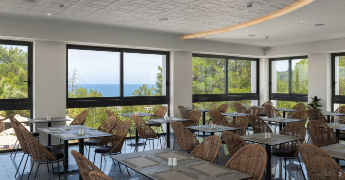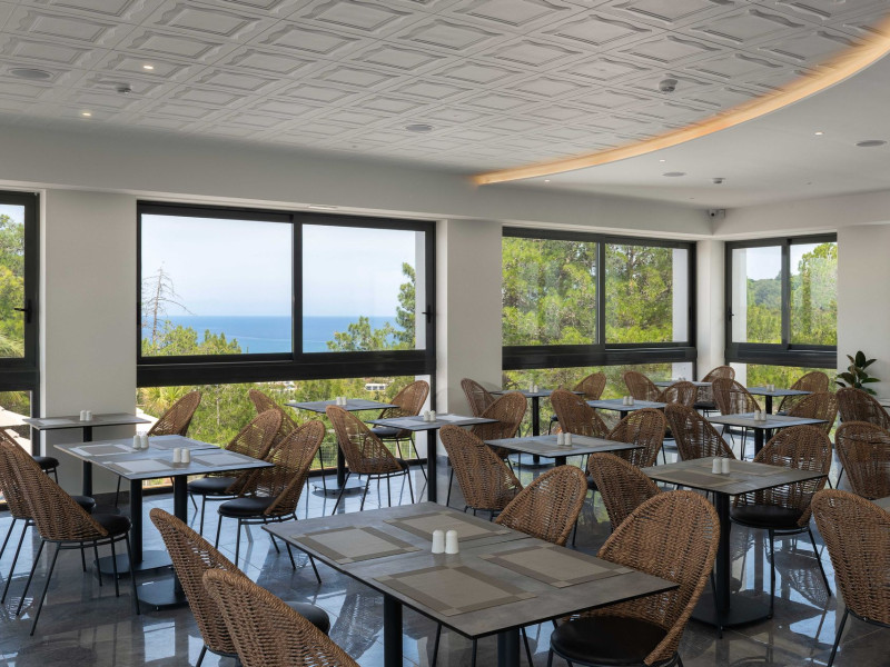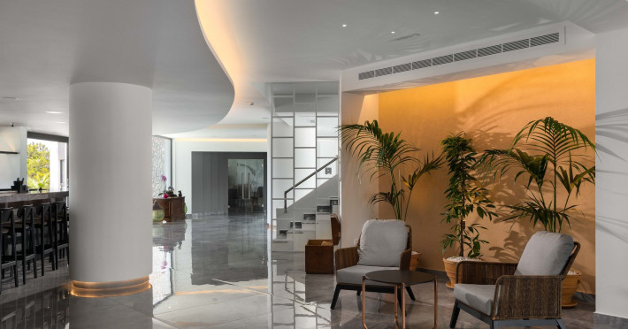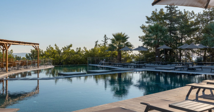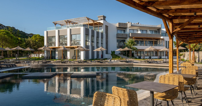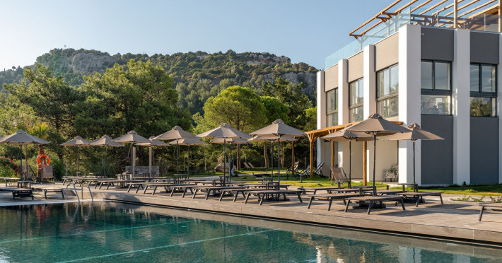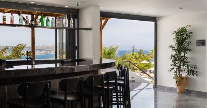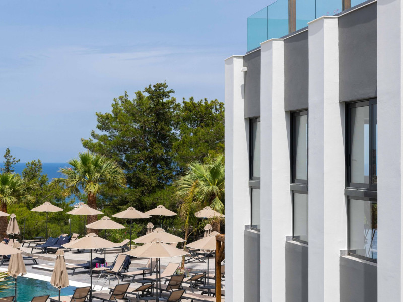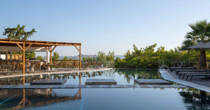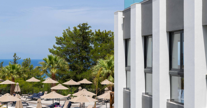 An adults only hotel with modern and greek ethnic design elements. The hotel is located on a forest covered hill overloking the Faliraki bay. It features a large infinity pool, two bars, a reaturant and a snack bar.