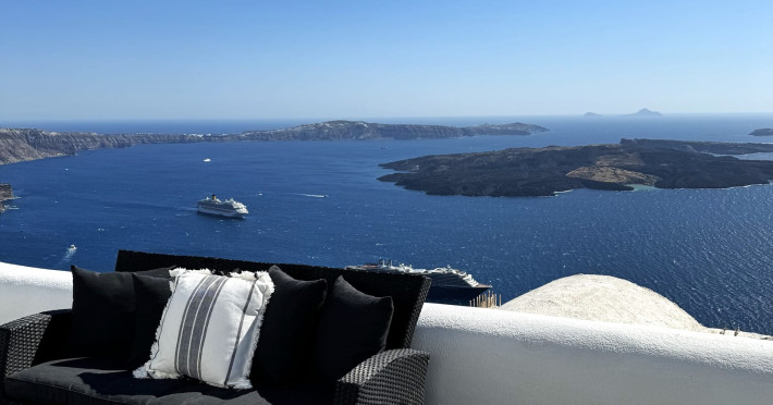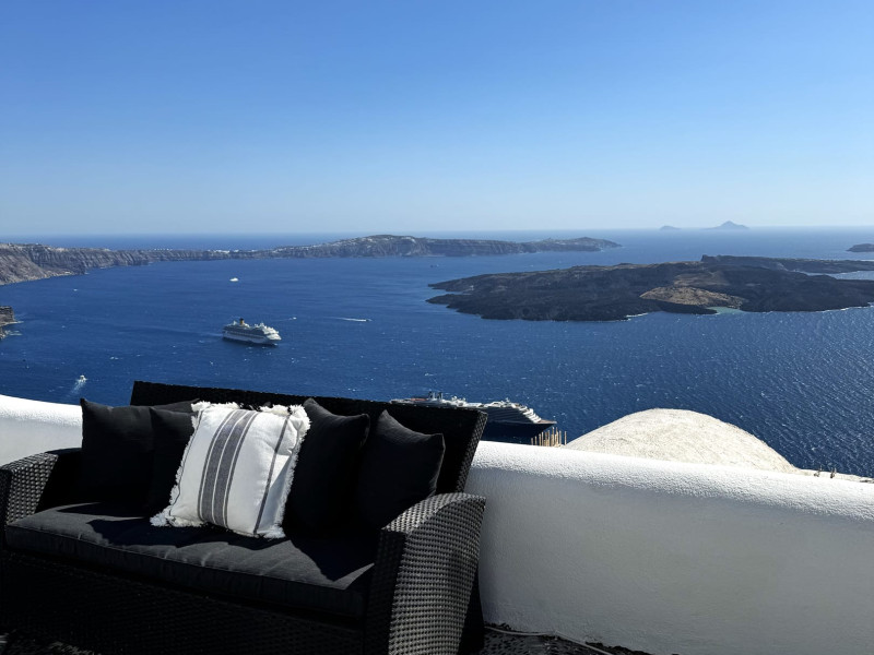 Perched majestically overlooking the azure Agean Sea, each villa boasts a private terrace with outdoor jacuzzi , inviting you to savor every moment against the backdrop of Santorini's iconic Volcano.