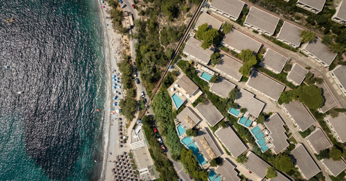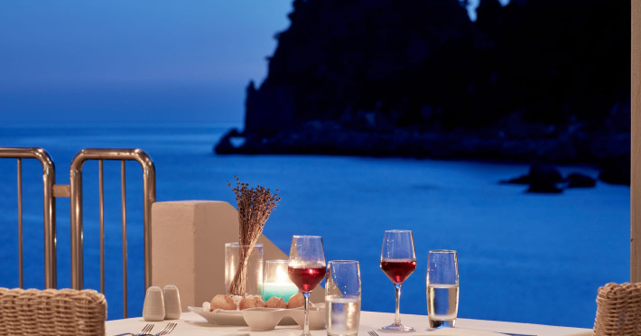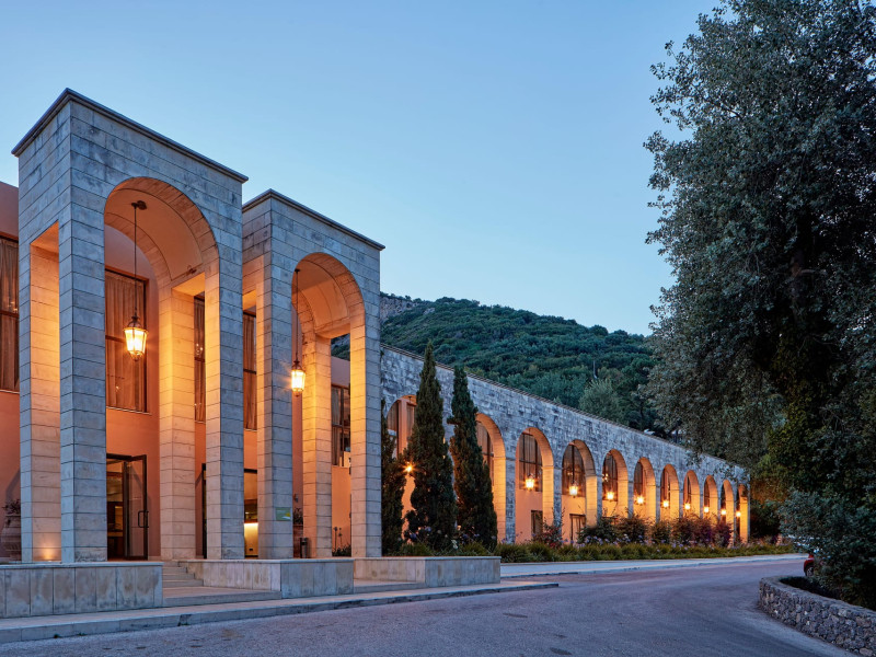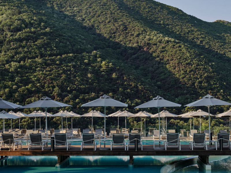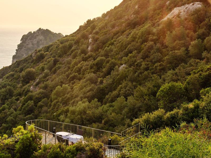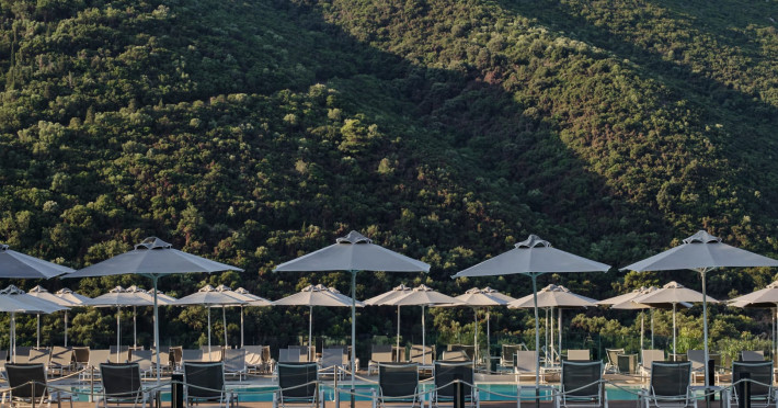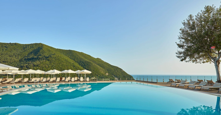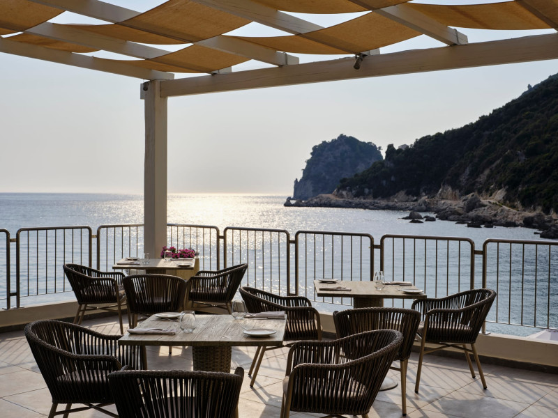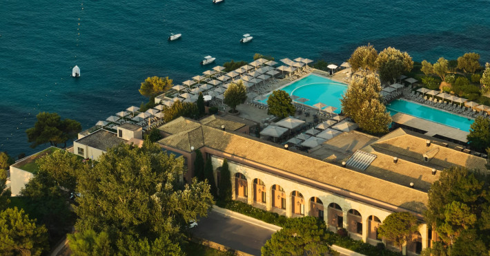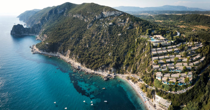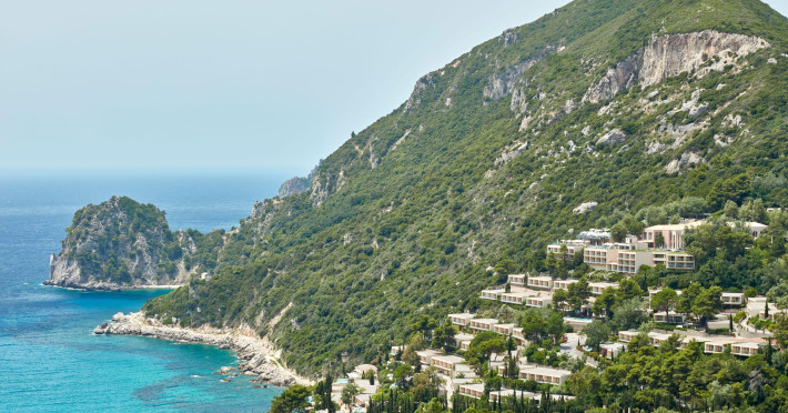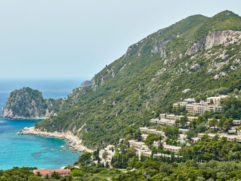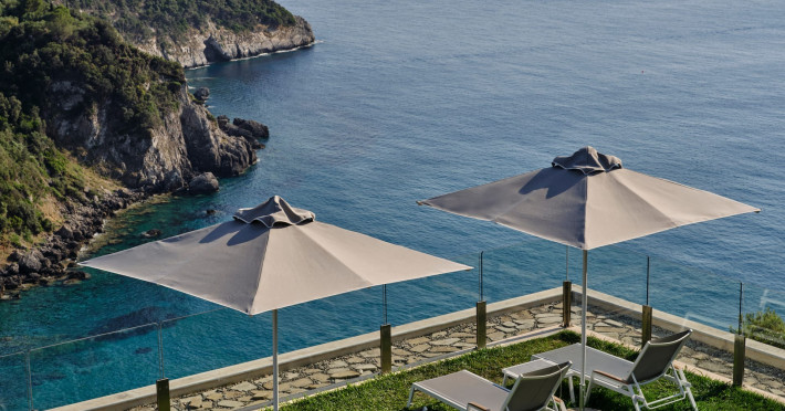 Overlooking the serene bay of western Corfu (Ermones Beach), about 25 minutes from Corfu airport and Corfu town and in very close proximity to Corfu’s Golf & Country Club, the island’s legendary resort and spa, comprises a series of intimate terraced buildings with double and deluxe rooms and suites, several with private pools. The resort spreads along 110 acres of cypress trees, eucalyptus trees and pine woods and cascades along breathtaking cliffs, offering spectacular views and dipping dramatically into the sparkling blue-turquoise Ionian Sea.