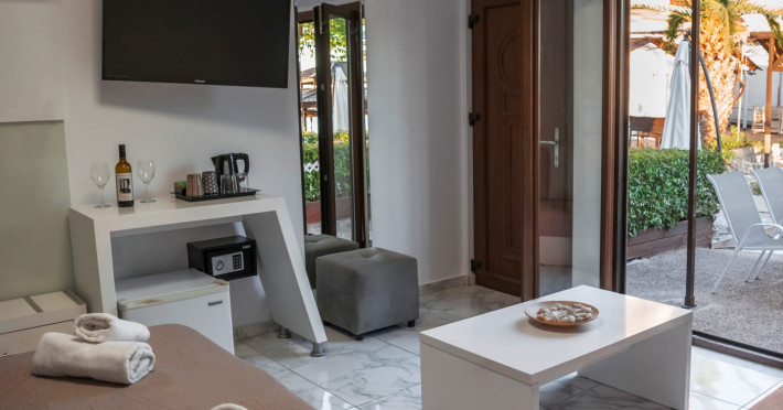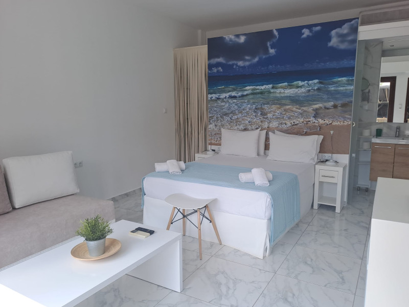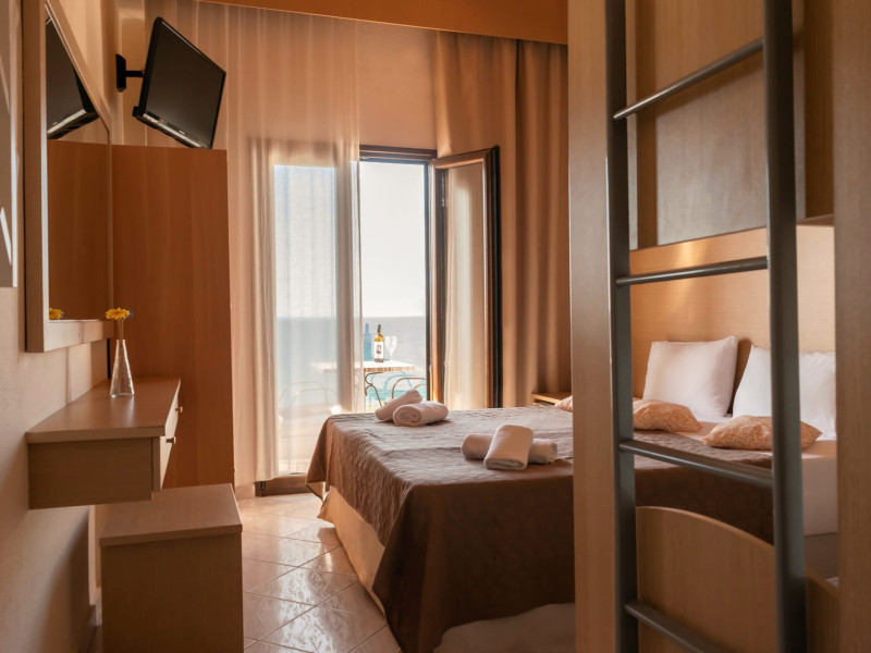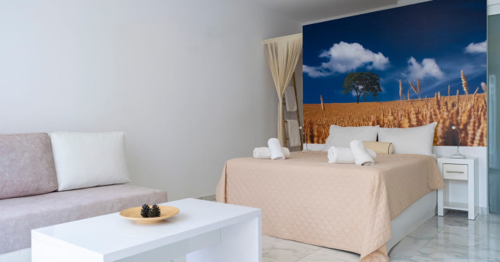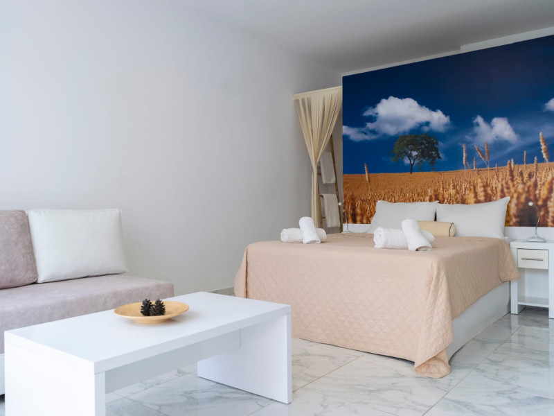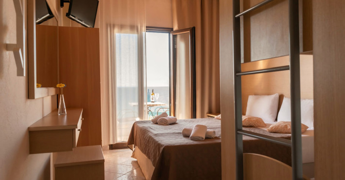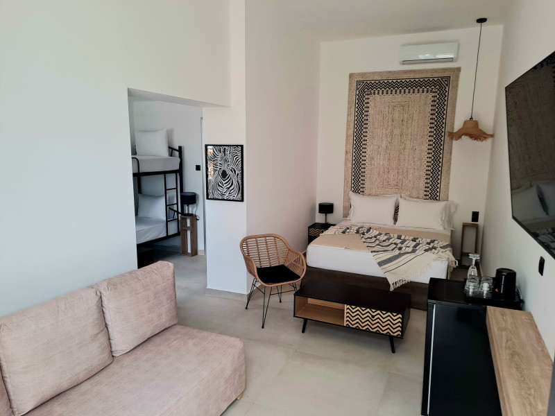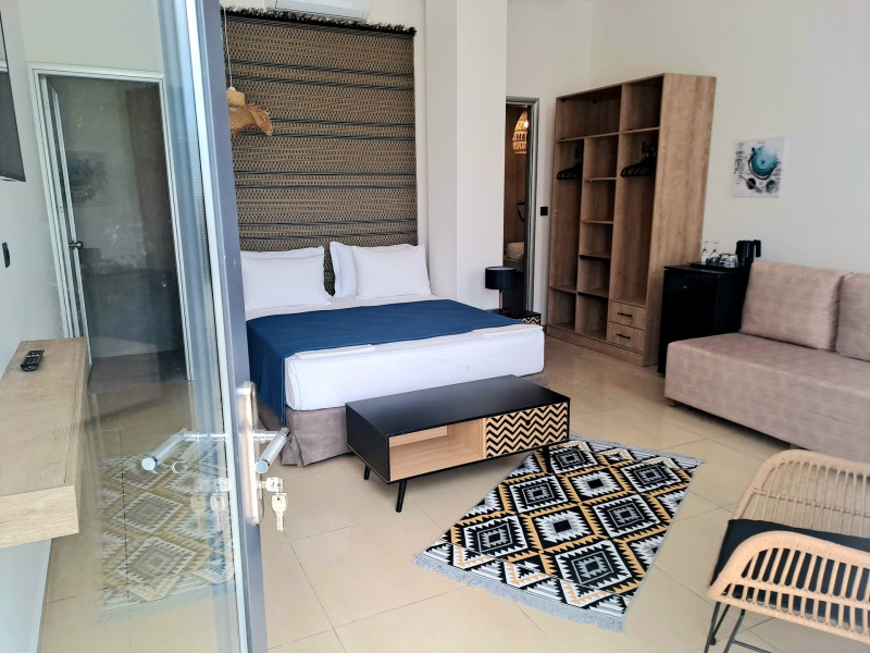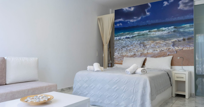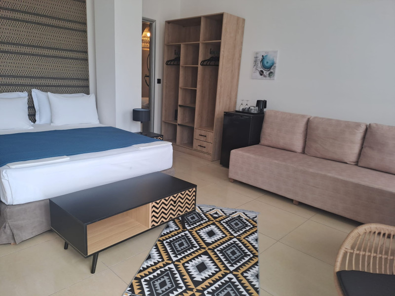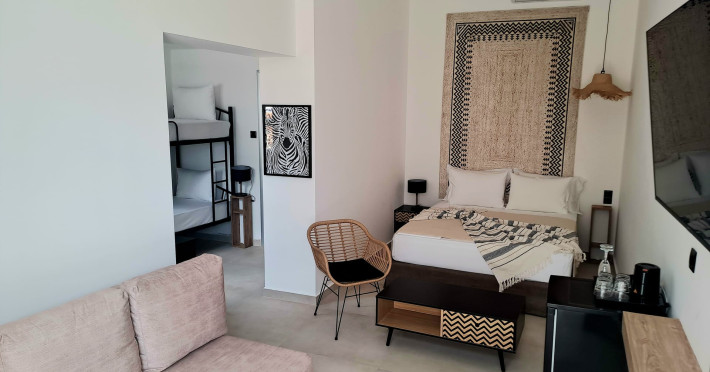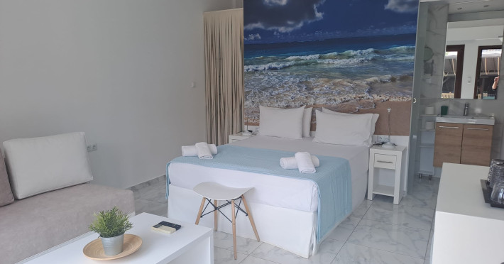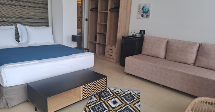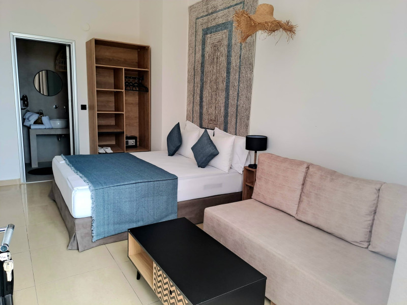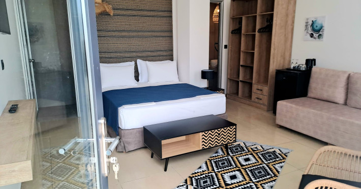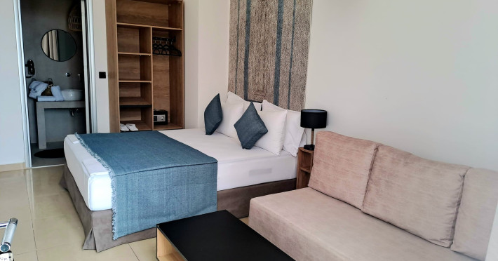 The brand new cabana suites consist of a double bed and a sofa, large enough when opened for 2 children or young adults or 1 bunk bed. Some of them with a wonderful sea view (extra charge upon request, subject to availability and additional charge +10%)