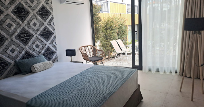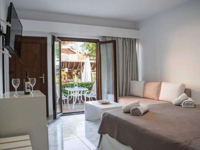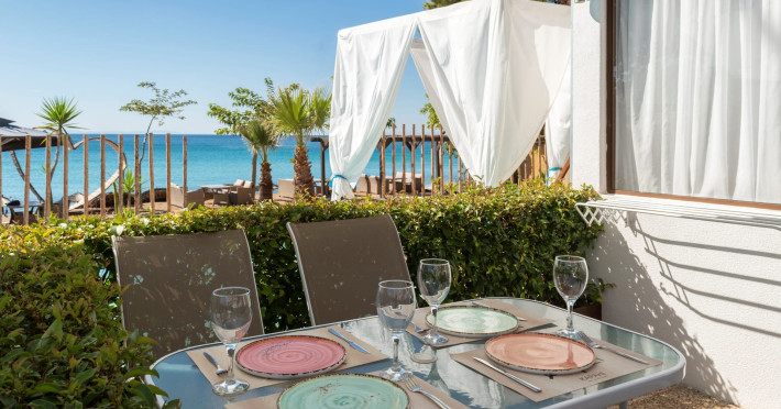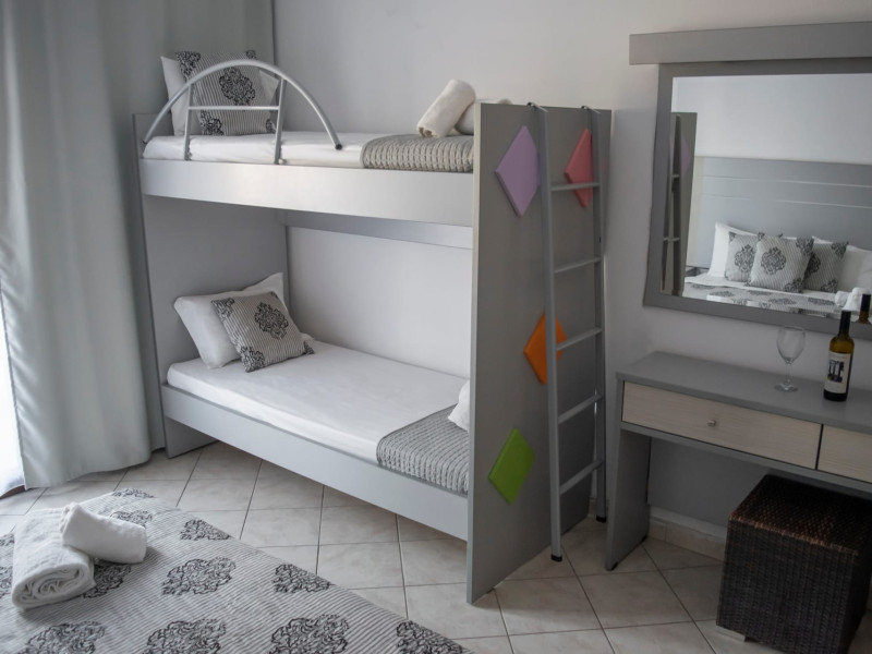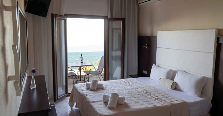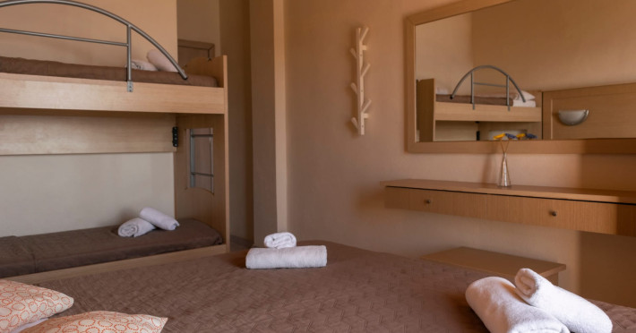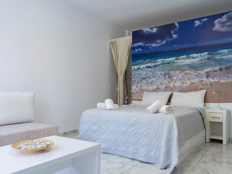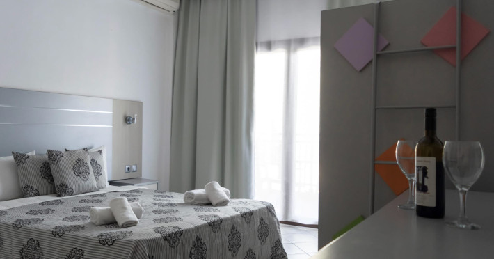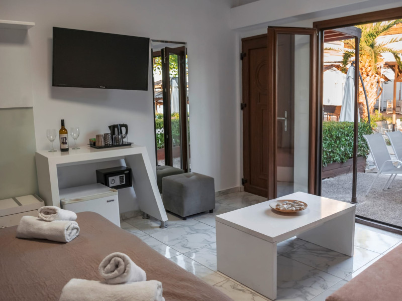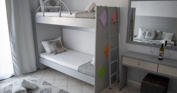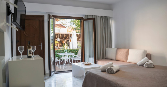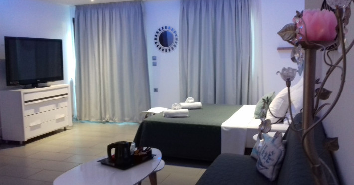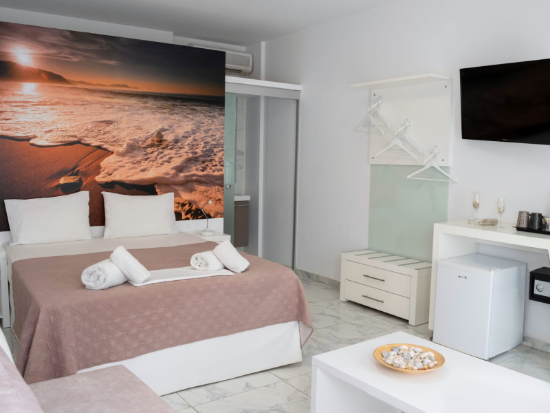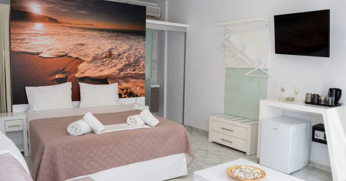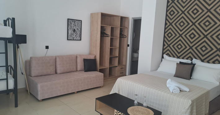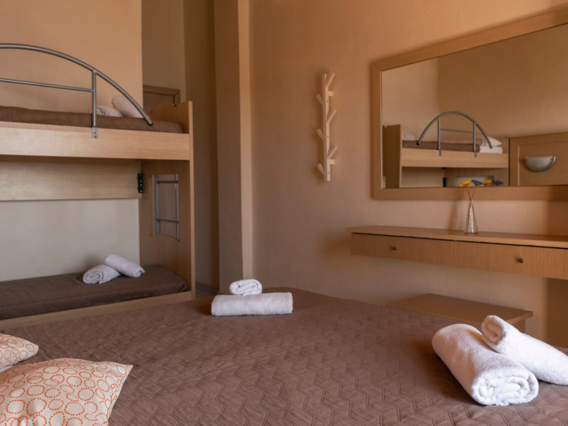 The brand new cabana suites consist of a double bed and a sofa, large enough when opened for 2 children or young adults or 1 bunk bed. Some of them with a wonderful sea view (extra charge upon request, subject to availability and additional charge +10%)