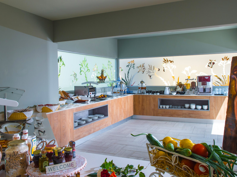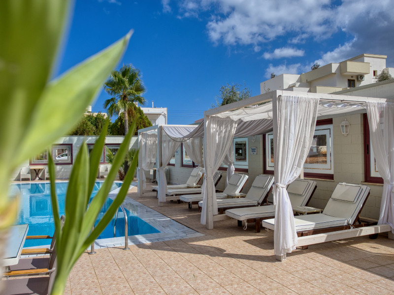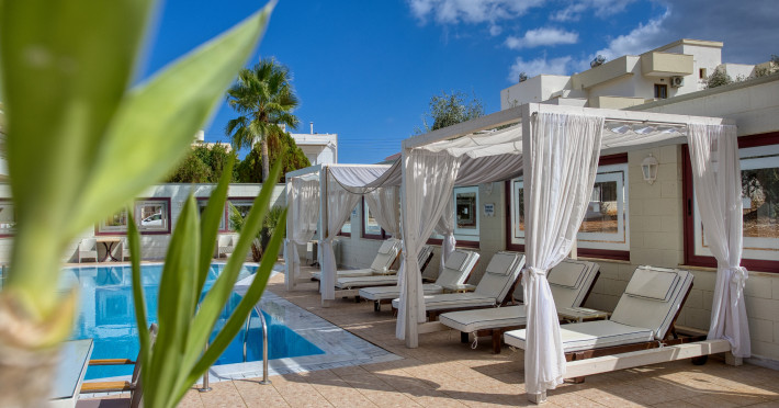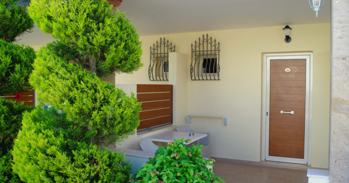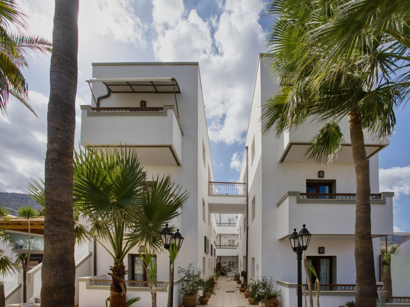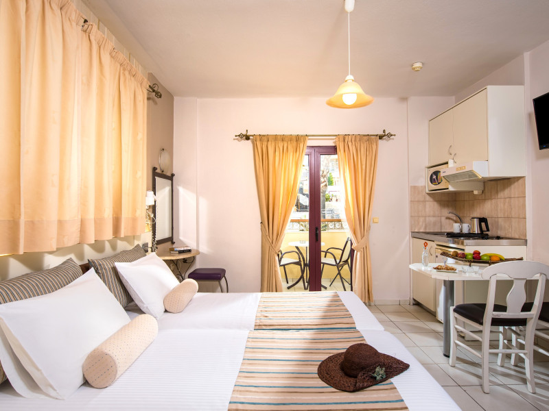 Surrounded by a lush garden and sparkling pool, the hotel offers the perfect blend of relaxation and convenience. The studios and apartments at Bella Elena are a testament to thoughtful design, blending modern and traditional elements in earthy tones. Each room opens to a furnished balcony offering serene views of the pool or the majestic mountains. The well-equipped kitchen or kitchenette in each unit ensures a homely feel, while amenities like a TV, safe, and hairdryer provide the comforts of modern living.