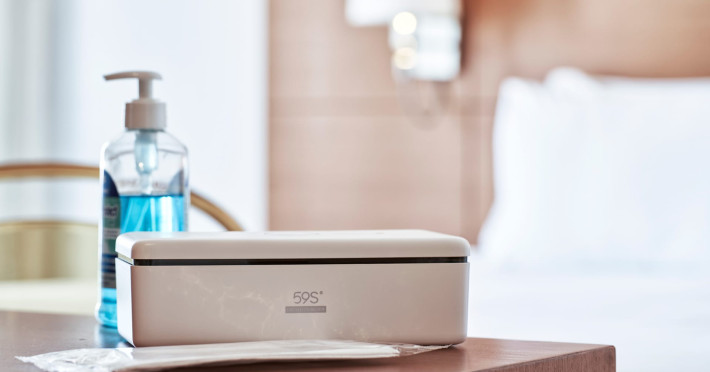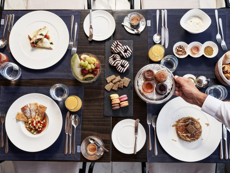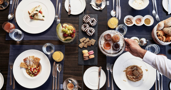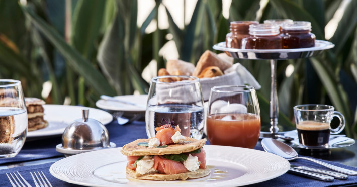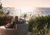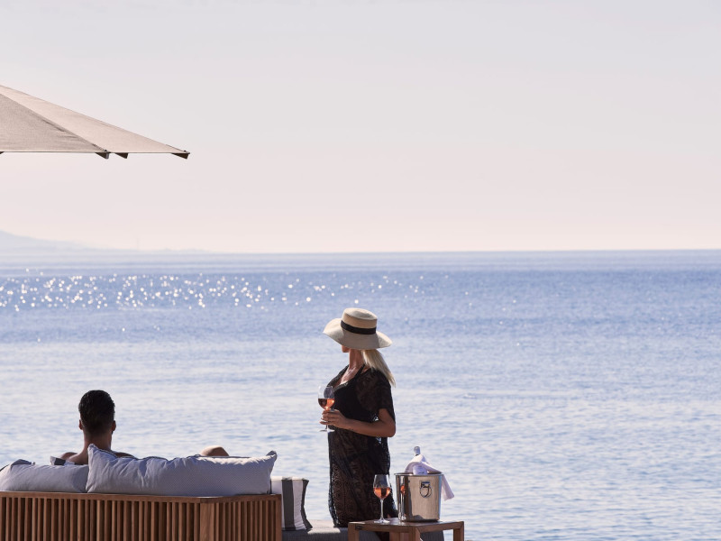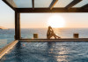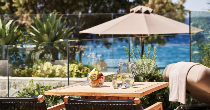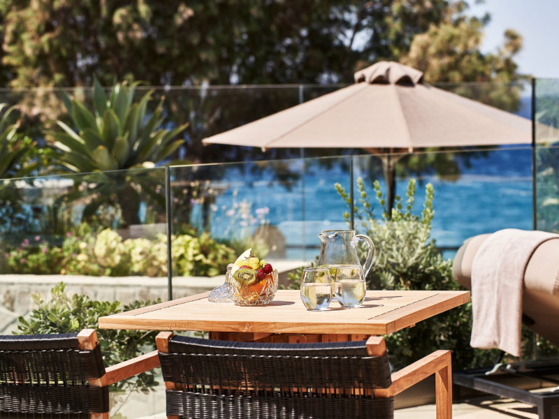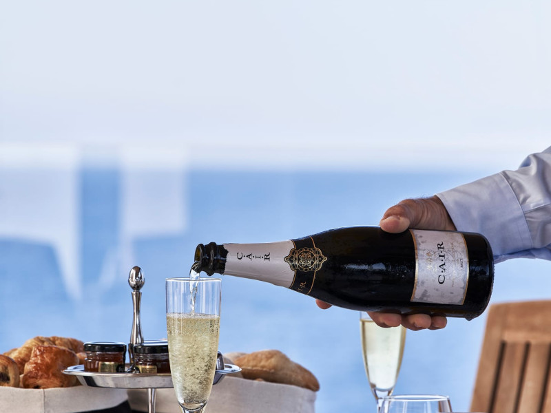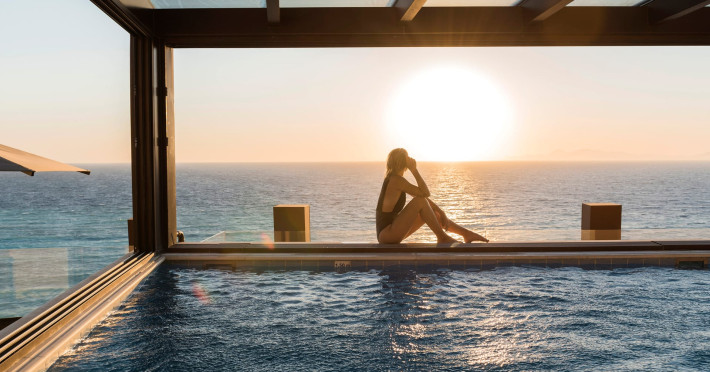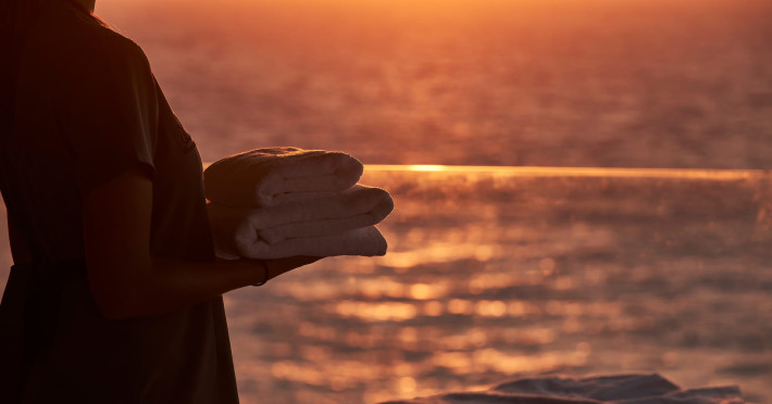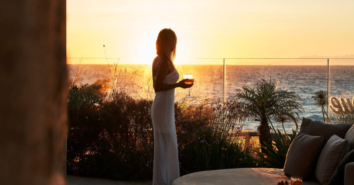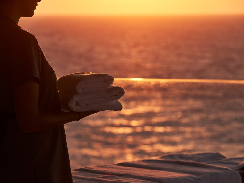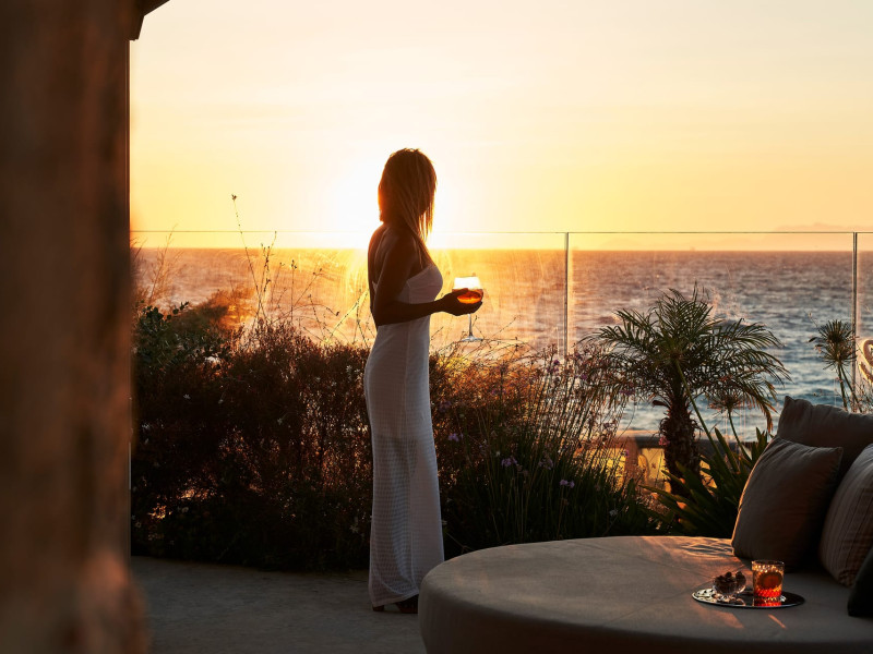 In-room private dining during Sunset Hour, with high-end menus and breathtaking views to the Sea and the setting Sun.