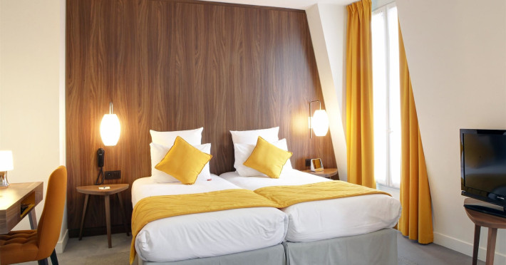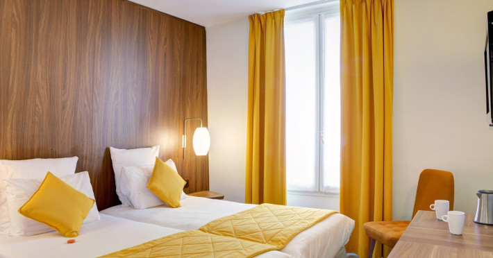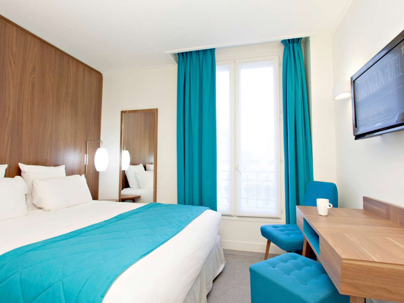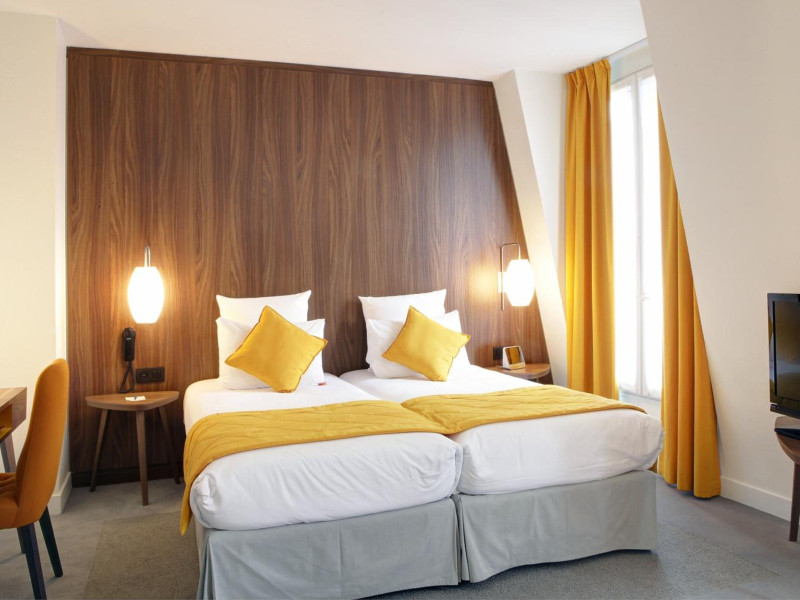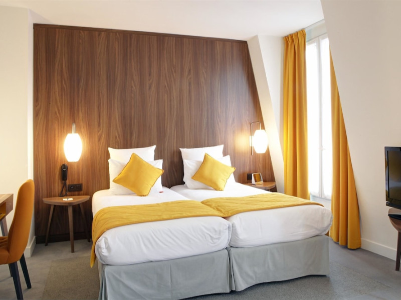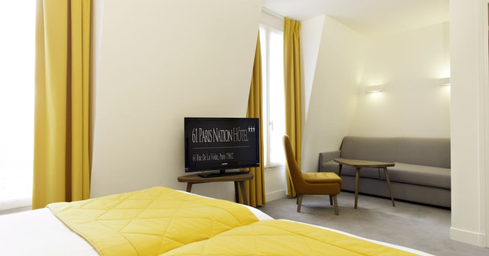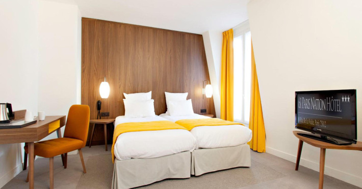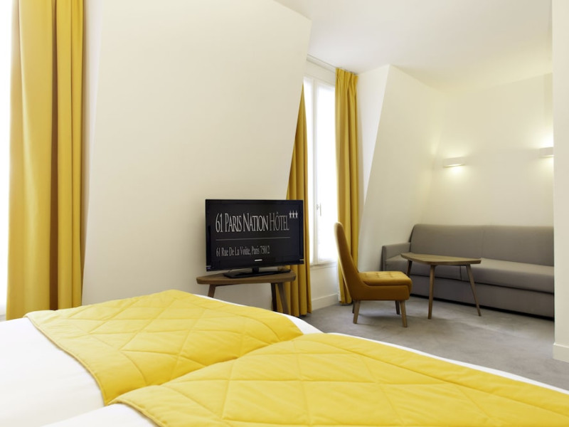 The Best Western Plus 61 Paris Nation Hotel, with a retro-chic 1960s design, is located near Place de la Nation, Gare de Lyon, and the Bastille neighborhood. This eco-certified hotel offers 48 soundproofed, air-conditioned guestrooms with free WiFi, satellite TV, a phone, a desk, and a private bathroom with a rainfall showerhead and complimentary toiletries. Conveniences include a laptop-compatible safe. Some rooms offer courtyard views. A buffet breakfast is available daily in the breakfast room or via room service, with an express breakfast option also available. The hotel features a bar/lounge, coffee shop/cafe, concierge services, a computer station, express check-out, complimentary newspapers in the lobby, and luggage storage. The 24-hour reception offers a ticket reservation service. Porte de Vincennes Metro Station is nearby, providing direct access to the Louvre Museum and the Champs-Elysées. The RER offers direct transport to Disneyland and La Défense. Paris Orly Airport (ORY) is 16.7 km away, and Paris Charles de Gaulle Airport (CDG) is 29.7 km away; the hotel prefers Paris Charles de Gaulle Airport (CDG). Nearby attractions include Bois de Vincennes and Père Lachaise Cemetery. The Best Western Plus 61 Paris Nation is a Tourist hotel. The nightlife/restaurants are easily accessible by taxi or bus from the hotel.