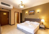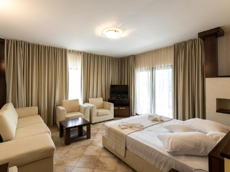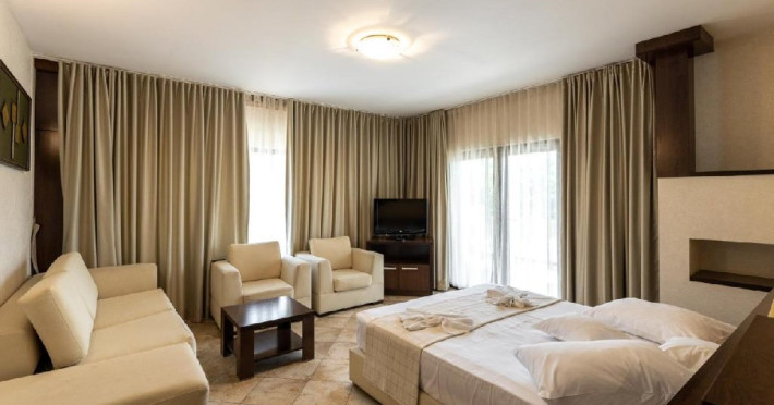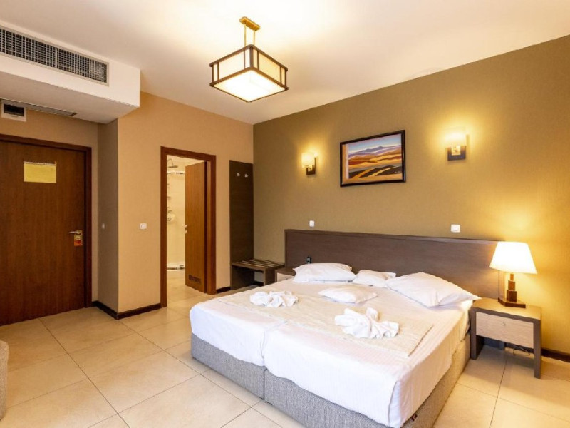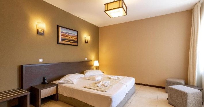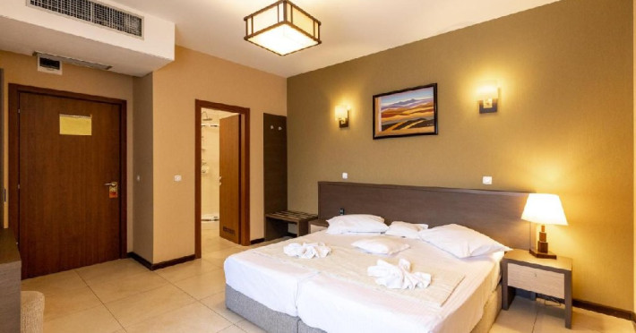 Camerele duble, aproximativ 23 mp, sunt dotate cu pat matrimonial (160x200), LCD tv, wi fi, aer conditionat, seif, minibar, incalzire centrala, baie cu cabina de dus, uscator de par, cosmetice hoteliere, balcon. Apartamentele, aproximativ 52 mp, sunt compuse din living cu canapea extensibila si dormitor cu pat matrimonial (160x200) sau doua paturi twin unite (90x200), baie cu cabina de dus si balcon. Camerele sunt separate cu usa si ambele sunt dotate cu TV si aer conditionat. Apartamentele dispun de wi fi, minibar, seif, incalzire centrala, uscator de par, cosmetice hoteliere. Sunt situate la etajul 1 si au vedere la mare. Patul suplimentar este de tip pliant.