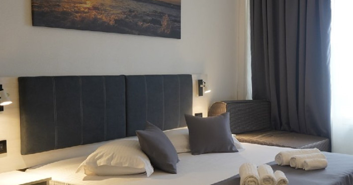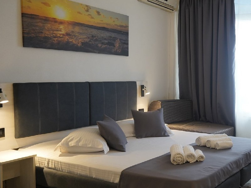 Dotari camere Camere duble - au o suprafata de aproximativ 19 mp si ofera vedere la mare sau la piscina/gradina. Sunt dotate cu baie proprie cu dus, TV, minibar, internet, telefon international direct, aer conditionat si balcon. Toate camerele au fost renovate in 2023 si dispun de doua paturi twin unite (80x190 cm) si un fotoliu extensibil. Apartamente - au o suprafata intre 30 si 35 mp, cu vedere panoramica spre mare. Sunt formate din living cu canapea extensibila pentru 2 persoane si dormitor cu pat matrimonial (160x200 cm), baie proprie cu dus, TV, minibar, internet, telefon international direct, aer conditionat si balcon. Camerele sunt separate prin usa. Este strict interzisa introducerea si utilizarea in camerele hotelului a aparaturii electrocasnice (storcator de fructe, cafetiera, fierbator, plita electrica etc.). Facilitati copii: In camera cu 2 adulti: - primul copil si al doilea copil intre ( 0 - 6.99 ani), beneficiaza de gratuitate 100% la cazare si masa, cu fotoliu extensibil inclus ( max 1/camera); - copiii cu varsta cuprinsa intre ( 7 - 17.99 ani) achita supliment de cazare si masa conform ofertei cu fotoliu extensibil inclus ( max 1/camera); - persoanele peste 18 ani sunt considerate adulti si achita loc integral in camera.