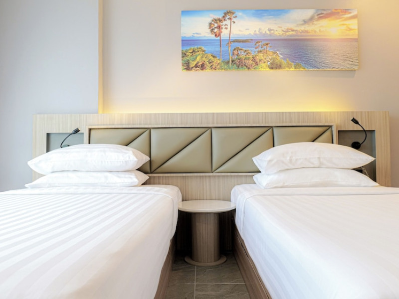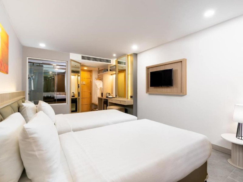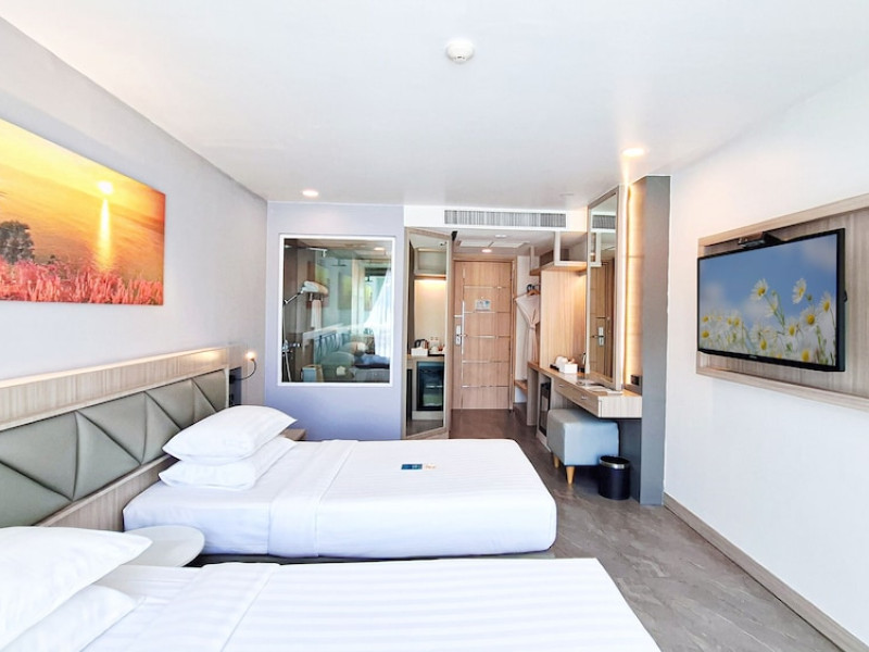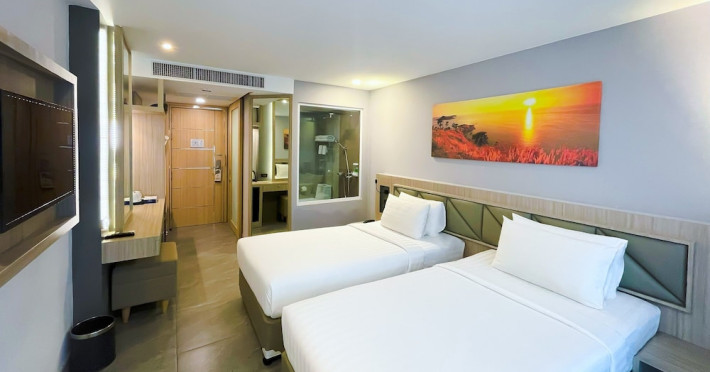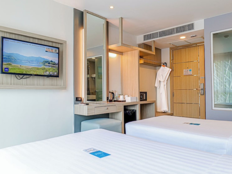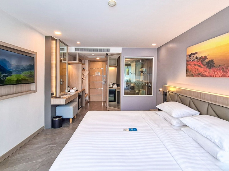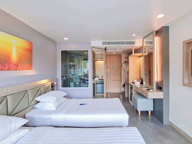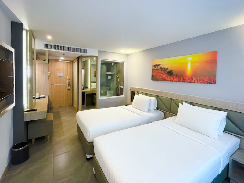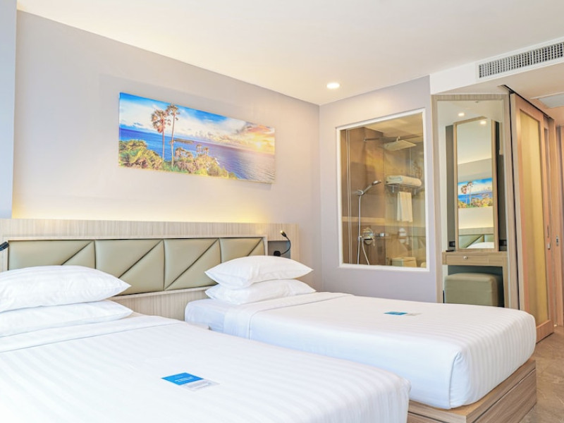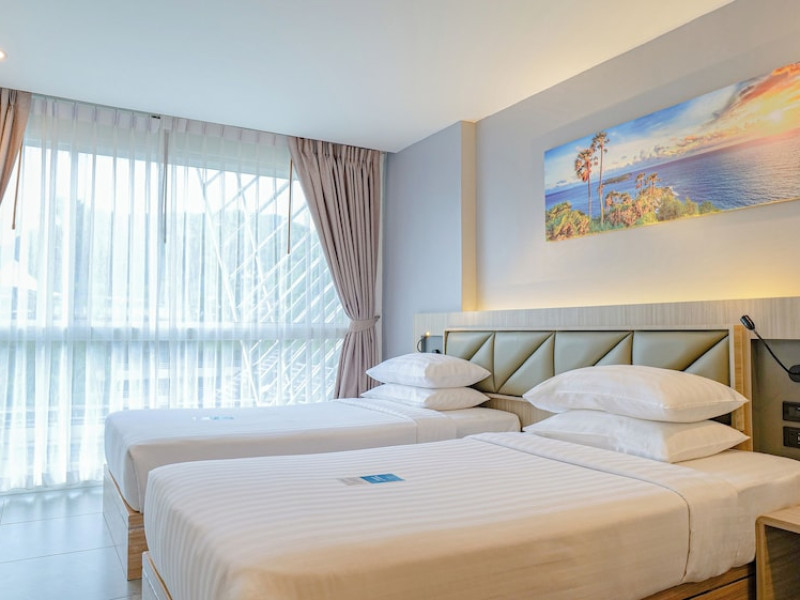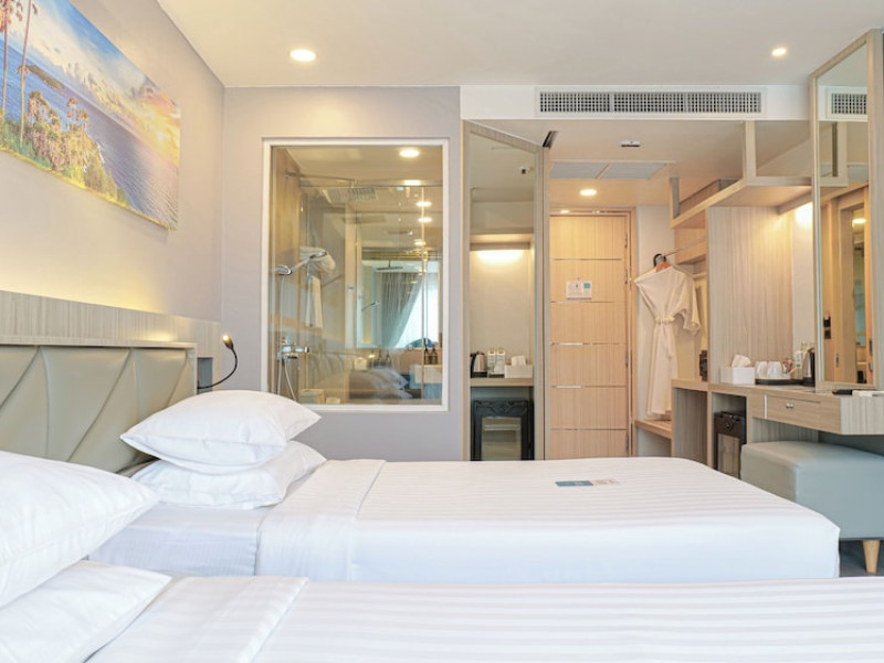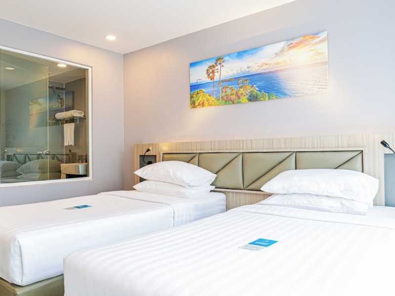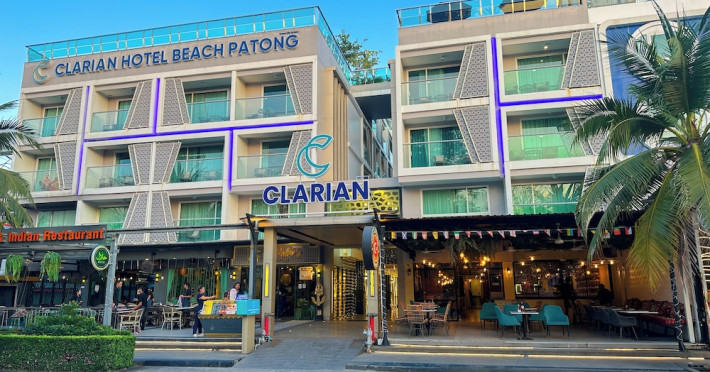 Clarian Hotel Beach Patong, located in the heart of Patong on Phuket's west coast, offers a mix of modern design and natural elements. It is a short walk from Patong Beach and Bangla Road. The hotel features air-conditioned rooms with minibars, Smart TVs, memory foam beds with Frette Italian sheets, digital programming, smart speakers, and complimentary Wi-Fi. Bathrooms include showers with rainfall showerheads and complimentary toiletries. Guests can enjoy two outdoor swimming pools, a health club, and a sauna. Dining options include two restaurants, a coffee shop/cafe, a bar/lounge, and a swim-up bar. Buffet breakfast is available. Additional amenities include a 24-hour business center, concierge services, dry cleaning/laundry services, and airport/bus station shuttle services (surcharge). Nearby attractions include Patong Beach, Bangla Road, and Jungceylon Shopping Center. Phuket International Airport is approximately 32-35 km away. The Clarian Hotel Beach Patong is a hotel.