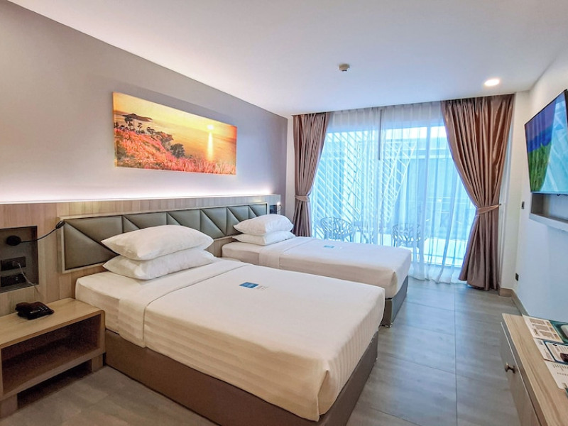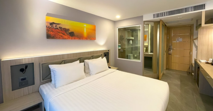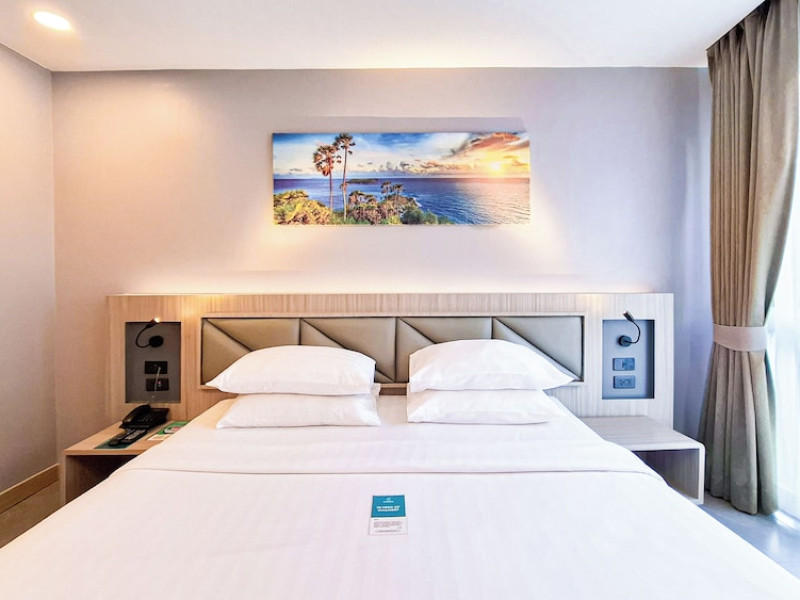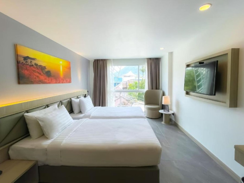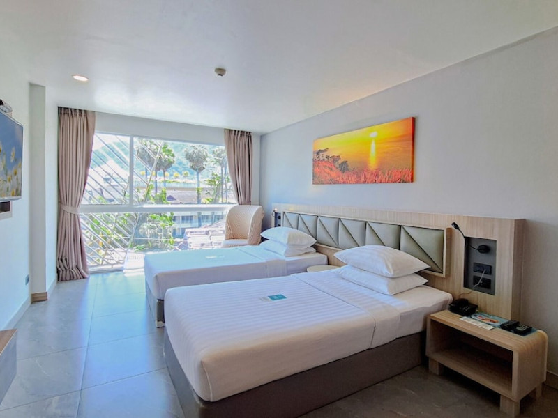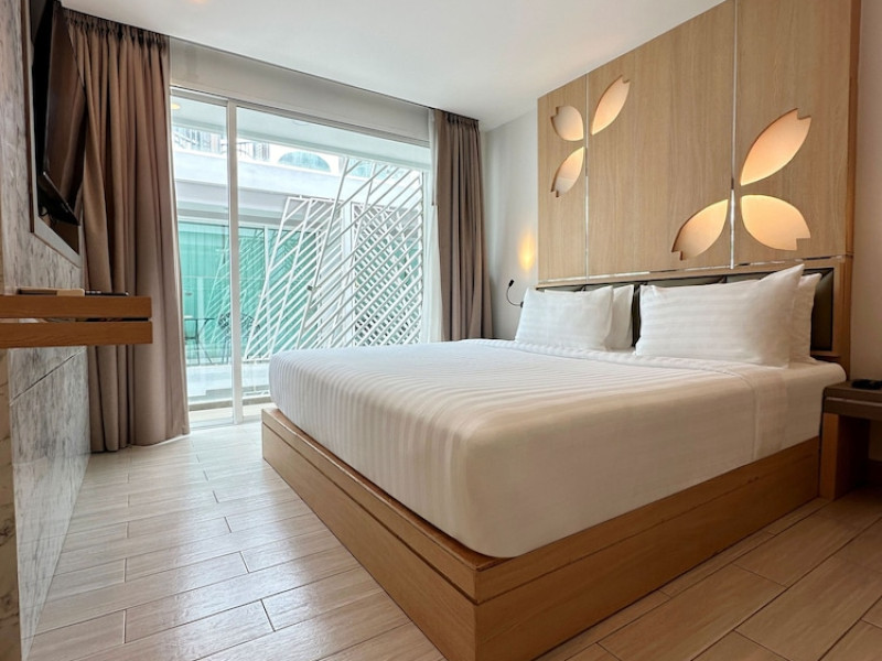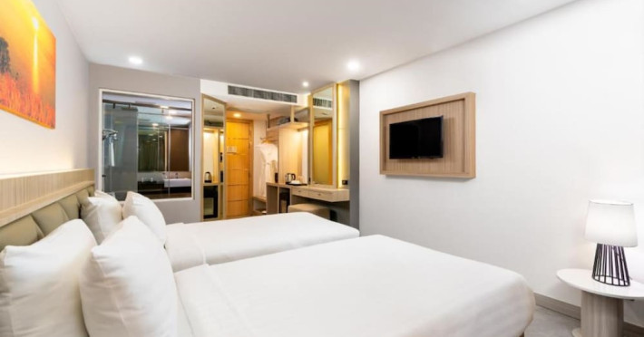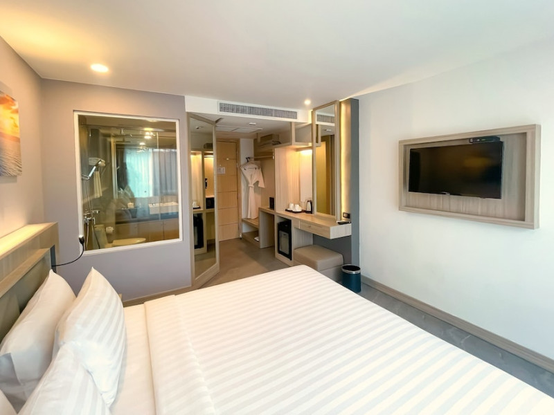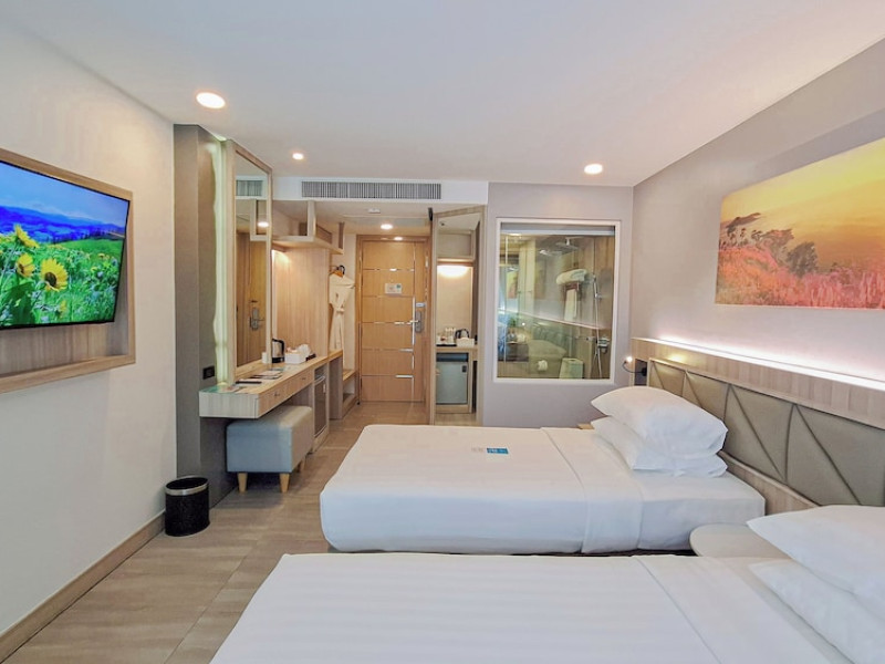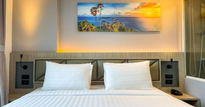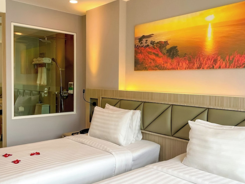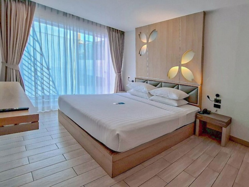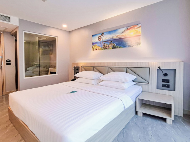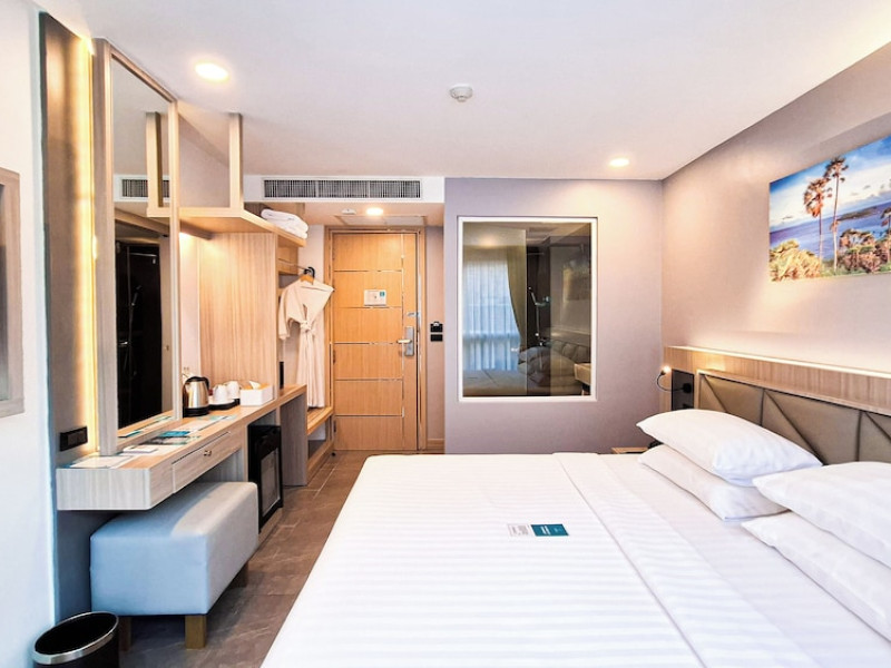 Clarian Hotel Beach Patong, located in the heart of Patong on Phuket's west coast, offers a mix of modern design and natural elements. It is a short walk from Patong Beach and Bangla Road. The hotel features air-conditioned rooms with minibars, Smart TVs, memory foam beds with Frette Italian sheets, digital programming, smart speakers, and complimentary Wi-Fi. Bathrooms include showers with rainfall showerheads and complimentary toiletries. Guests can enjoy two outdoor swimming pools, a health club, and a sauna. Dining options include two restaurants, a coffee shop/cafe, a bar/lounge, and a swim-up bar. Buffet breakfast is available. Additional amenities include a 24-hour business center, concierge services, dry cleaning/laundry services, and airport/bus station shuttle services (surcharge). Nearby attractions include Patong Beach, Bangla Road, and Jungceylon Shopping Center. Phuket International Airport is approximately 32-35 km away. The Clarian Hotel Beach Patong is a hotel.
