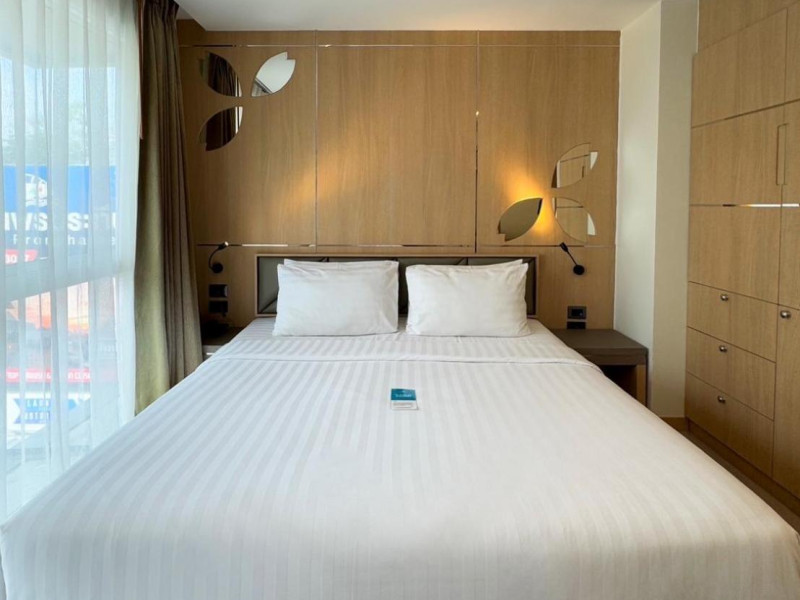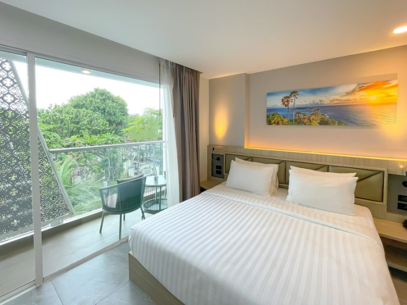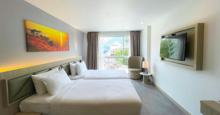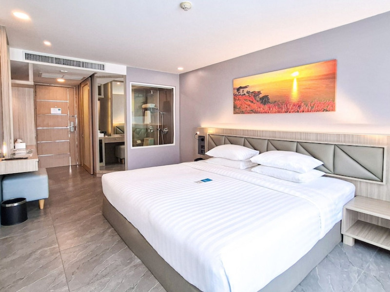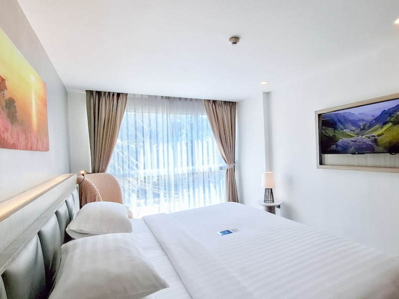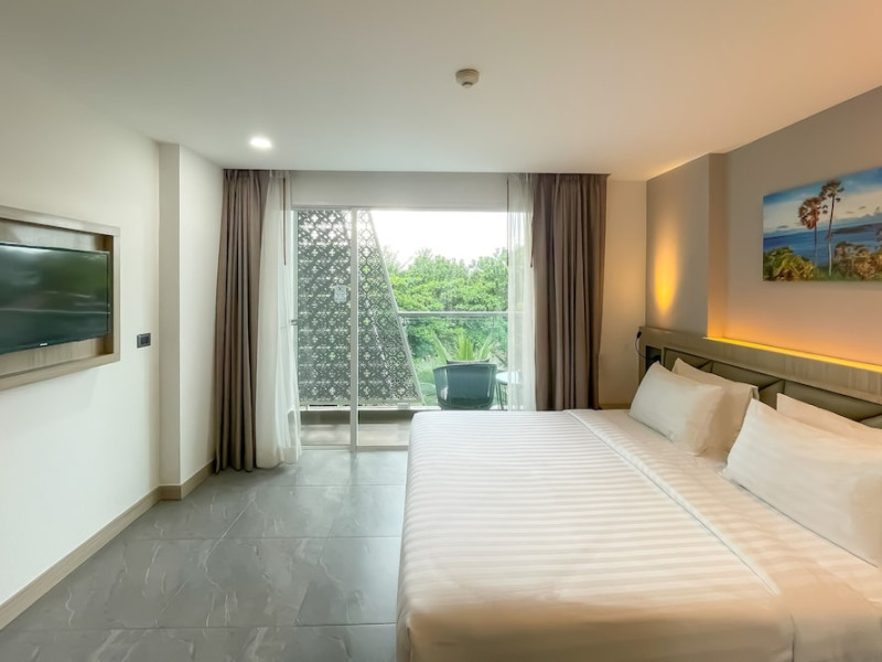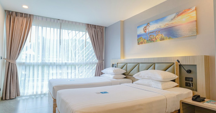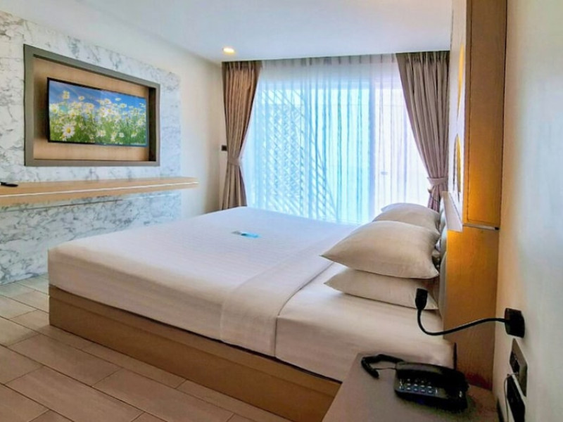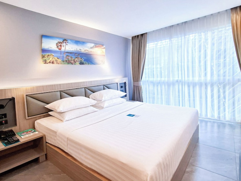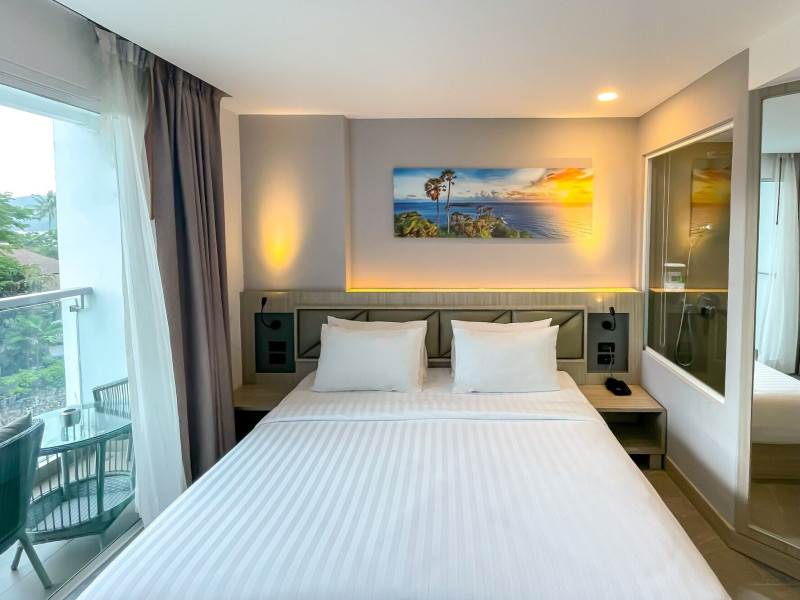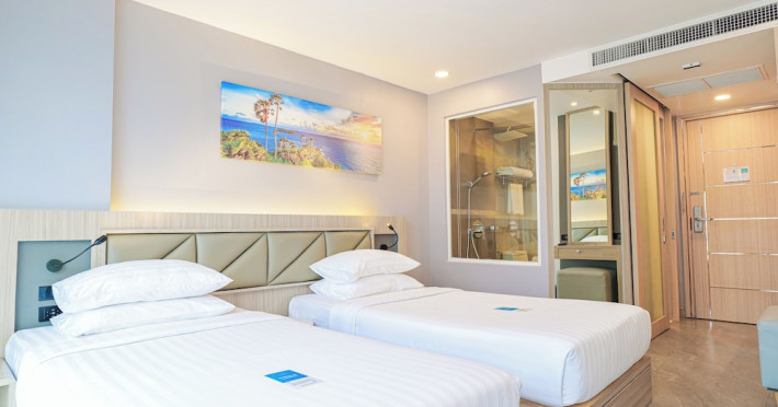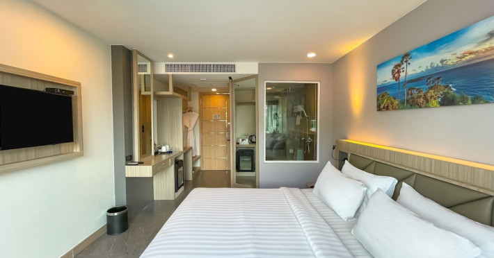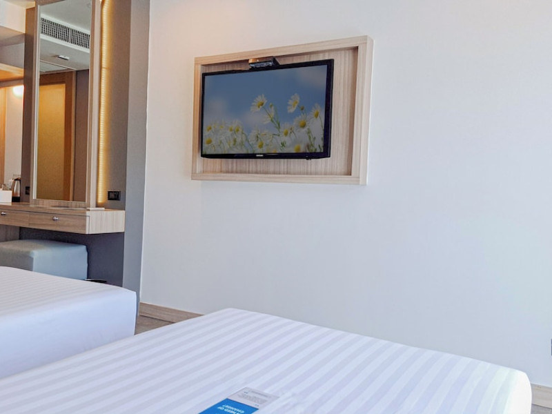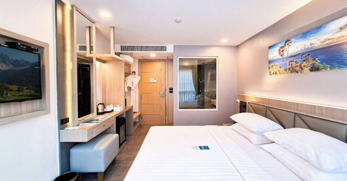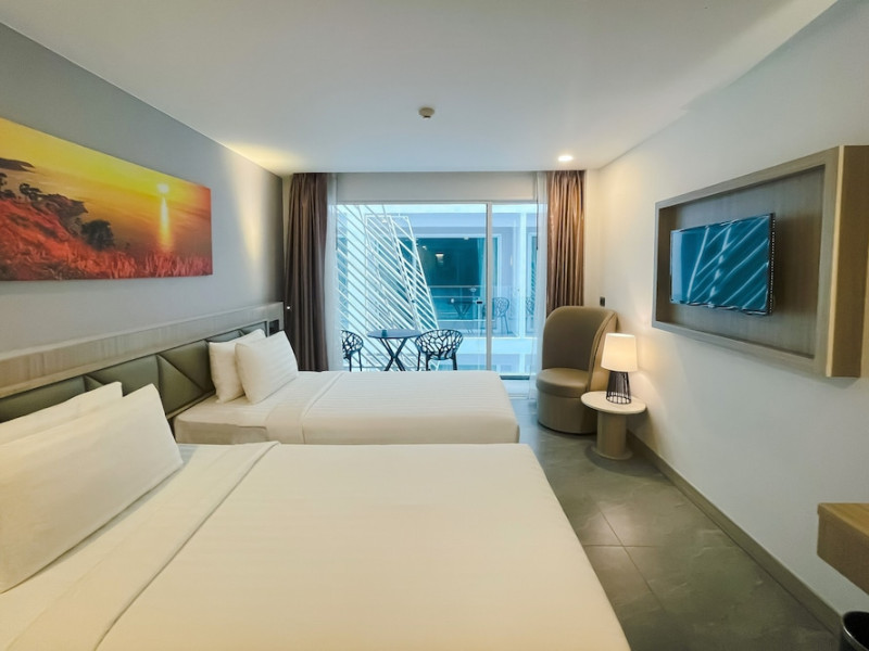 Clarian Hotel Beach Patong, located in the heart of Patong on Phuket's west coast, offers a mix of modern design and natural elements. It is a short walk from Patong Beach and Bangla Road. The hotel features air-conditioned rooms with minibars, Smart TVs, memory foam beds with Frette Italian sheets, digital programming, smart speakers, and complimentary Wi-Fi. Bathrooms include showers with rainfall showerheads and complimentary toiletries. Guests can enjoy two outdoor swimming pools, a health club, and a sauna. Dining options include two restaurants, a coffee shop/cafe, a bar/lounge, and a swim-up bar. Buffet breakfast is available. Additional amenities include a 24-hour business center, concierge services, dry cleaning/laundry services, and airport/bus station shuttle services (surcharge). Nearby attractions include Patong Beach, Bangla Road, and Jungceylon Shopping Center. Phuket International Airport is approximately 32-35 km away. The Clarian Hotel Beach Patong is a hotel.