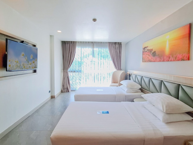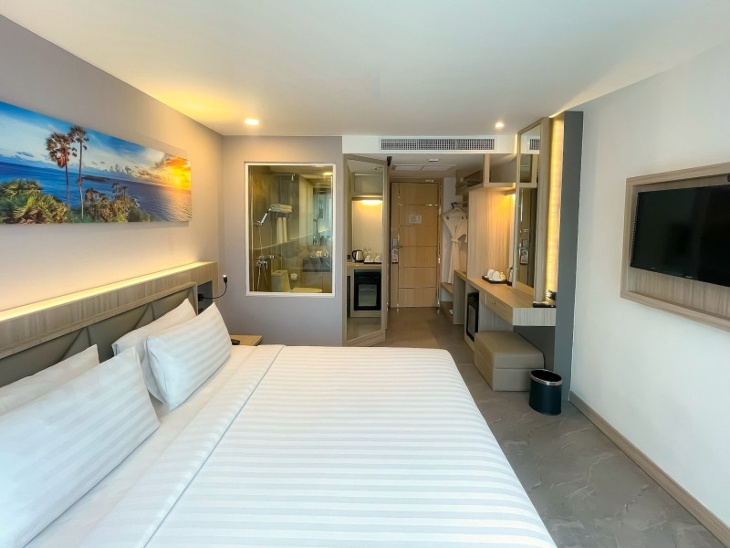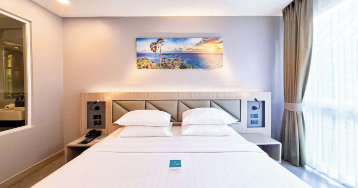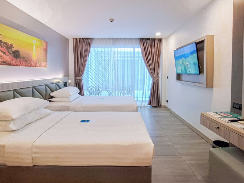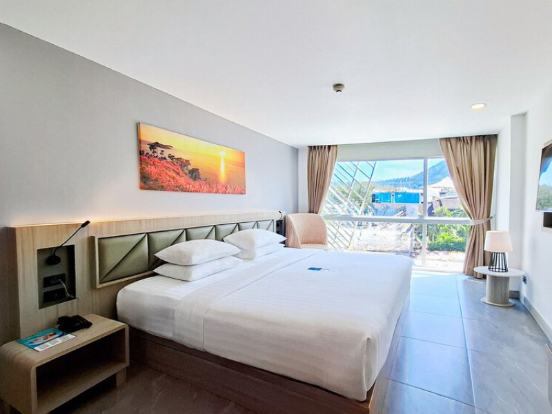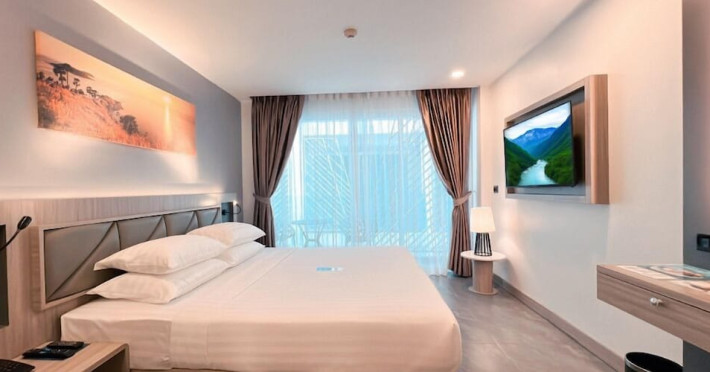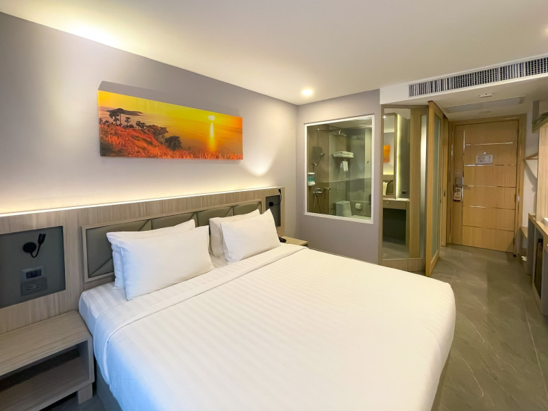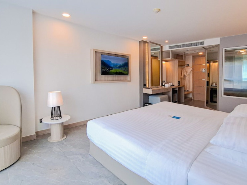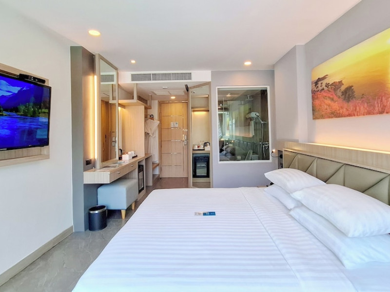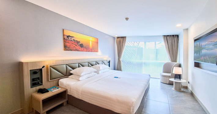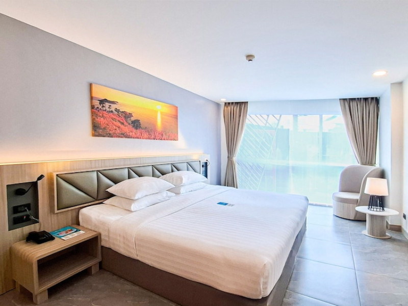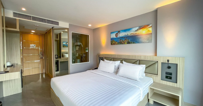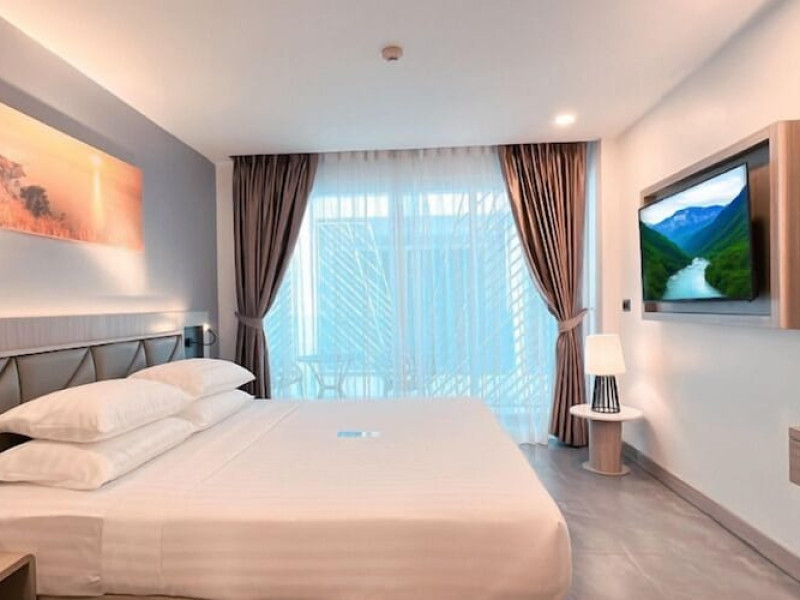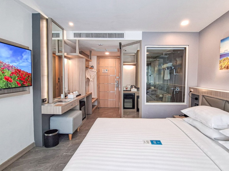 Clarian Hotel Beach Patong, located in the heart of Patong on Phuket's west coast, offers a mix of modern design and natural elements. It is a short walk from Patong Beach and Bangla Road. The hotel features air-conditioned rooms with minibars, Smart TVs, memory foam beds with Frette Italian sheets, digital programming, smart speakers, and complimentary Wi-Fi. Bathrooms include showers with rainfall showerheads and complimentary toiletries. Guests can enjoy two outdoor swimming pools, a health club, and a sauna. Dining options include two restaurants, a coffee shop/cafe, a bar/lounge, and a swim-up bar. Buffet breakfast is available. Additional amenities include a 24-hour business center, concierge services, dry cleaning/laundry services, and airport/bus station shuttle services (surcharge). Nearby attractions include Patong Beach, Bangla Road, and Jungceylon Shopping Center. Phuket International Airport is approximately 32-35 km away. The Clarian Hotel Beach Patong is a hotel.