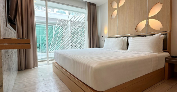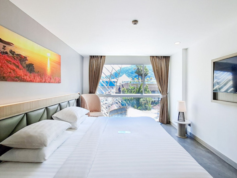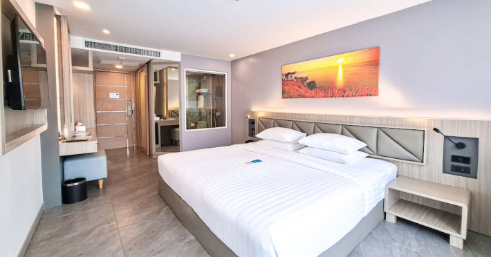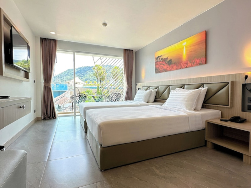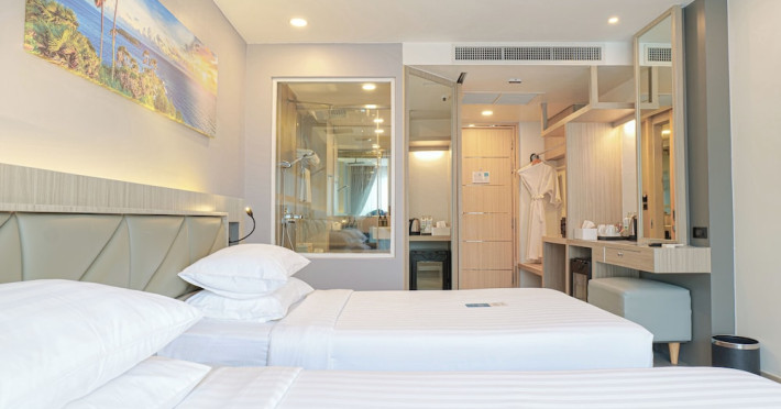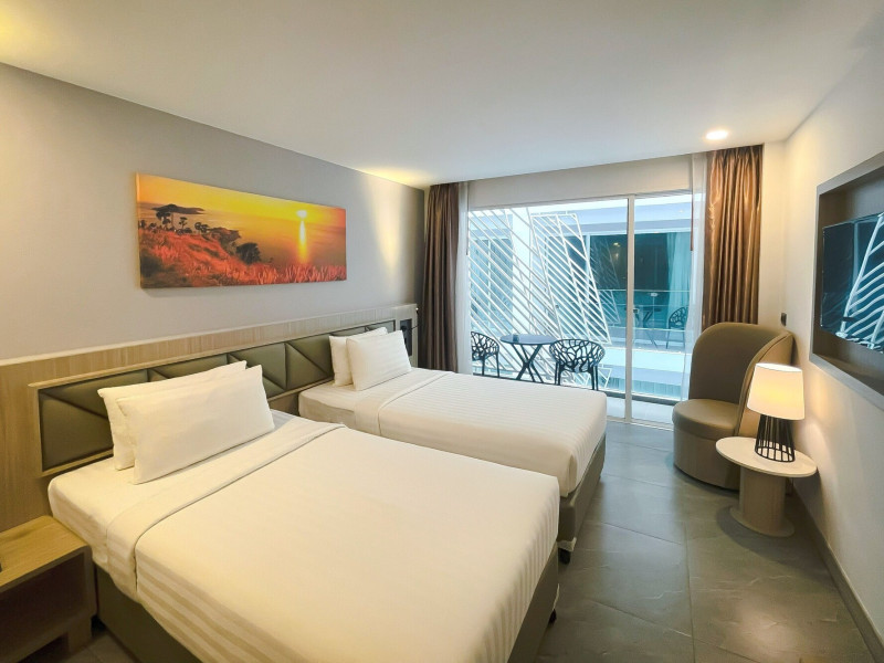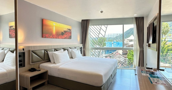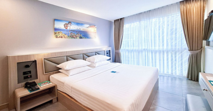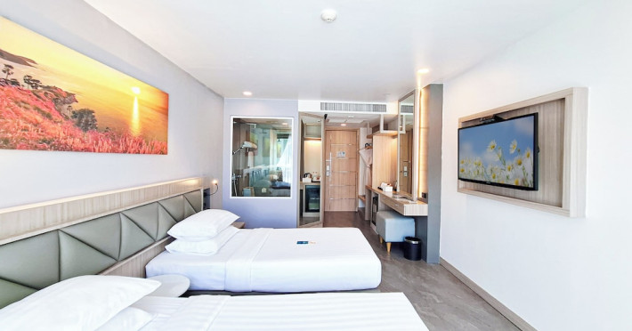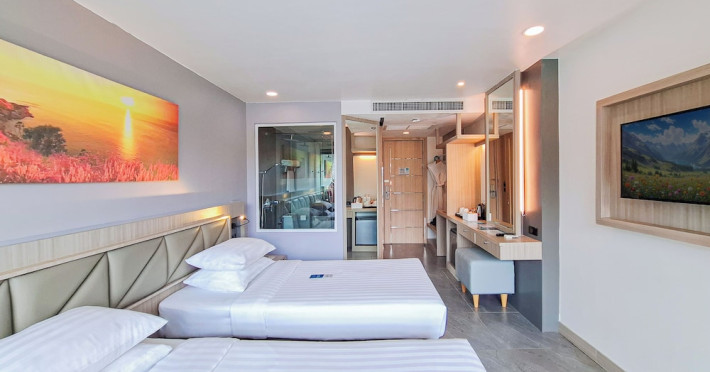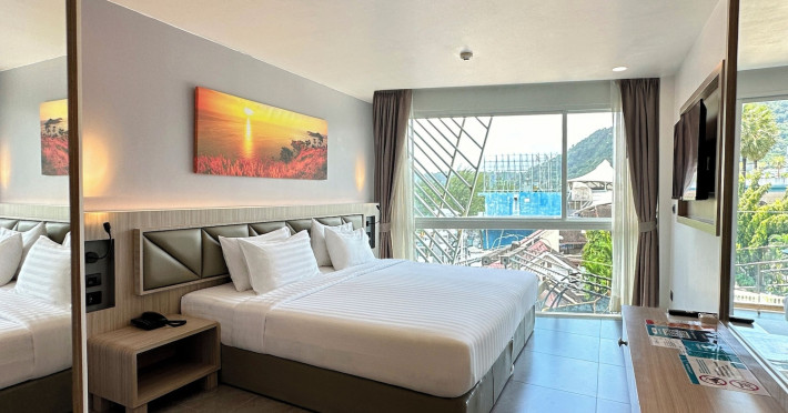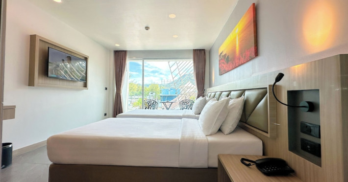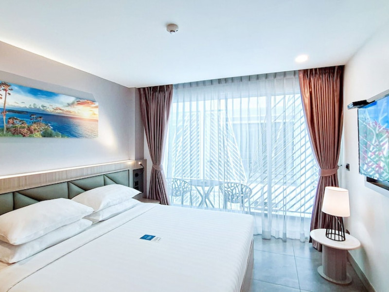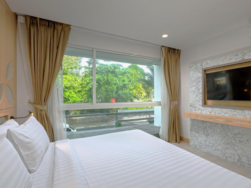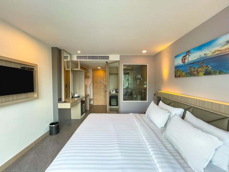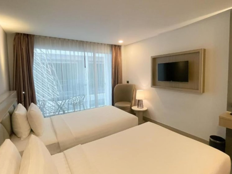 Clarian Hotel Beach Patong, located in the heart of Patong on Phuket's west coast, offers a mix of modern design and natural elements. It is a short walk from Patong Beach and Bangla Road. The hotel features air-conditioned rooms with minibars, Smart TVs, memory foam beds with Frette Italian sheets, digital programming, smart speakers, and complimentary Wi-Fi. Bathrooms include showers with rainfall showerheads and complimentary toiletries. Guests can enjoy two outdoor swimming pools, a health club, and a sauna. Dining options include two restaurants, a coffee shop/cafe, a bar/lounge, and a swim-up bar. Buffet breakfast is available. Additional amenities include a 24-hour business center, concierge services, dry cleaning/laundry services, and airport/bus station shuttle services (surcharge). Nearby attractions include Patong Beach, Bangla Road, and Jungceylon Shopping Center. Phuket International Airport is approximately 32-35 km away. The Clarian Hotel Beach Patong is a hotel.