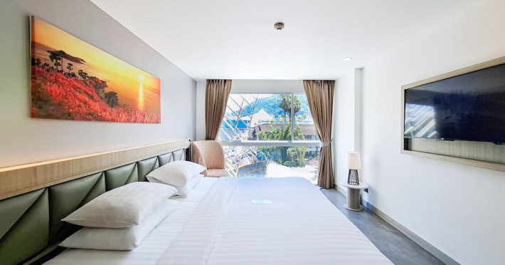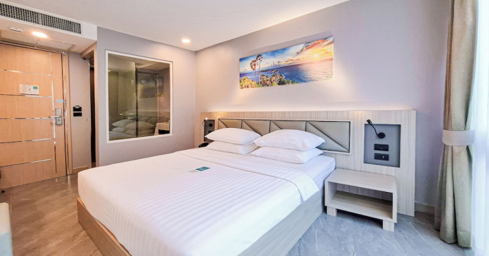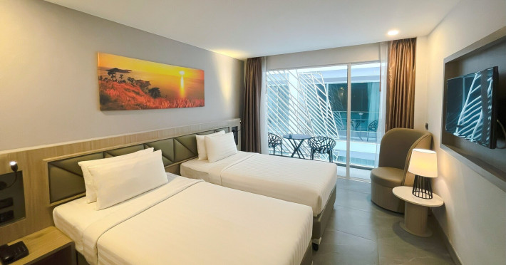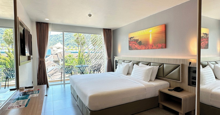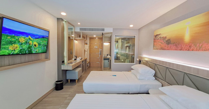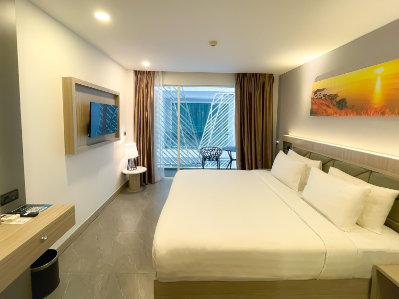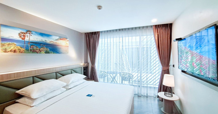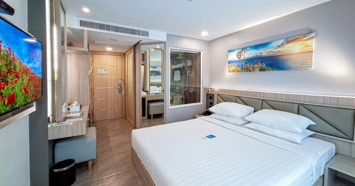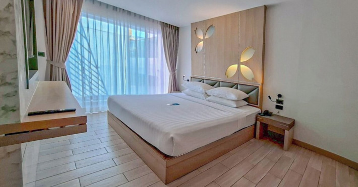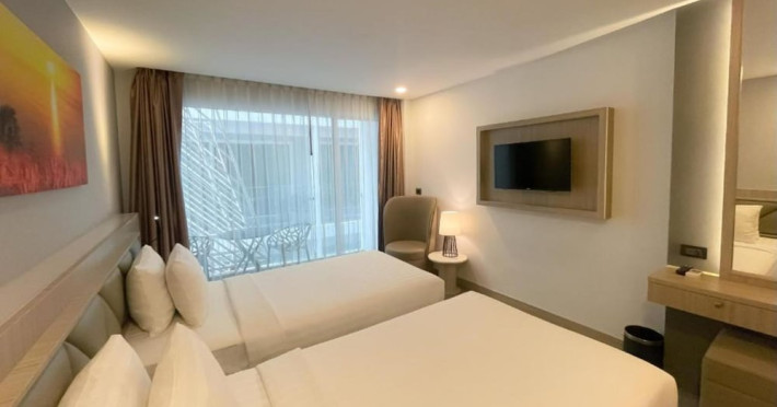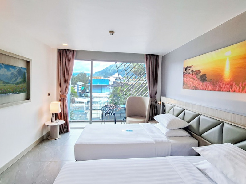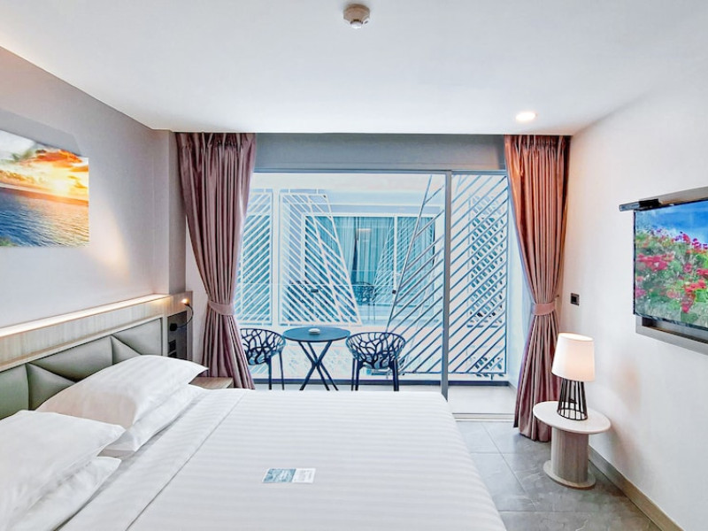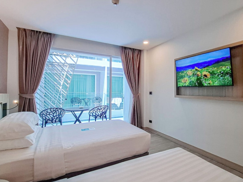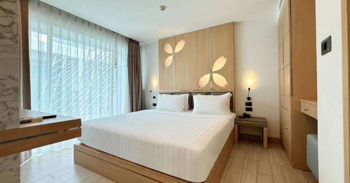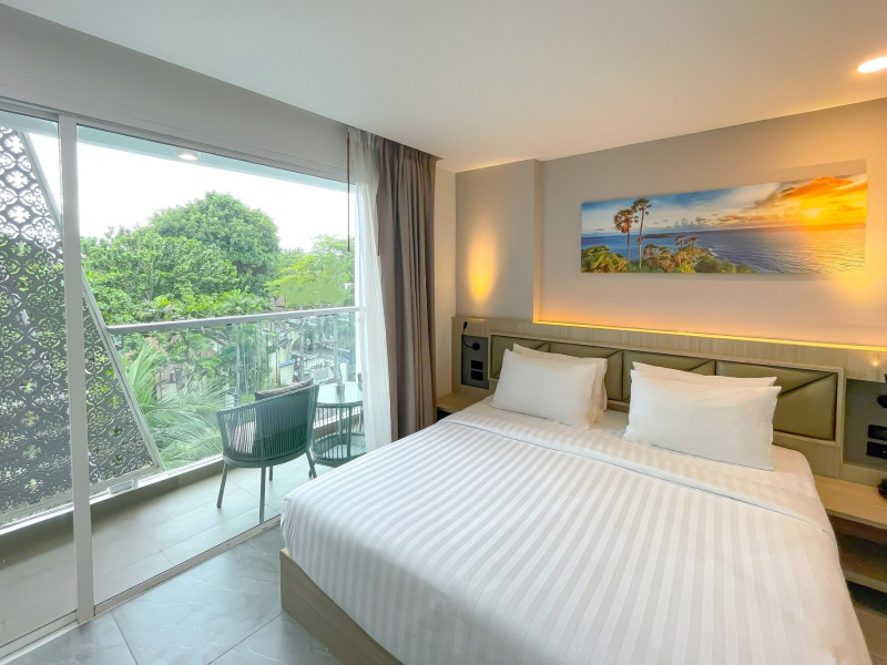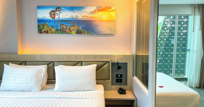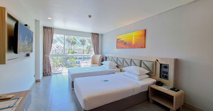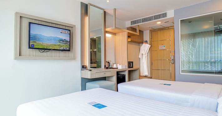Clarian Hotel Beach Patong, located in the heart of Patong on Phuket's west coast, offers a mix of modern design and natural elements. It is a short walk from Patong Beach and Bangla Road. The hotel features air-conditioned rooms with minibars, Smart TVs, memory foam beds with Frette Italian sheets, digital programming, smart speakers, and complimentary Wi-Fi. Bathrooms include showers with rainfall showerheads and complimentary toiletries. Guests can enjoy two outdoor swimming pools, a health club, and a sauna. Dining options include two restaurants, a coffee shop/cafe, a bar/lounge, and a swim-up bar. Buffet breakfast is available. Additional amenities include a 24-hour business center, concierge services, dry cleaning/laundry services, and airport/bus station shuttle services (surcharge). Nearby attractions include Patong Beach, Bangla Road, and Jungceylon Shopping Center. Phuket International Airport is approximately 32-35 km away. The Clarian Hotel Beach Patong is a hotel.