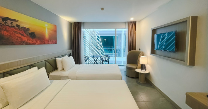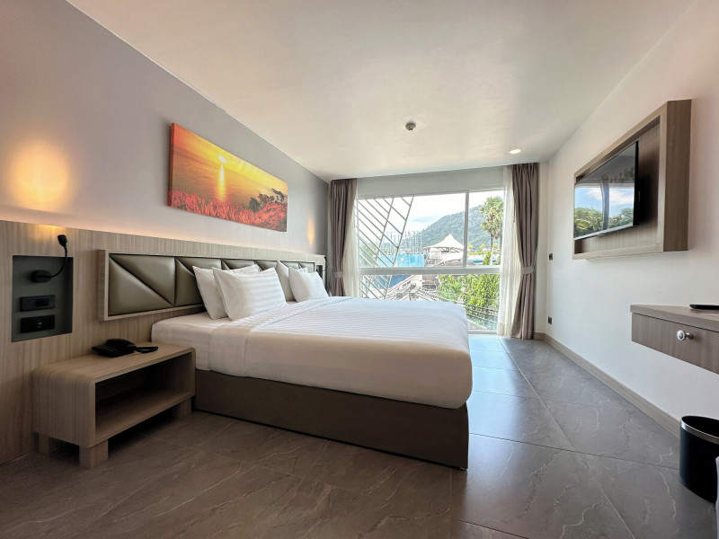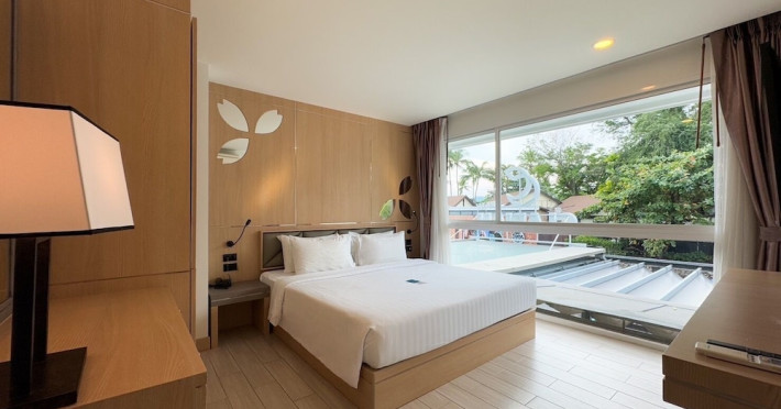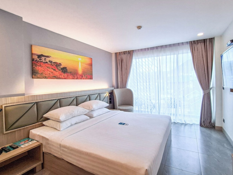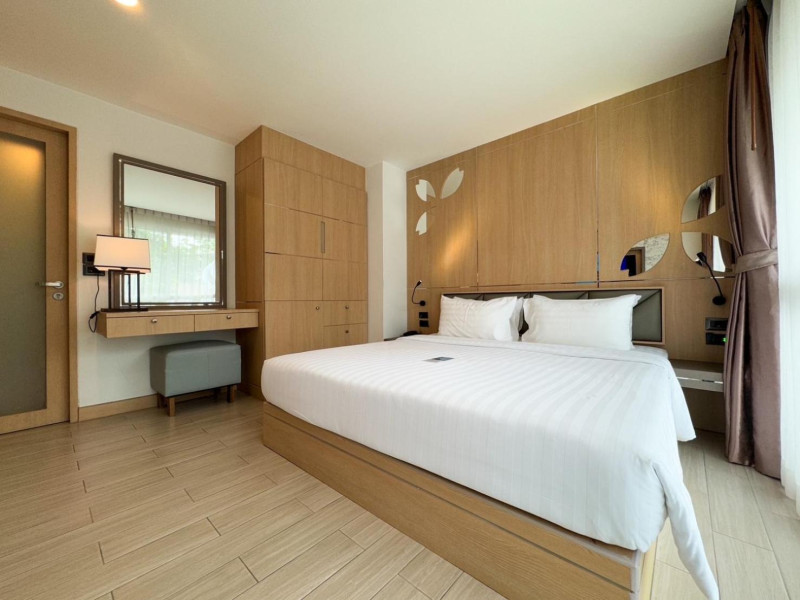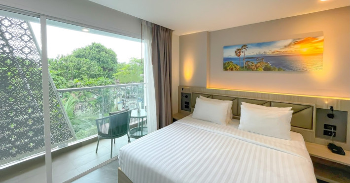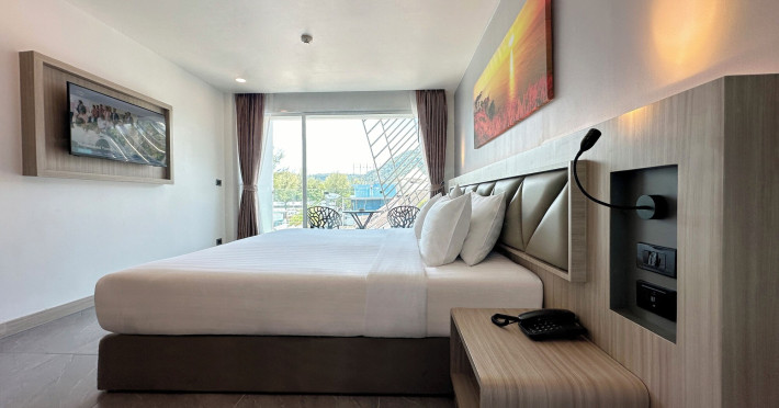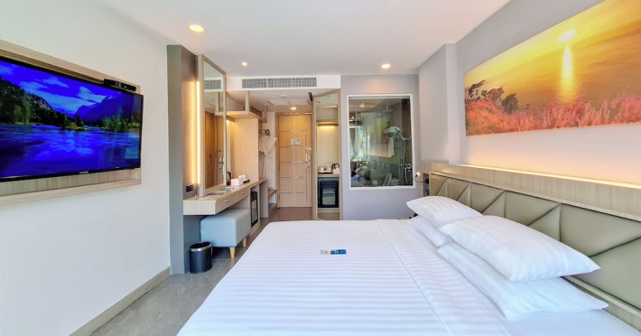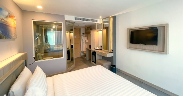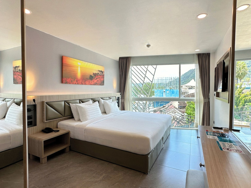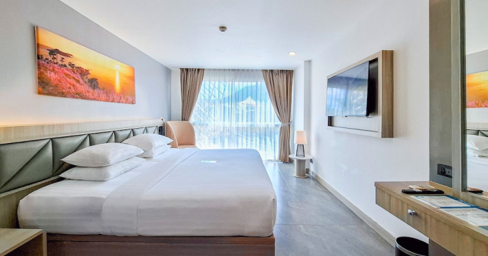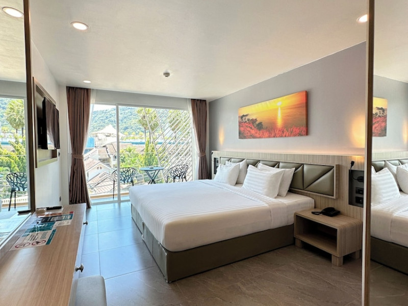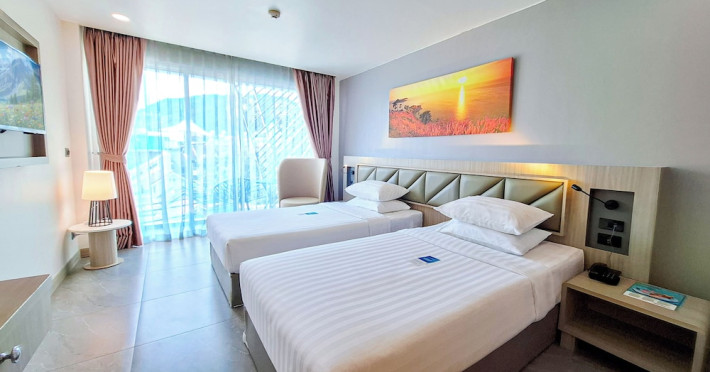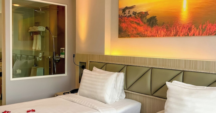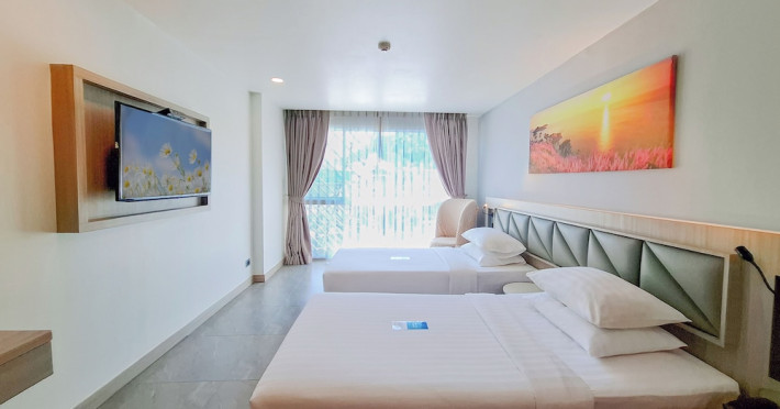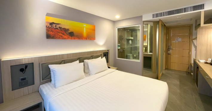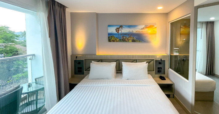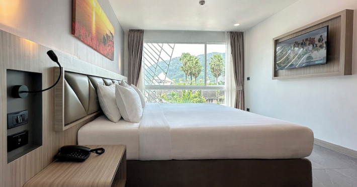 Clarian Hotel Beach Patong, located in the heart of Patong on Phuket's west coast, offers a mix of modern design and natural elements. It is a short walk from Patong Beach and Bangla Road. The hotel features air-conditioned rooms with minibars, Smart TVs, memory foam beds with Frette Italian sheets, digital programming, smart speakers, and complimentary Wi-Fi. Bathrooms include showers with rainfall showerheads and complimentary toiletries. Guests can enjoy two outdoor swimming pools, a health club, and a sauna. Dining options include two restaurants, a coffee shop/cafe, a bar/lounge, and a swim-up bar. Buffet breakfast is available. Additional amenities include a 24-hour business center, concierge services, dry cleaning/laundry services, and airport/bus station shuttle services (surcharge). Nearby attractions include Patong Beach, Bangla Road, and Jungceylon Shopping Center. Phuket International Airport is approximately 32-35 km away. The Clarian Hotel Beach Patong is a hotel.