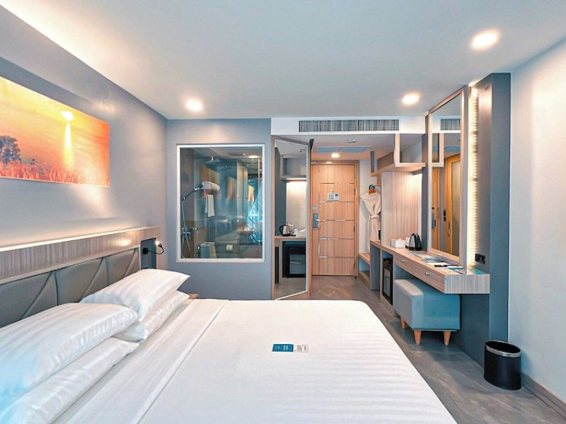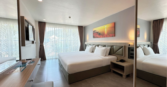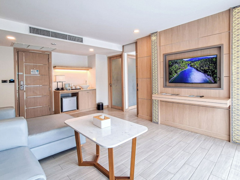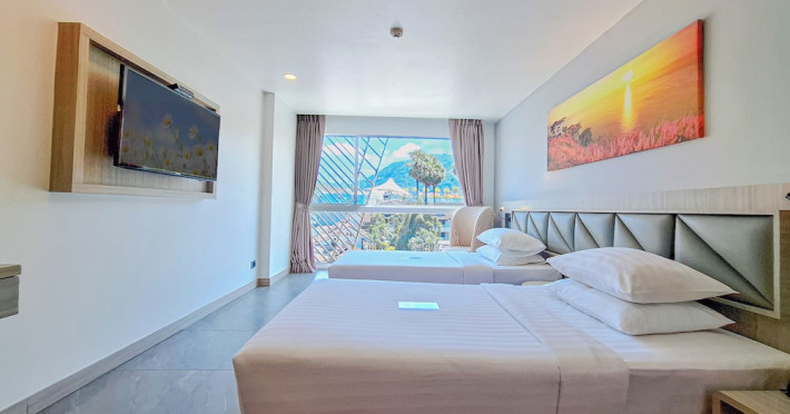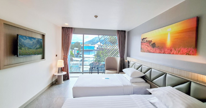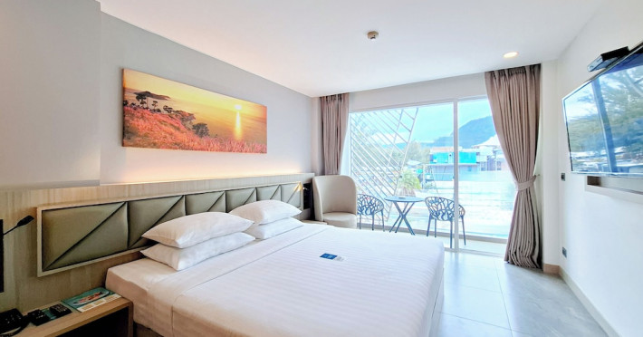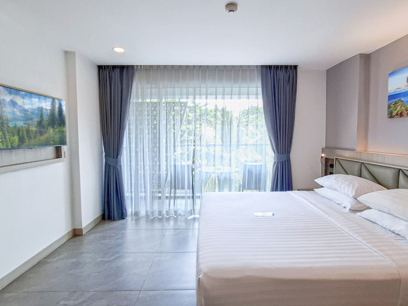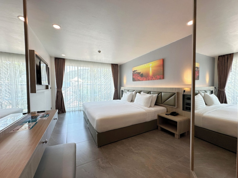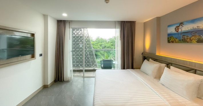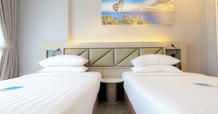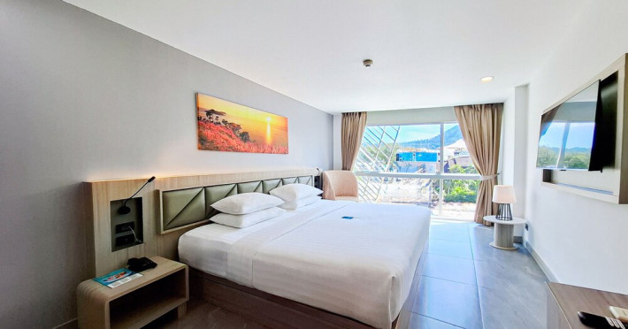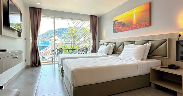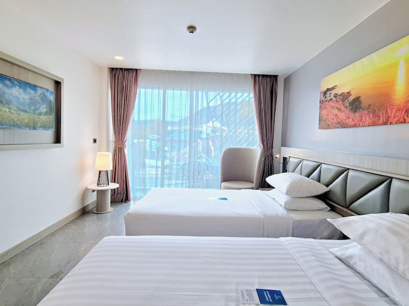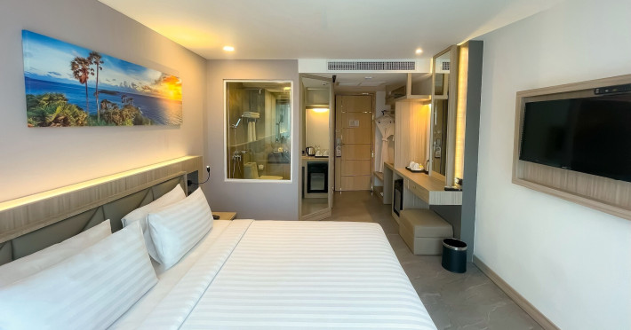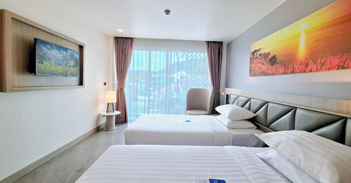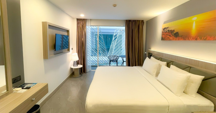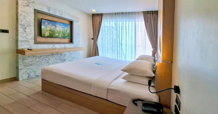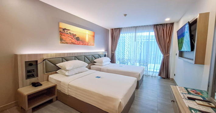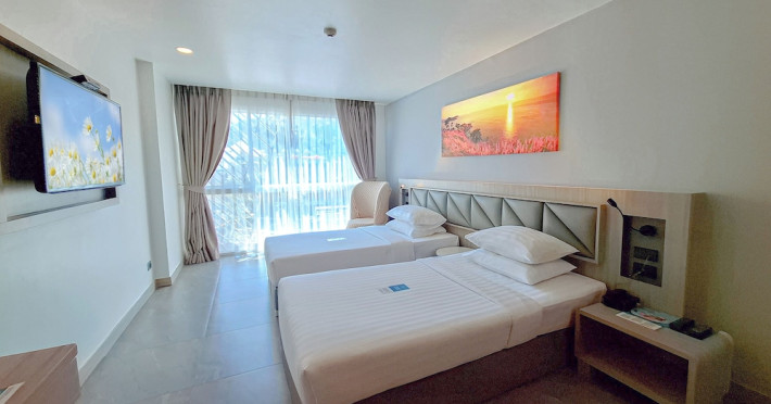 Clarian Hotel Beach Patong, located in the heart of Patong on Phuket's west coast, offers a mix of modern design and natural elements. It is a short walk from Patong Beach and Bangla Road. The hotel features air-conditioned rooms with minibars, Smart TVs, memory foam beds with Frette Italian sheets, digital programming, smart speakers, and complimentary Wi-Fi. Bathrooms include showers with rainfall showerheads and complimentary toiletries. Guests can enjoy two outdoor swimming pools, a health club, and a sauna. Dining options include two restaurants, a coffee shop/cafe, a bar/lounge, and a swim-up bar. Buffet breakfast is available. Additional amenities include a 24-hour business center, concierge services, dry cleaning/laundry services, and airport/bus station shuttle services (surcharge). Nearby attractions include Patong Beach, Bangla Road, and Jungceylon Shopping Center. Phuket International Airport is approximately 32-35 km away. The Clarian Hotel Beach Patong is a hotel.