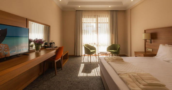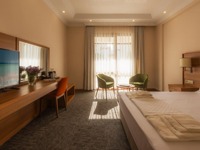 In the vicinity of the sandy beach is located the aparthotel Club Marma Hotel. There is a shuttle between the hotel and the airport (for a fee). On the beach are sun loungers, cushions and beach towels available. Cold drinks are served at the bar on In the vicinity of the sandy beach is located the aparthotel Club Marma Hotel. There is a shuttle between the hotel and the airport (for a fee). On the beach are sun loungers, cushions and beach towels available. Cold drinks are served at the bar on the beach. The seasonally air-conditioned hotel has a 24h reception (check-in is possible around the clock), a lobby, Wi-Fi, internet access, a first aid kit, parking spaces (limited) as well as a TV lounge with satellite TV. In the outdoor area you will find a garden as well as a pool that is open seasonally, where pool towels are available for free. For children there is also a separate childrens pool. You can store your valuables in the safe, and your luggage in the hotels storage room. In addition, the hotel Club Marma Hotel is video-monitored 24h a day. For very young guests, kids chairs can be provided. There is also a laundry service available at an additional cost to customers. Ironing equipment can be rented at the hotel for a fee. For your comfort the hotel page will ensure you are looked after. If necessary, you can contact the medical centre (for a fee). The energy supply is 220 Volts. If you want to explore the holiday region, you can use the car rental service close to the hotel (extra fee). For guests on their honeymoon, the hotel has special offers such as a romantically-decorated room, special honeymoon packages, sparkling wine or a basket of fruit in the room. In your hotel, a lot of focus is placed on sustainability. This includes the hotels own recycling bins and the provision of soap, shampoo and lotion dispensers. Euro/Master Card and Visa are accepted as means of payment. Catering As catering services the hotel offers full board plus. Breakfast is offered from the buffet. Lunch and dinner are also served from the buffet. For the meals, there are a buffet restaurant and 2 bars. Distances Bus stop: approximately at 550 m Taxi rank: approximately at 1 km Sports amp; Leisure If you want to stay on the ball during your holidays, youll find an artificial turf football pitch and a basketball court. There is also the option to play billiards. Also beach volleyball is offered at the hotel. A tennis court (hard court) with floodlighting can also be used by hotel guests. Junior hotel guests can let off steam in the mini disco. In terms of adult entertainment, live music is presented on certain days. Additional information The hotel, newly built in 2019, has a total of 123 rooms. The hotel staff speak English and Turkish.