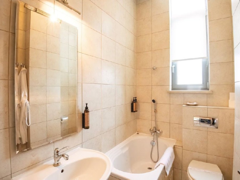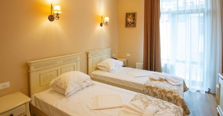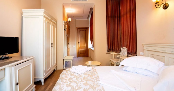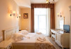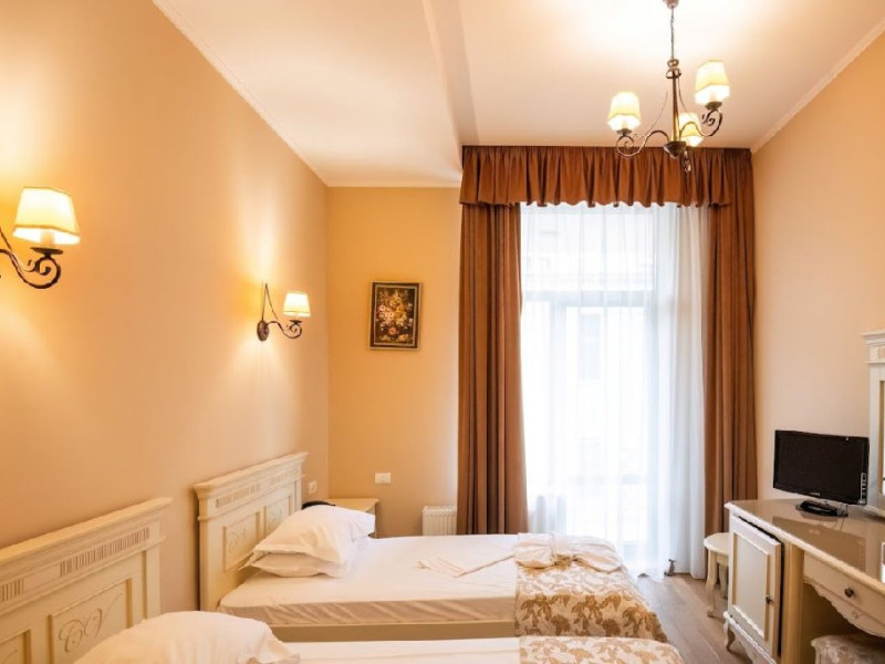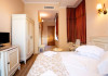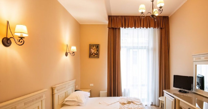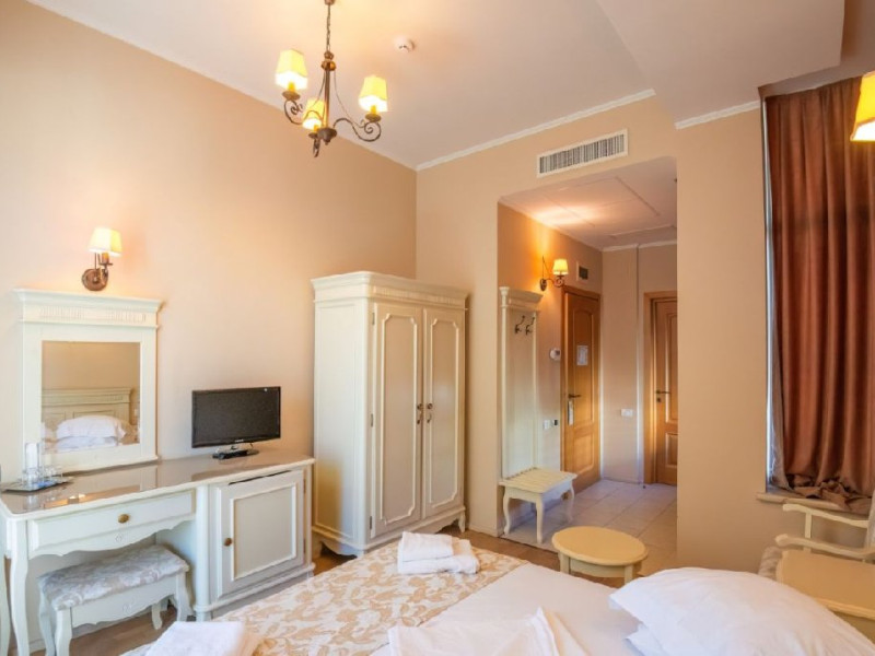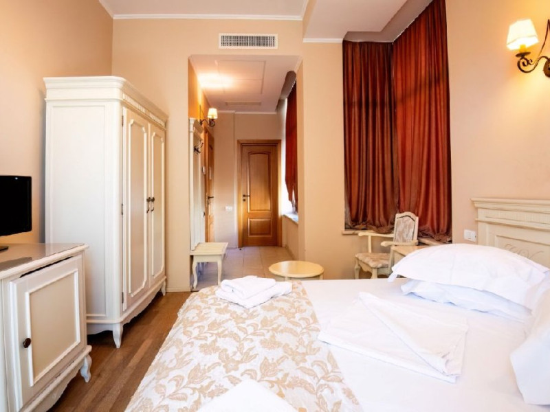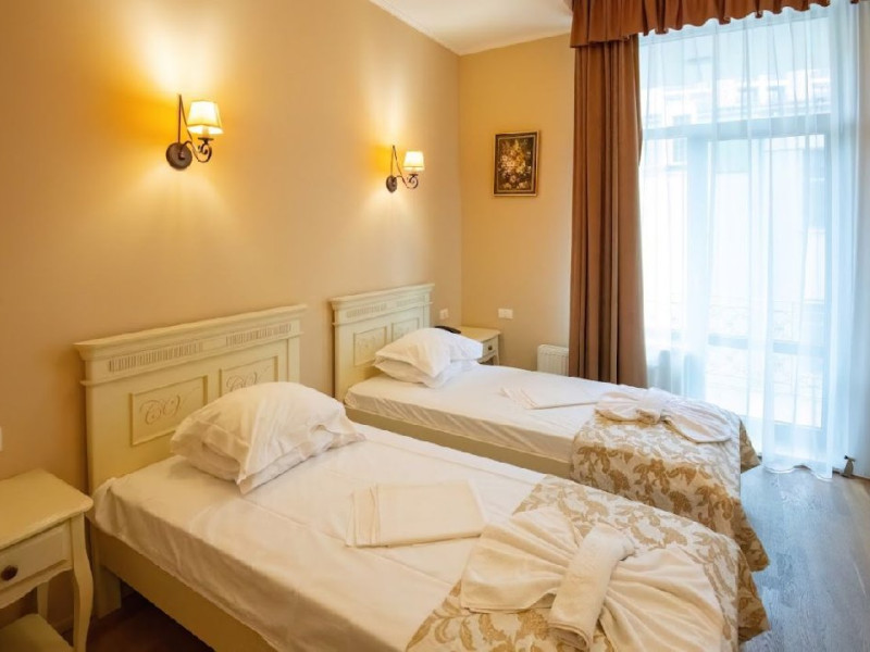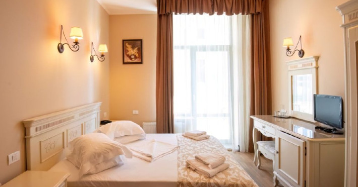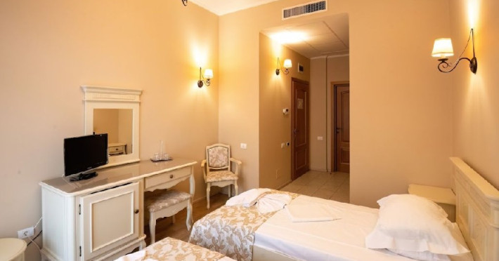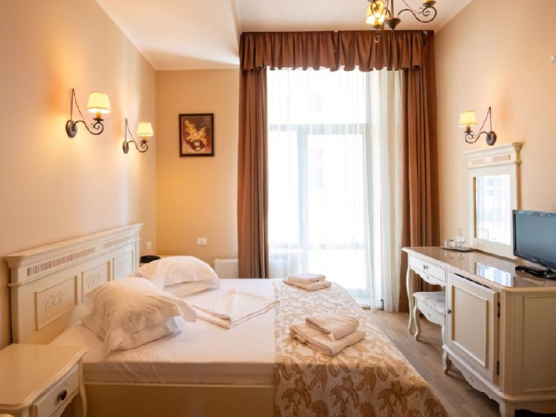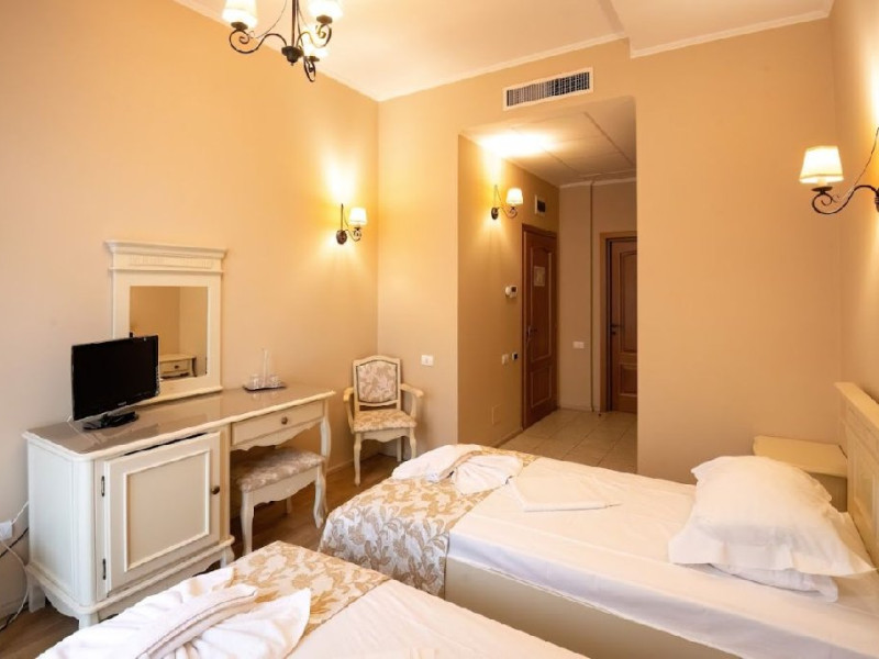 Dotari camere Toate camerele sunt generoase in spatiu si sunt dotate cu mobilier alb din lemn masiv, telefon, televizor LCD, cablu TV, internet wi fi, minibar, seif, baie proprie cu cada, uscator de par, cosmetice hoteliere, papuci, halat, sistem de climatizare, balcon, plase de tantari. Camerele duble matrimoniale au pat matrimonial (160x200) si au o suprafata de 27 mp. Camerele duble twin sunt dotate cu 2 paturi single (100x200) si au o suprafata de 22 mp.