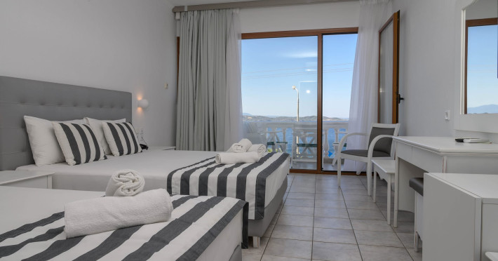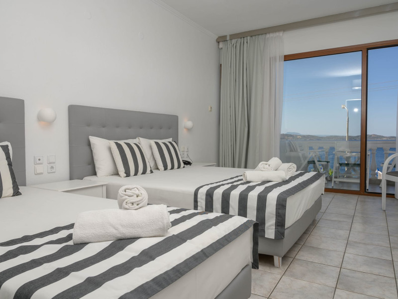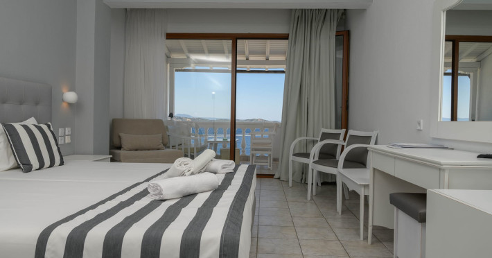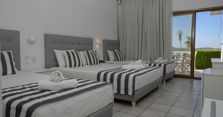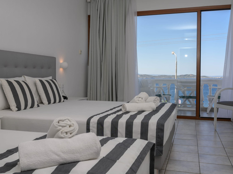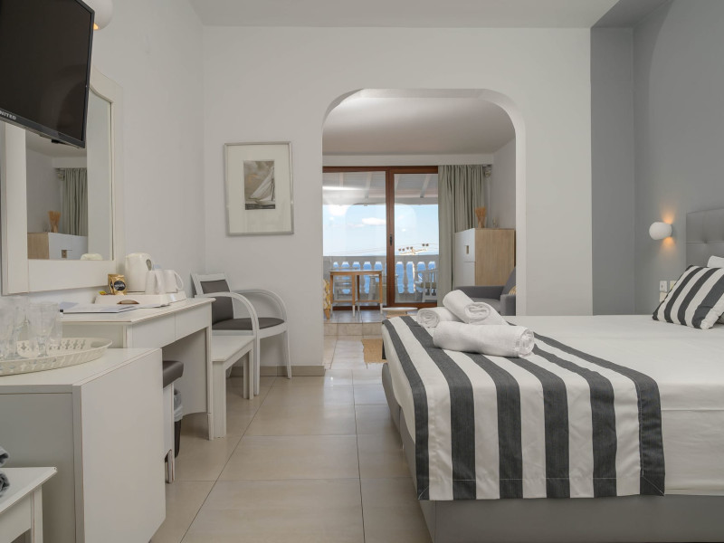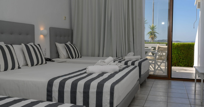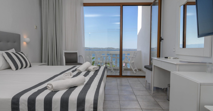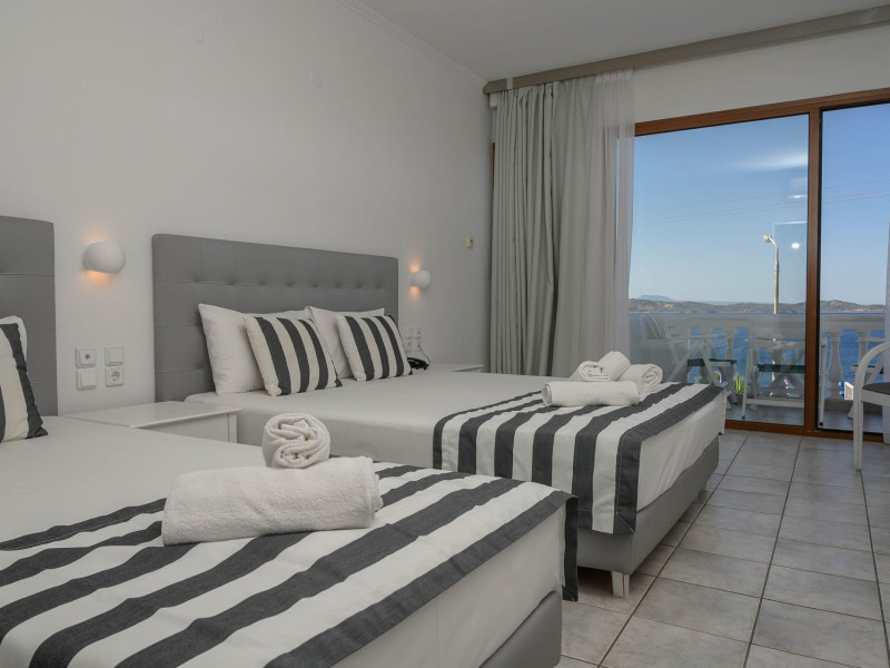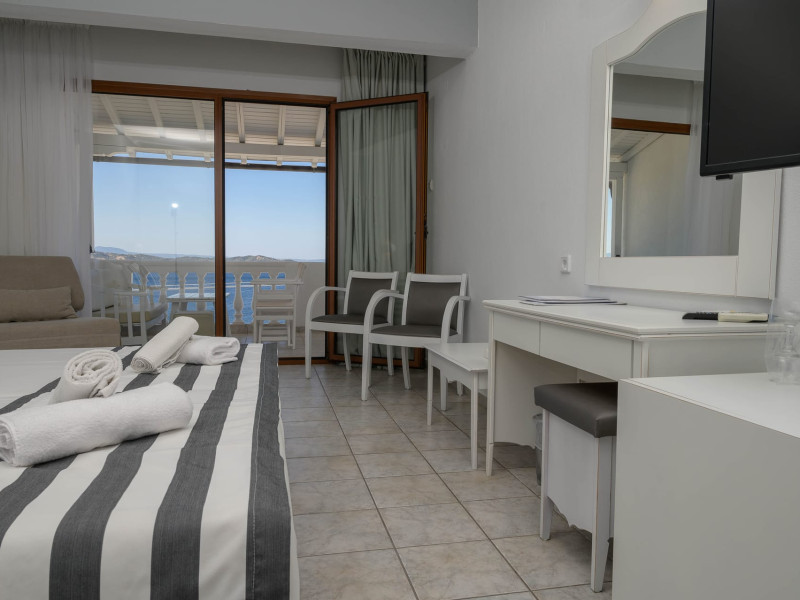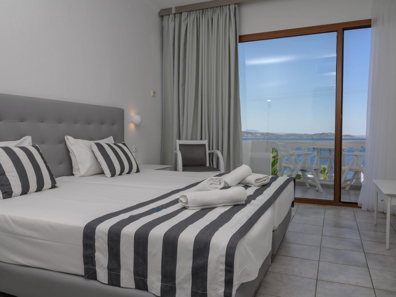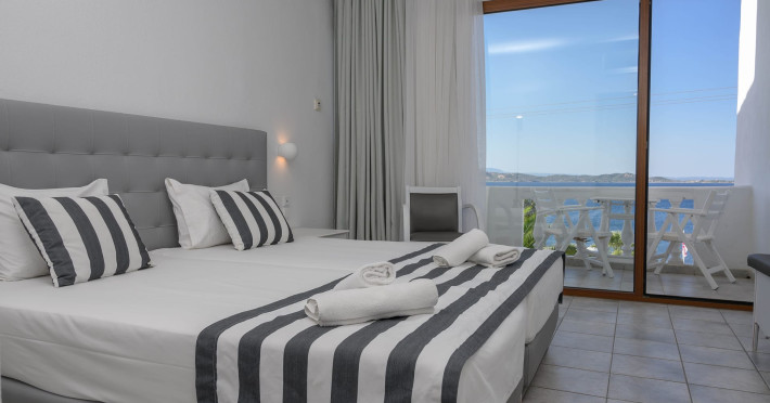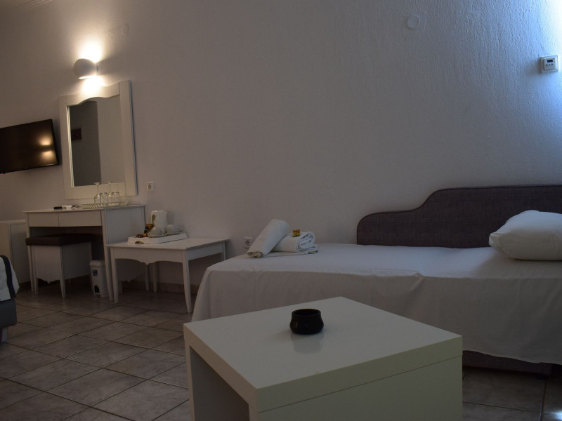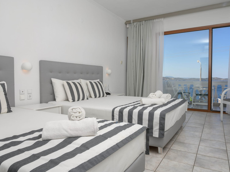 Hotelul dispune de 70 de camere ce sunt dotate cu aer conditionat (cu plata), TV telefon, frigider, uscator de par, balcon sau veranda cu vedere la mare, piscina sau gradina, pentru o vacanta reusita.