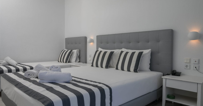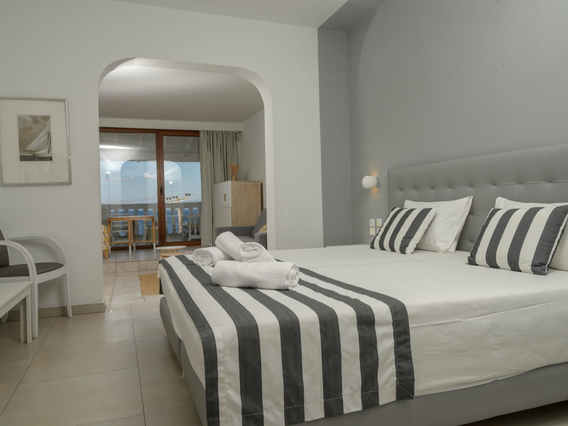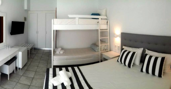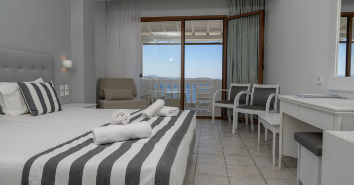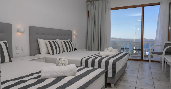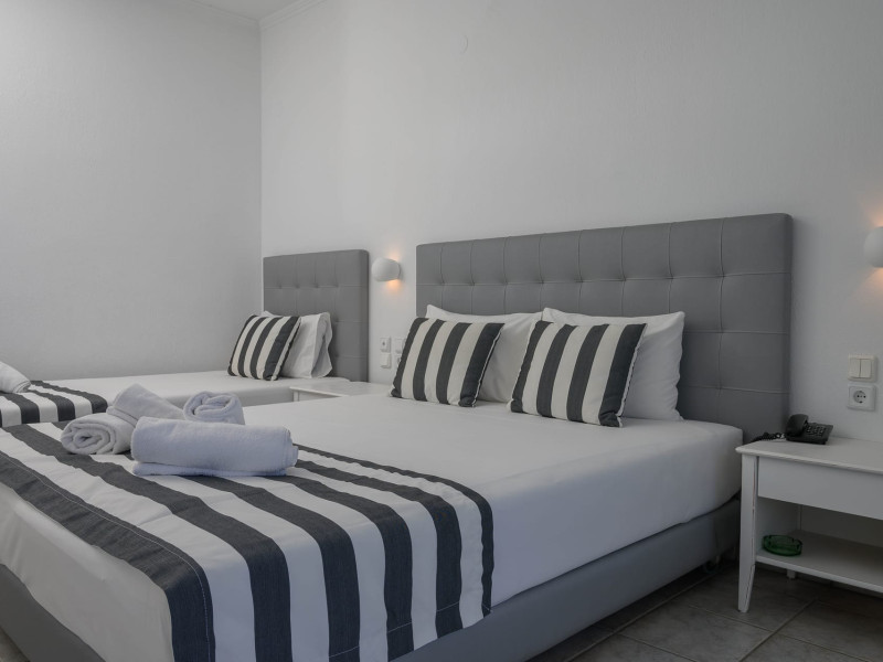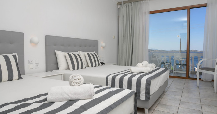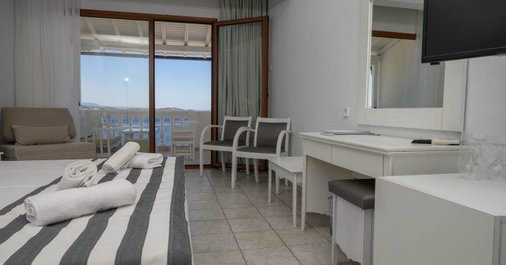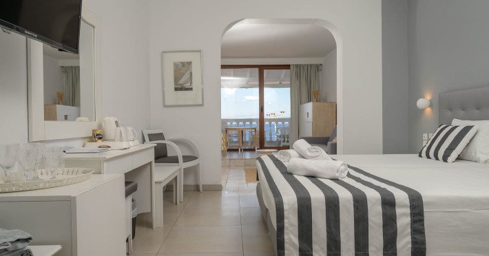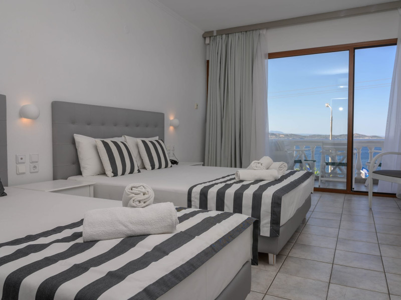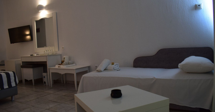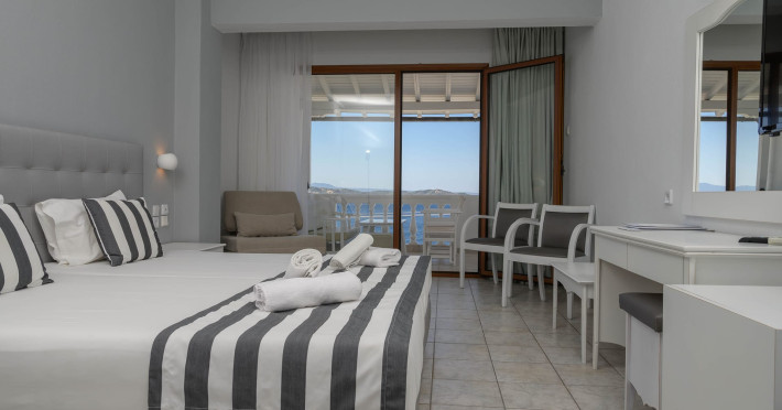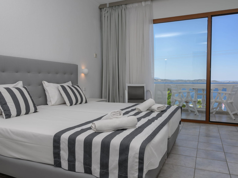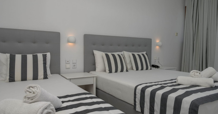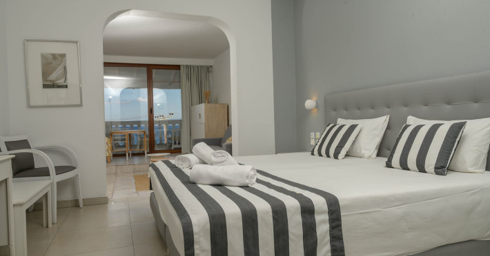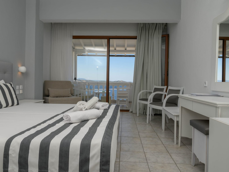 Hotelul dispune de 70 de camere ce sunt dotate cu aer conditionat (cu plata), TV telefon, frigider, uscator de par, balcon sau veranda cu vedere la mare, piscina sau gradina, pentru o vacanta reusita.