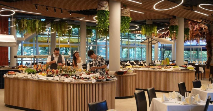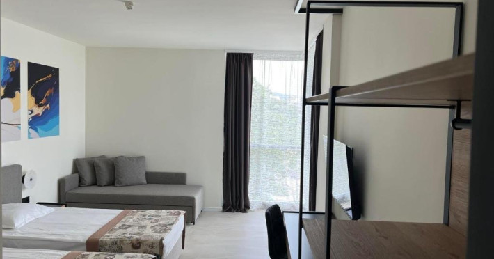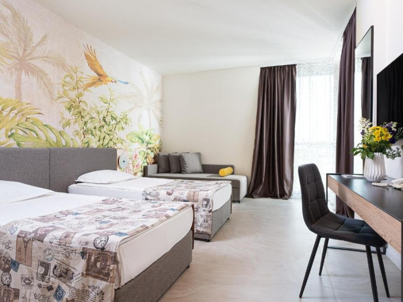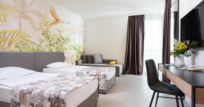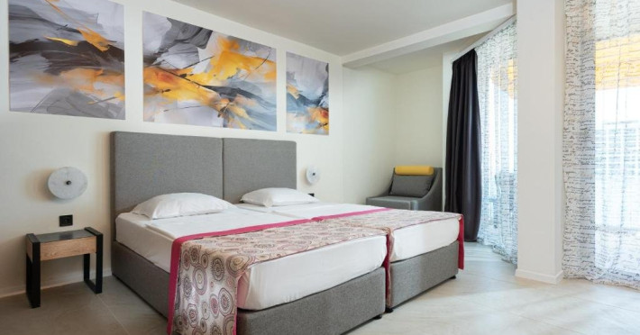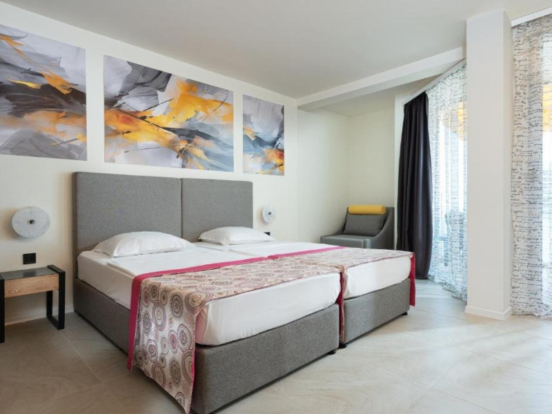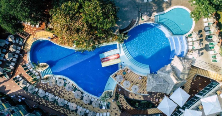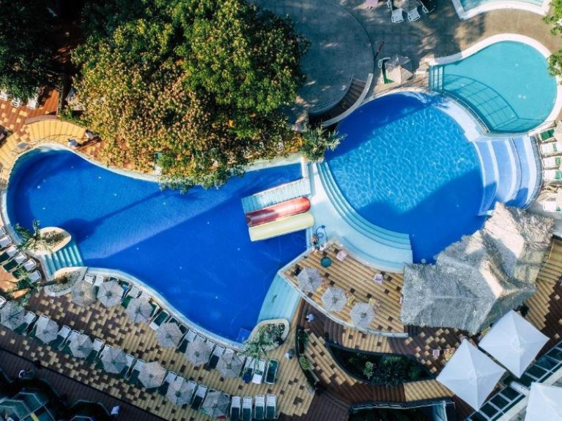 Mancare si bauturi: - Mic dejun tip bufet /07:30 - 10:00/ - restaurant principal - preparate calde si reci (paine, legume, carnati, paine prajita frantuzeasca), bauturi calde si nealcoolice - Gustare /10:00 - 16:00/ in Bistro bufet - sandvisuri, pizza, deserturi, bauturi nealcoolice si alcoolice locale - Pranz tip bufet /12:30 - 14:30/ - restaurant principal - preparate calde si reci, legume, supa, spaghete, deserturi, fructe, bauturi nealcoolice si alcoolice - Cafea si dulciuri /16:00 - 17:00/ - cafea, ceai, prajituri - Cina tip bufet /18:00 - 21:00/ - restaurant principal - bucatarie internationala si bulgareasca variata, deserturi, fructe, show-cooking, bauturi nealcoolice si alcoolice * De doua ori pe saptamana - bufet tematic. - Cina la restaurantul bulgaresc /19:00 - 21:00/ - preparate traditionale bulgaresti /gratuit o singura data pe durata sejurului/* * Rezervare in avans la fata locului. - Bar in hol /10:00 - 23:00/ - bauturi alcoolice si racoritoare locale - Daiquiri Bar /10:00 - 17:00/ - bauturi alcoolice si racoritoare locale - Bar la piscina /10:00 - 17:00/19:30 - 23:00/ - bauturi alcoolice si racoritoare locale - Bar pe plaja /09:00 - 17:00/ - apa, bauturi racoritoare, bere, cafea Sport si divertisment: Sezlonguri si umbrele PE PLAJA /in functie de disponibilitate/ 2 piscine in aer liber (2 cu tobogane cu apa) cu terase insorite cu sezlonguri cu saltele si umbrele de soare prosoape pentru piscina si plaja /contra depozit/ Piscina interioara/neincalzita/ Cinematograf in aer liber si scena in aer liber pentru programe de animatie si spectacol Fitness Tenis de masa Mini frigider in camera (gol) - poate fi folosit de la oaspeti Wi-Fi in hol si in toate camerele Animatie sportiva de zi - sageti cu minge de apa gimnastica boccia shuffleboard si alte jocuri distractive pentru adulti si copii. Program de spectacol de seara de 6 ori pe saptamana Loc de joaca sportiva pentru volei