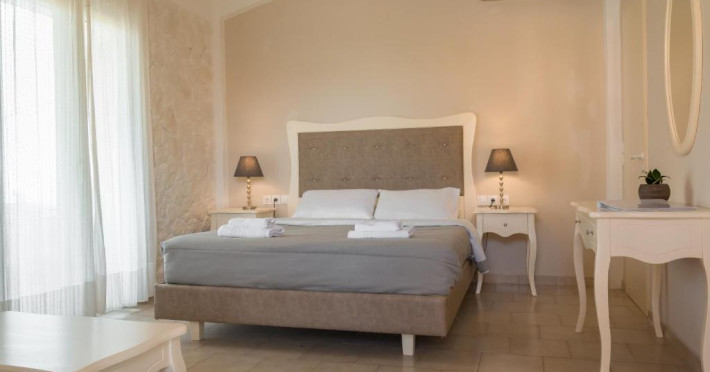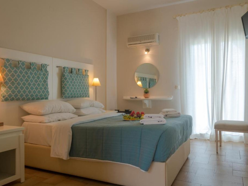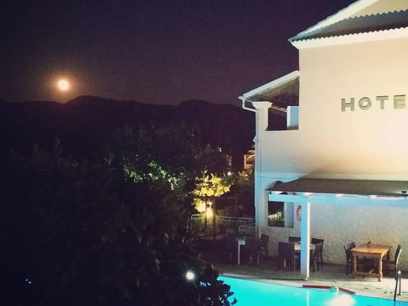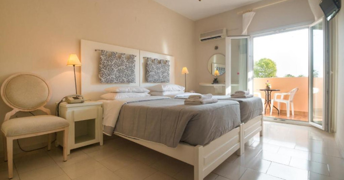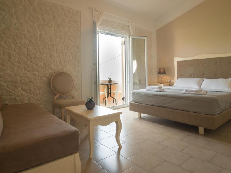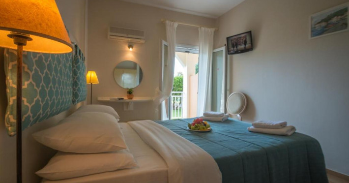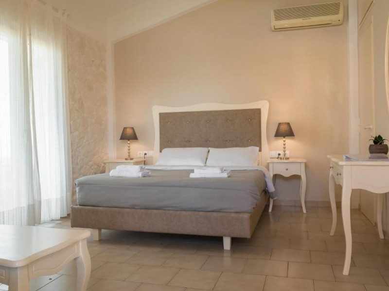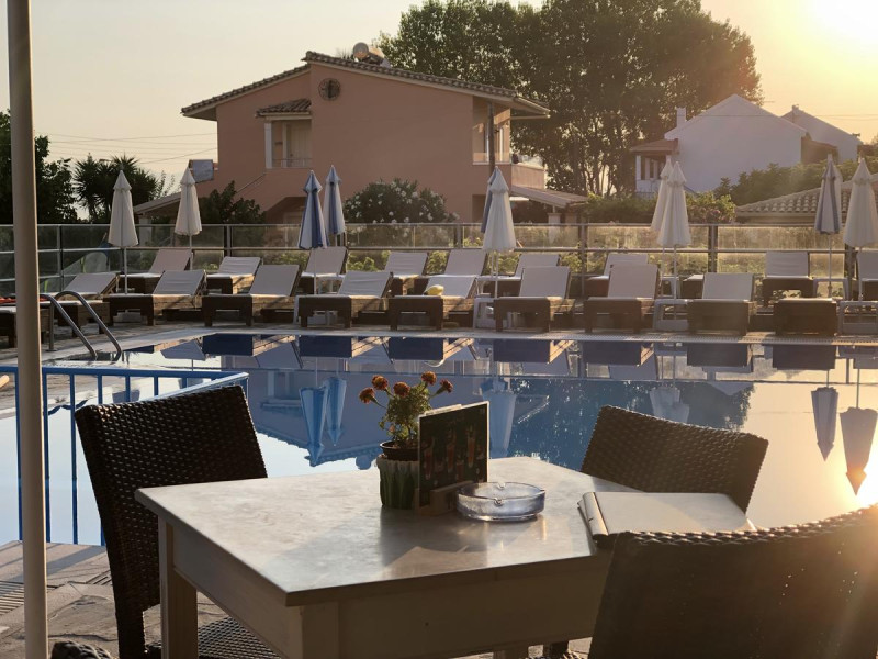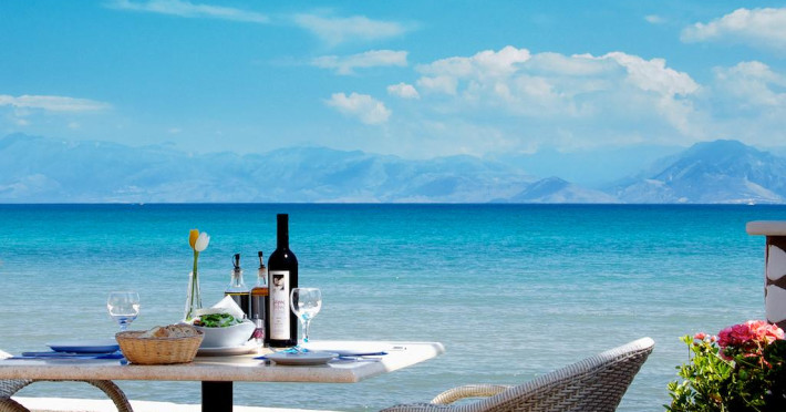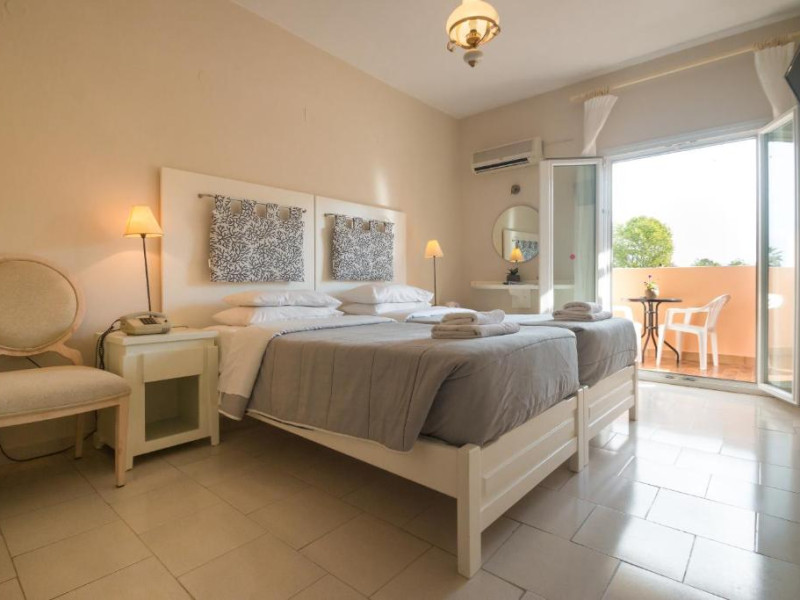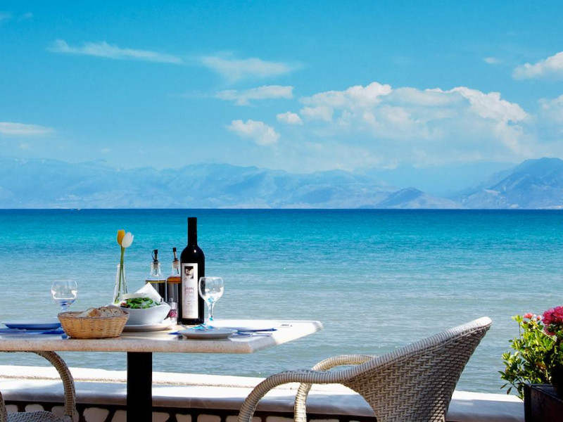 The Hotel overlooks both the sparkling blue waters of the Ionian Sea that separates Corfu from the taupe, coastal mountains of the Greek Mainland and Albania and the hills covered with olive trees.