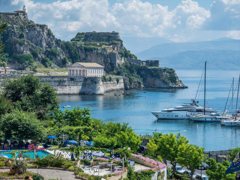 Garitsa Bay and the old fortress of Corfu. Relax in our outdoor swimming pool
