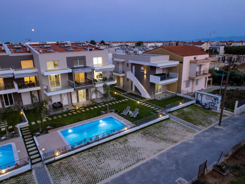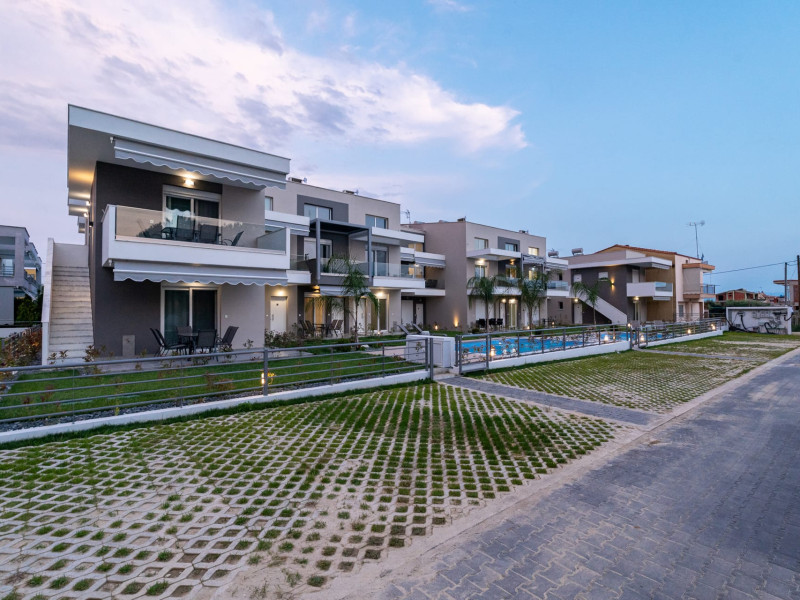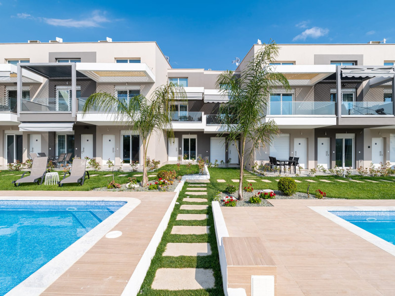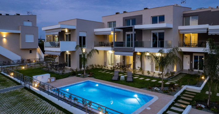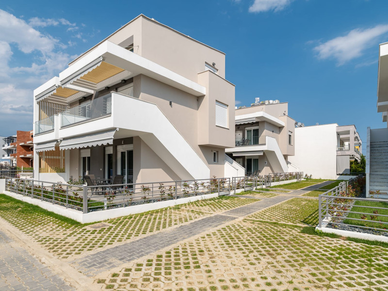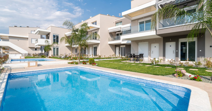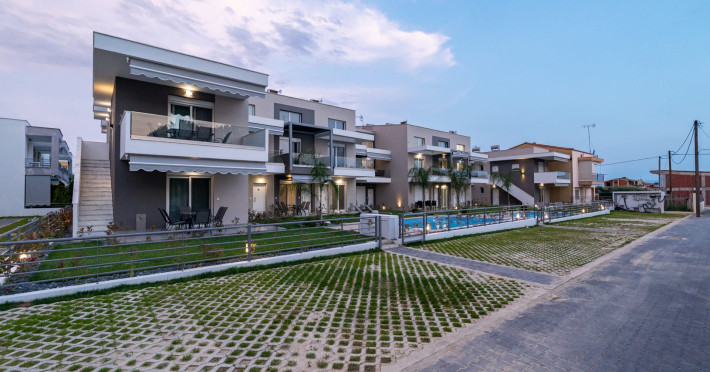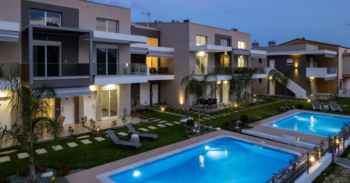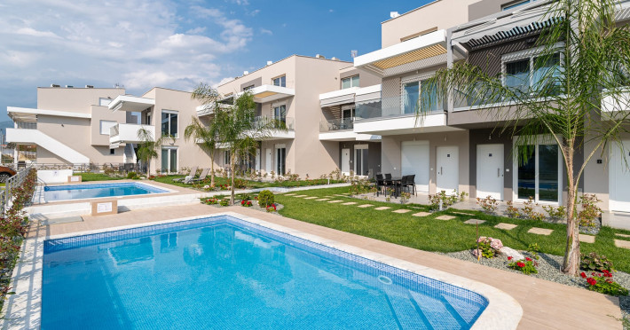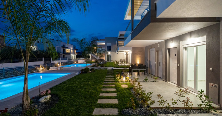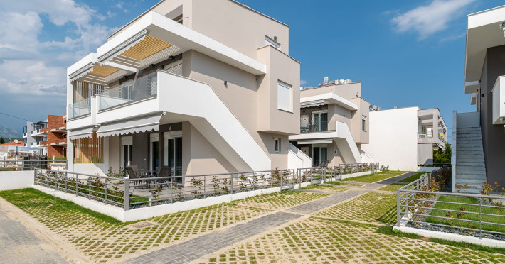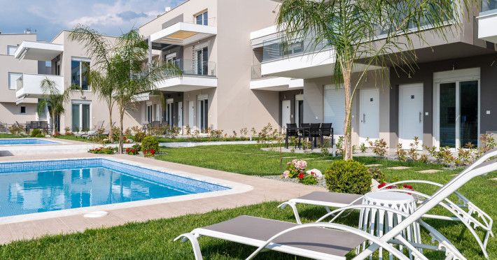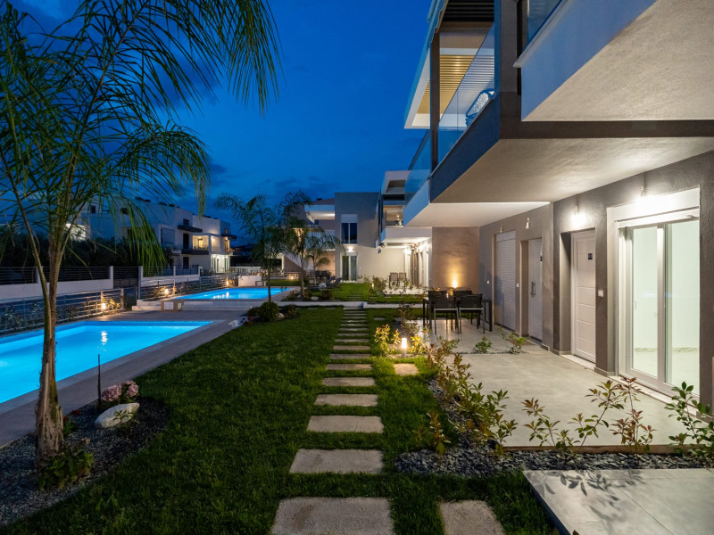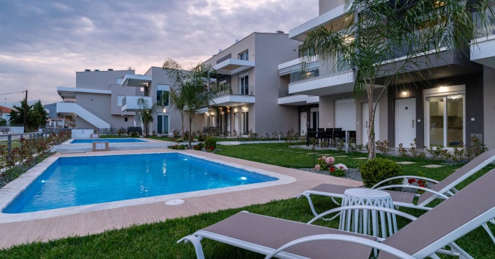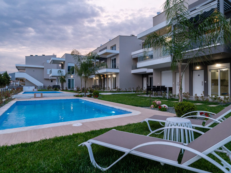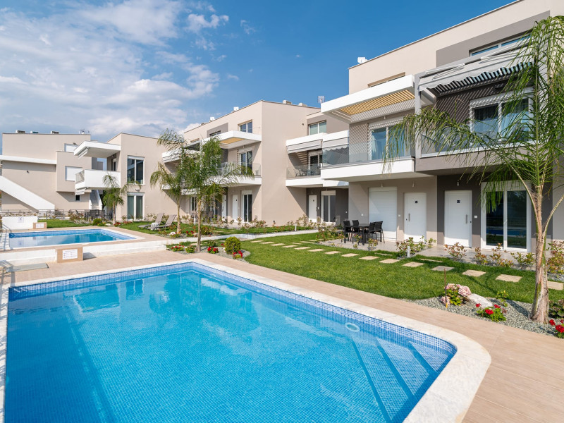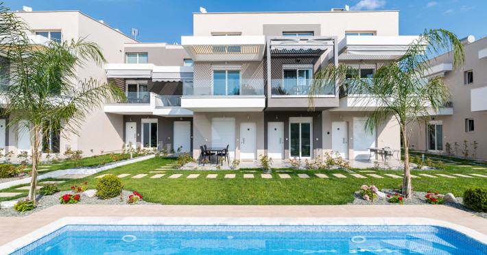 The one-bedroom apartments of the complex are a breath away from the beach, with a view that combines mountain and sea. Modern and minimalistic residences very close to the main pedestrian street and shops. The common pools and the green landscaped gardens centered within the complex offer unique moments of carefreeness combining nature and relaxation!