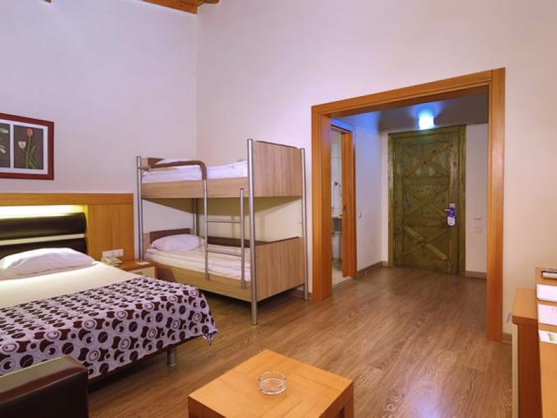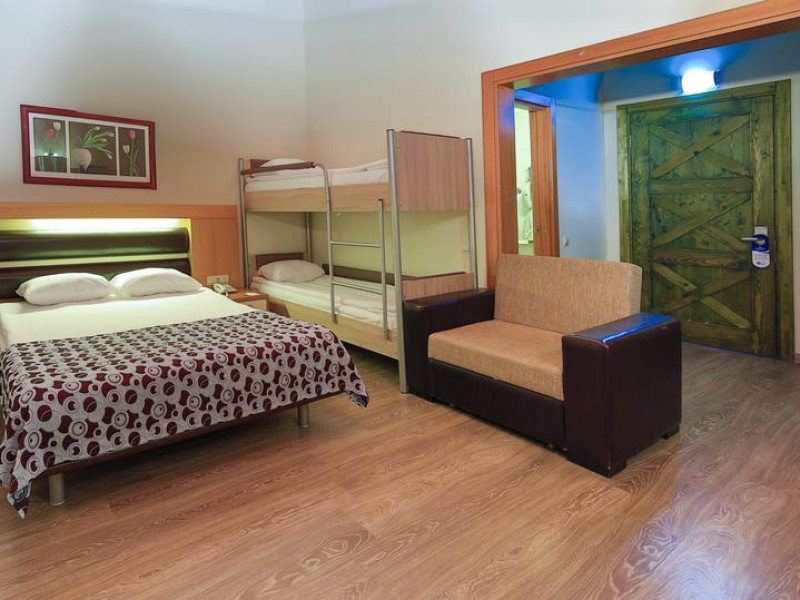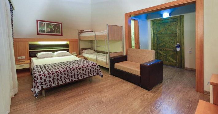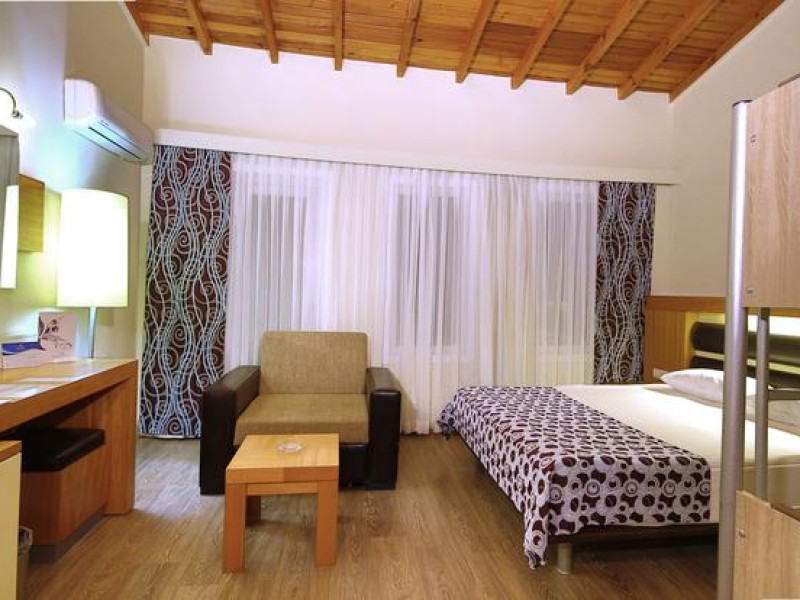 Hotelul are numar total de 521 camere localizate in bungalow-uri a cate 3 etaje: camere standard incluzand si 6 camere pentru persoane cu dizabilitati (19mp, un dormitor, o baie, max 2 pax, nu exista spatiu pentru baby cot), camere standard Big (21-26mp, un dormitor, o baie, max 3 pax), camere standard cu paturi suprapuse (26mp, un dormitor cu pat matrimonial si paturi suprapuse, max 2+2pax), camere family (37mp, doua dormitoare cu usa intre ele, o baie, max 4pax), camere family cu paturi suprapuse (37mp, doua dormitoare, un dormitor cu pat matrimonial si intr-un dormitor paturi suprapuse, usa intre camere, o baie, max 2+3pax). Toate camerele sunt dotate cu baie privata cu cabina de dus si uscator de par, aer conditionat split, telefon direct, mini bar (bauturi racoritoare realimentat zilnic), seif, LCD TV prin satelit si canale de muzica, balcon sau terasa, parchet laminat, conexiunea internet WI-FI este disponibila gratuit in anumite camere.