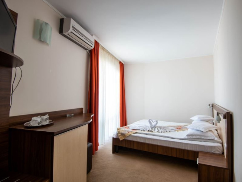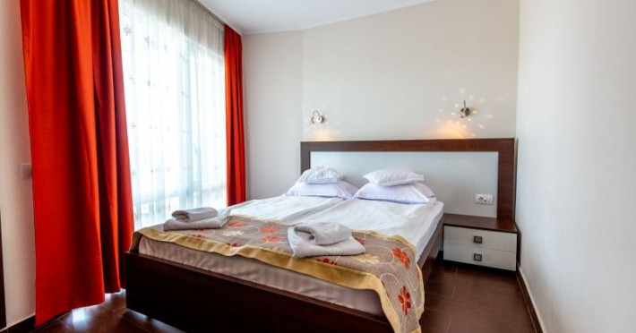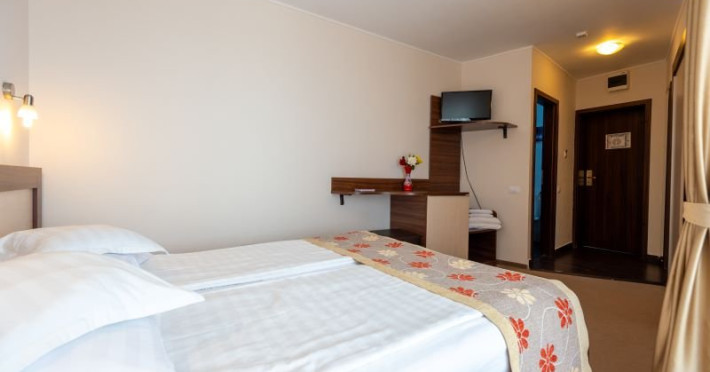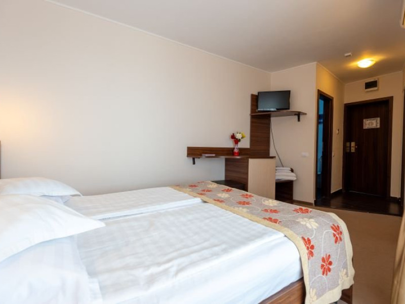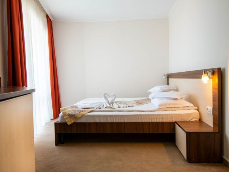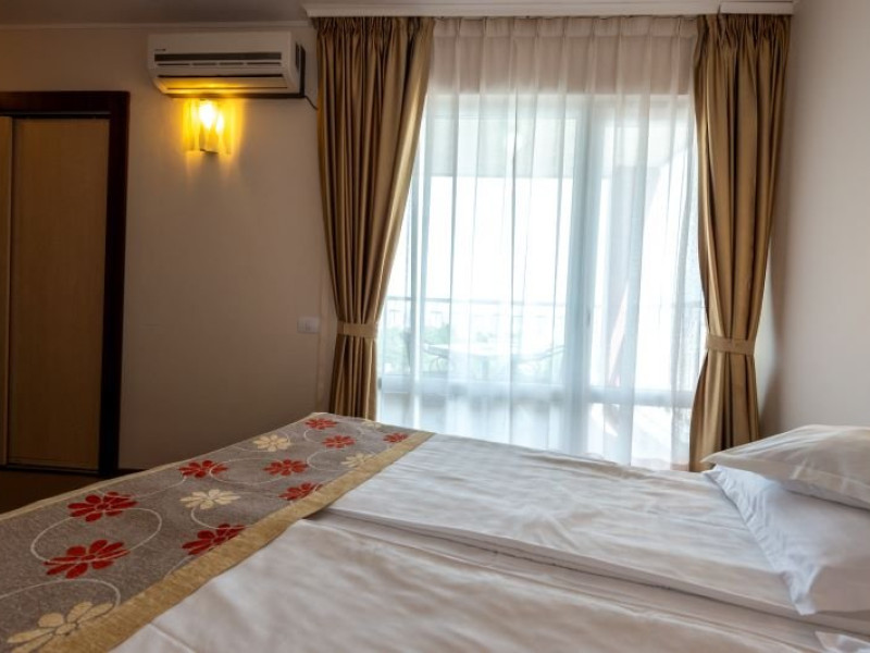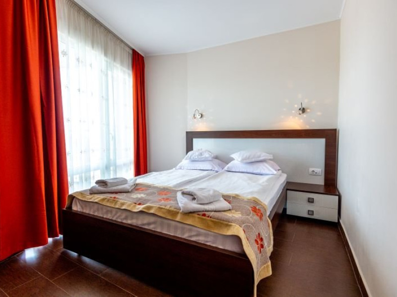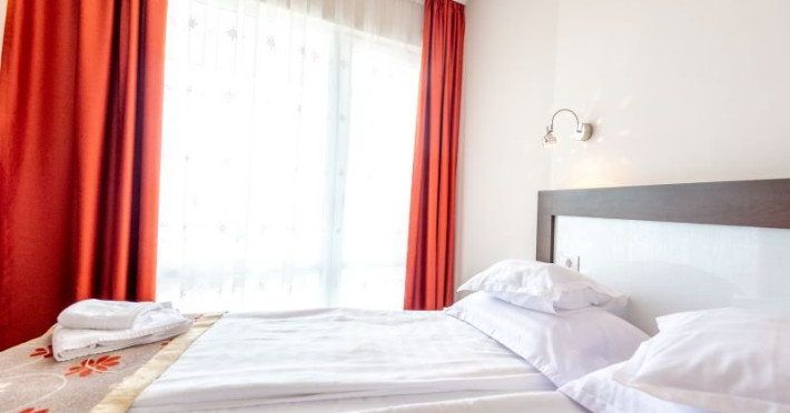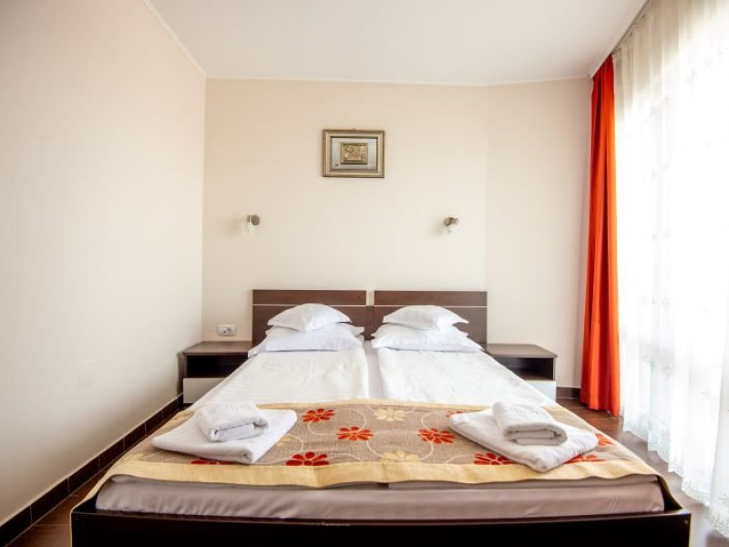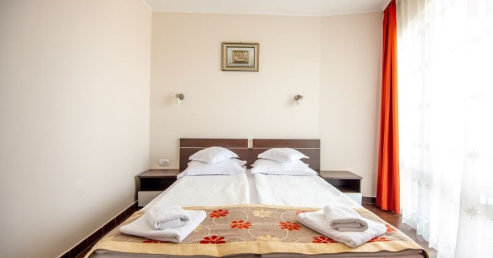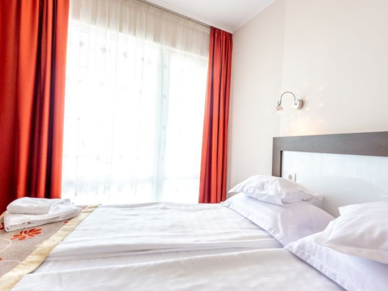 Patutul pentru bebelus este de tipul tarc pliabil cu plasa, are suprafata interioara de 60x120cm si se ofera gratuit la cerere. Patul suplimentar extensibil are dimensiunea de 80x180cm si se taxeaza indiferent de varsta beneficiarului. Va rugam sa aveti in vedere ca spatiul de manevra din camera poate fi astfel redus. Camera si balconul au suprafata aproximativa de 18 mp si sunt dotate cu pat dublu (160x200cm) sau 2 paturi twin (90x200cm fiecare).